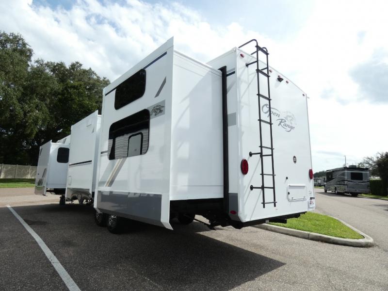 With any Highland Ridge Open Range travel trailer, the 100" wide body frame and the ACCU-SLIDE slide system with 42" deep 4-corner compression offer more interior space. Inside, you will also enjoy residential vinyl flooring, hardwood cabinet doors, and two air conditioners with quiet residential return air. The exterior equipment includes Equa-Flex axle suspension, self-adjusting electric brakes, and the Norco 5.1 stabilizer system with BAL lock arms. You will also enjoy the Four Season package that offers ducted heat to underbelly with cold air return, an enclosed exterior docking station, a heated and enclosed underbelly, and a high performance furnace to mention a few highlights.