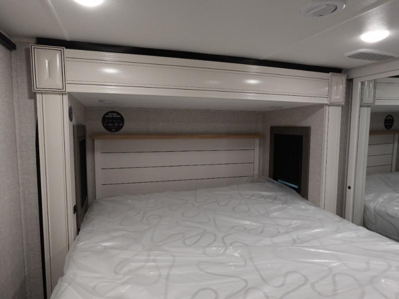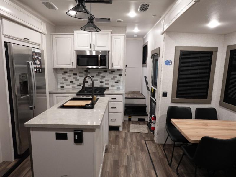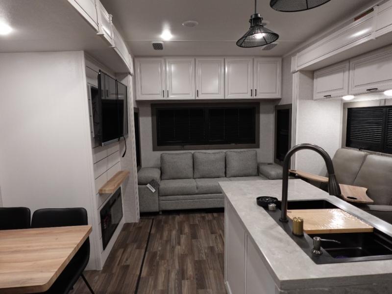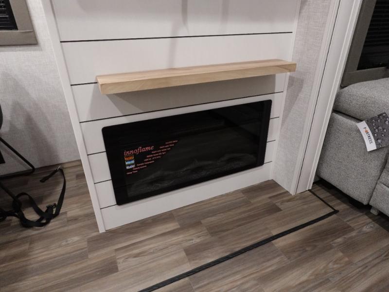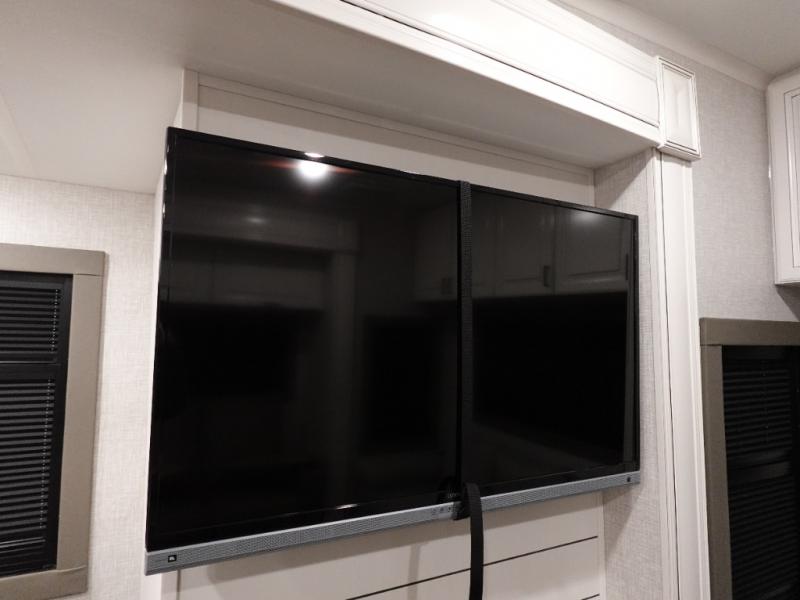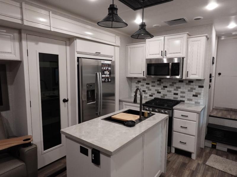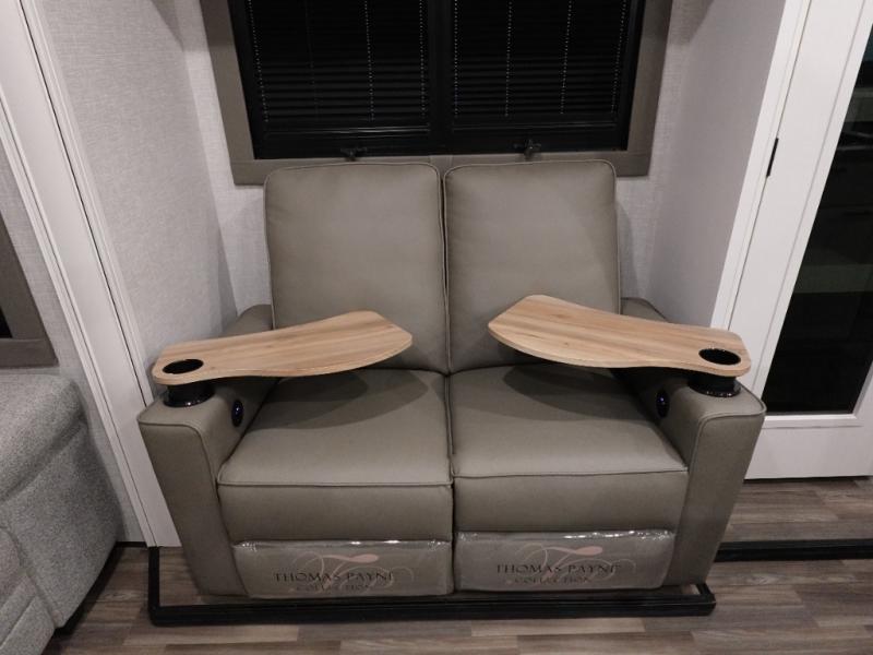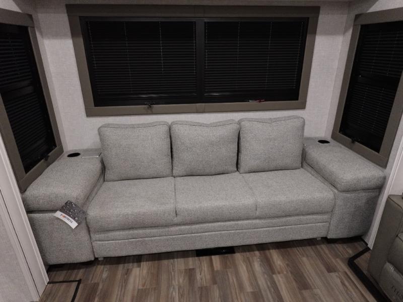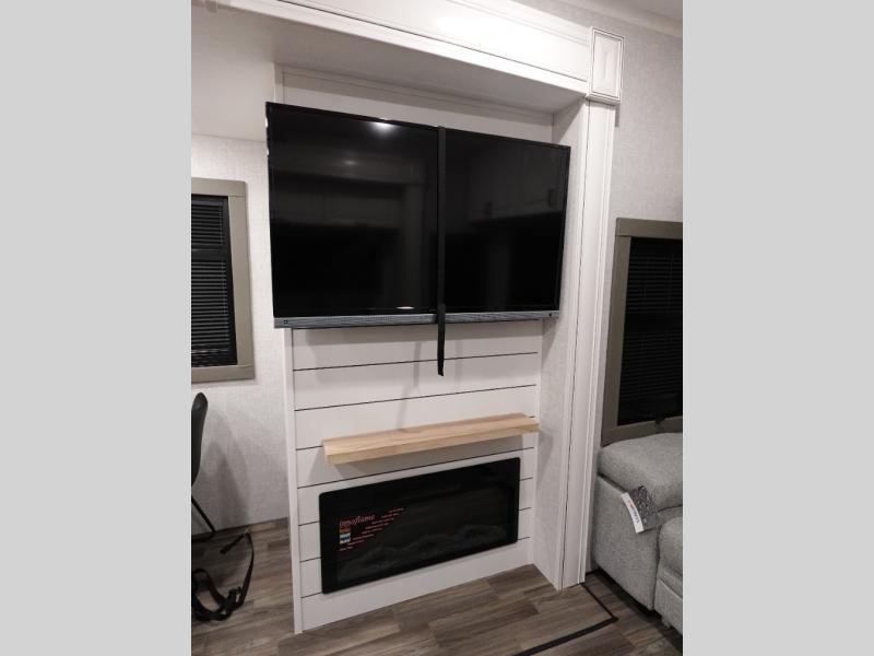 You will love the great space and layout in this amazing fifth wheel! The rear living area features theater seats as well as a tri-fold sofa with adjustable headrests. It's the perfect place to watch a movie on the 40" Smart TV located in the entertainment center with fireplace! The kitchen includes a full suite of GE residential appliances, including a 4-burner range, 21 cu. ft. refrigerator, and over-the range microwave. Also standard are a dishwasher and central vacuum system so cleaning up is easy! At night retire to the bedroom with its king bed with power base. A second TV lets you watch your favorite shows as you fall asleep. Storage abounds including a full wardrobe and dresser with pull-out top. A dual-entry full bath is easily accessible and includes even more storage with a linen closet!