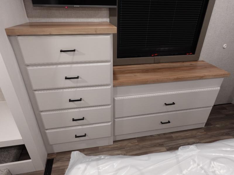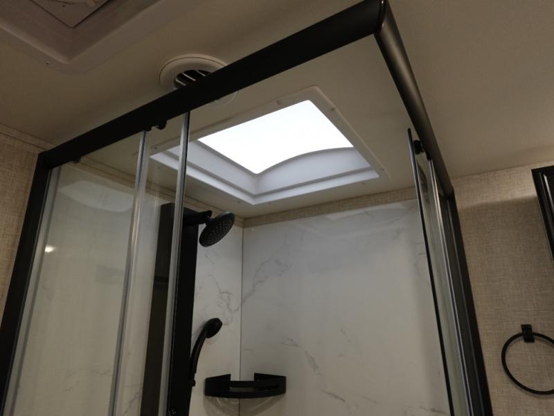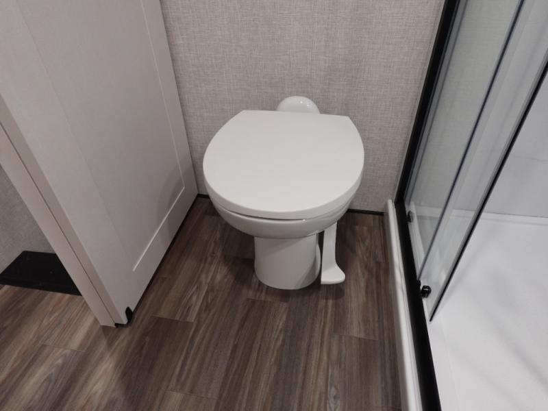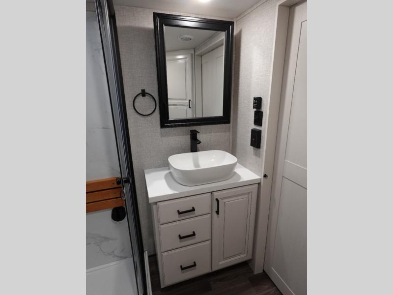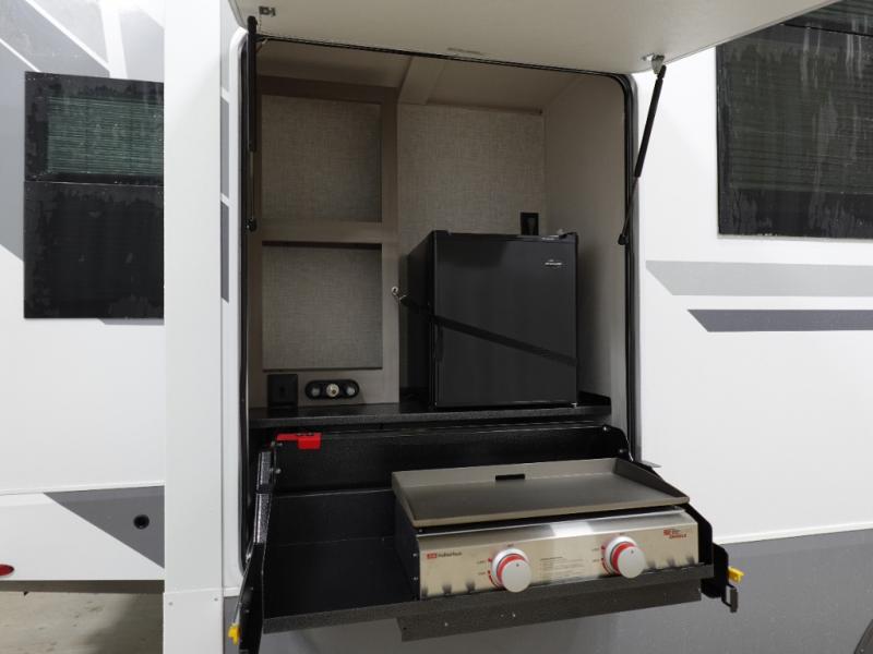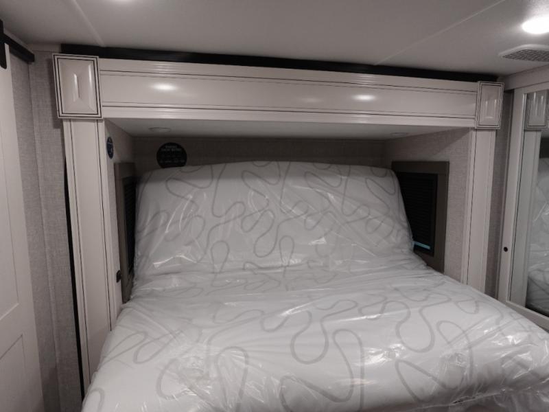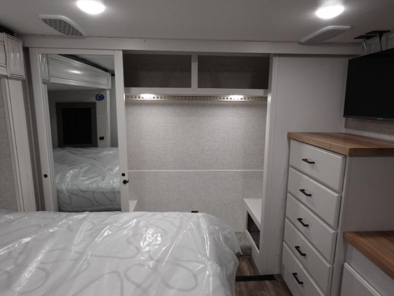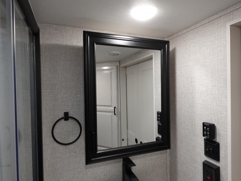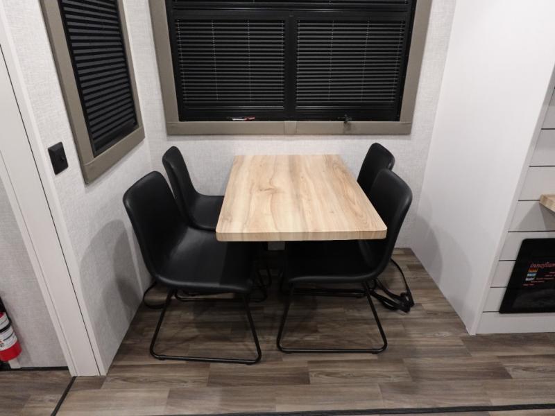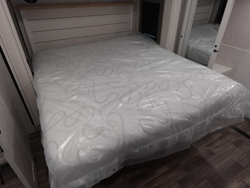You will love the great space and layout in this amazing fifth wheel! The rear living area features theater seats as well as a tri-fold sofa with adjustable headrests. It's the perfect place to watch a movie on the 40" Smart TV located in the entertainment center with fireplace! The kitchen includes a full suite of GE residential appliances, including a 4-burner range, 21 cu. ft. refrigerator, and over-the range microwave. Also standard are a dishwasher and central vacuum system so cleaning up is easy! At night retire to the bedroom with its king bed with power base. A second TV lets you watch your favorite shows as you fall asleep. Storage abounds including a full wardrobe and dresser with pull-out top. A dual-entry full bath is easily accessible and includes even more storage with a linen closet!