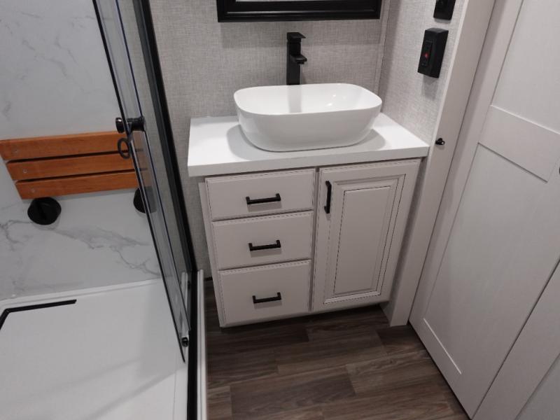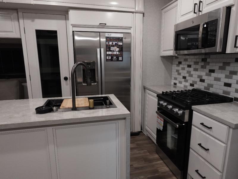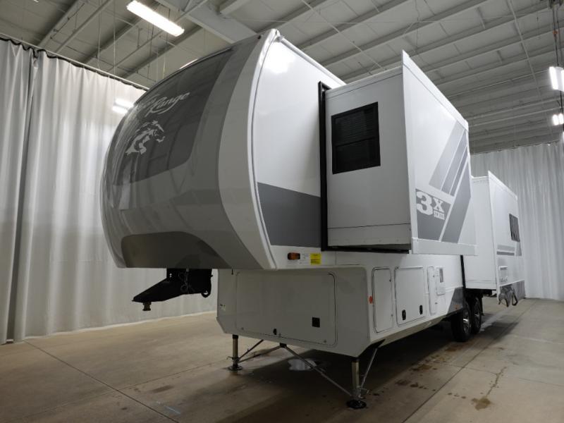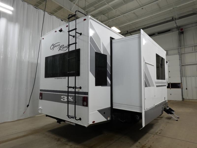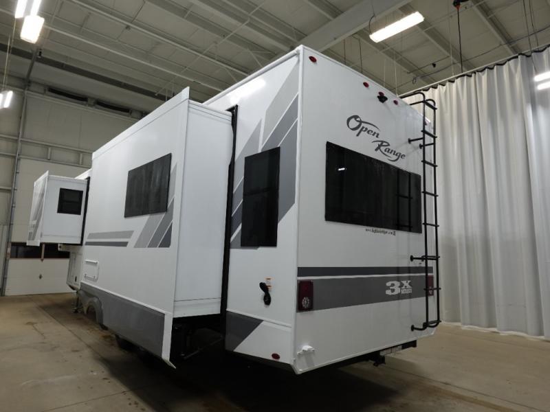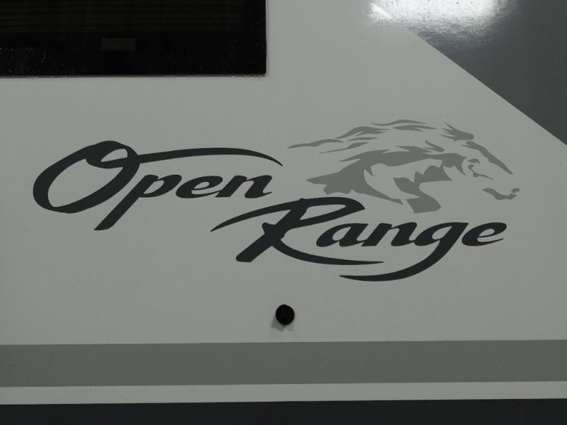 With any Open Range 3X fifth wheel by Highland Ridge, you will enjoy residential luxuries and an exceptional build. The TuffShell construction includes vacuum bonded laminated fiberglass and welded aluminum frames for added strength, and the PVC roofing membrane is ultra durable. You can plan to camp year around or go full-time since there is a mandatory Four Season Package that includes a heated and enclosed underbelly, a 40K BTU high-performance furnace, double insulated baggage doors, and more. The residential features continue on with the mandatory Executive Package with the TravelLINK Smart RV system, Keyed-Alike entry and baggage doors, painted fiberglass front cap with LED lighting, and three 15,000 BTU A/C units with quiet residential return air. Inside, you'll enjoy GE Profile kitchen appliances, sleek square windows with integrated blinds, ceramic subway tile backsplash, a glass shower door, and the list of amenities goes on!