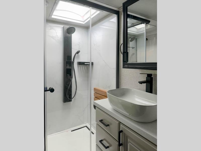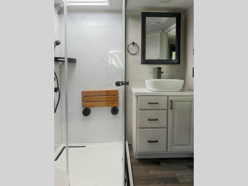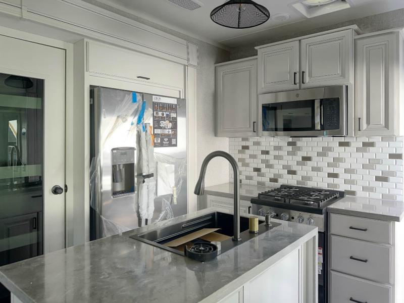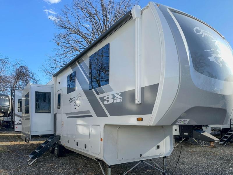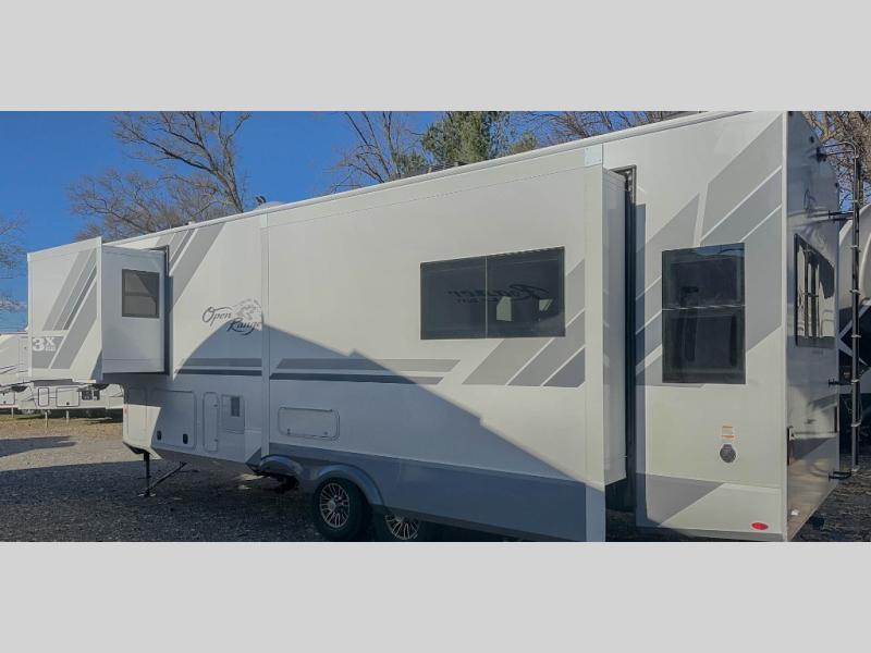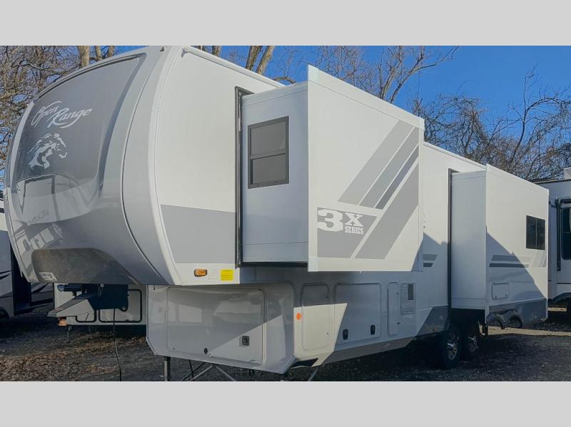 With any Open Range 3X fifth wheel by Highland Ridge, you will enjoy residential luxuries and an exceptional build. The TuffShell construction includes vacuum bonded laminated fiberglass and welded aluminum frames for added strength, and the PVC roofing membrane is ultra durable. You can plan to camp year around or go full-time since there is a mandatory Four Season Package that includes a heated and enclosed underbelly, a 40K BTU high-performance furnace, double insulated baggage doors, and more. The residential features continue on with the mandatory Executive Package with the TravelLINK Smart RV system, Keyed-Alike entry and baggage doors, painted fiberglass front cap with LED lighting, and three 15,000 BTU A/C units with quiet residential return air. Inside, you'll enjoy GE Profile kitchen appliances, sleek square windows with integrated blinds, ceramic subway tile backsplash, a glass shower door, and the list of amenities goes on!