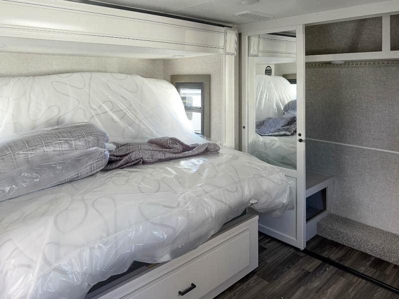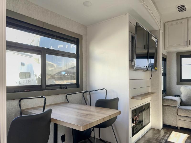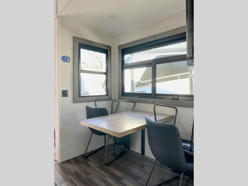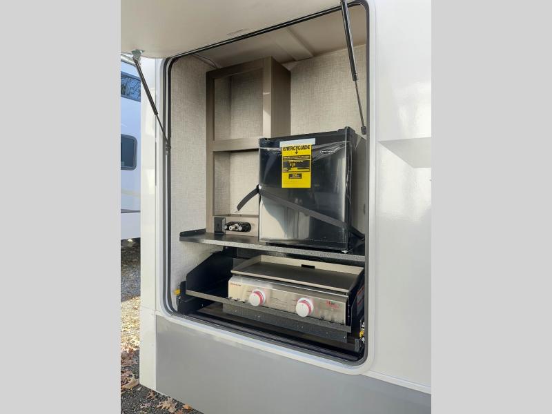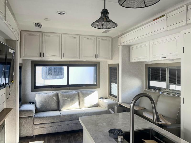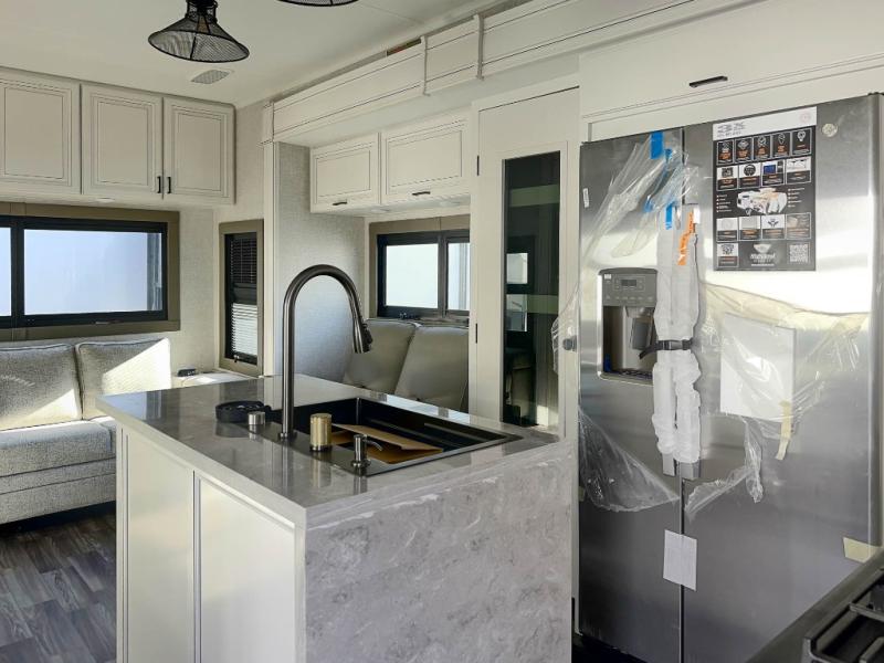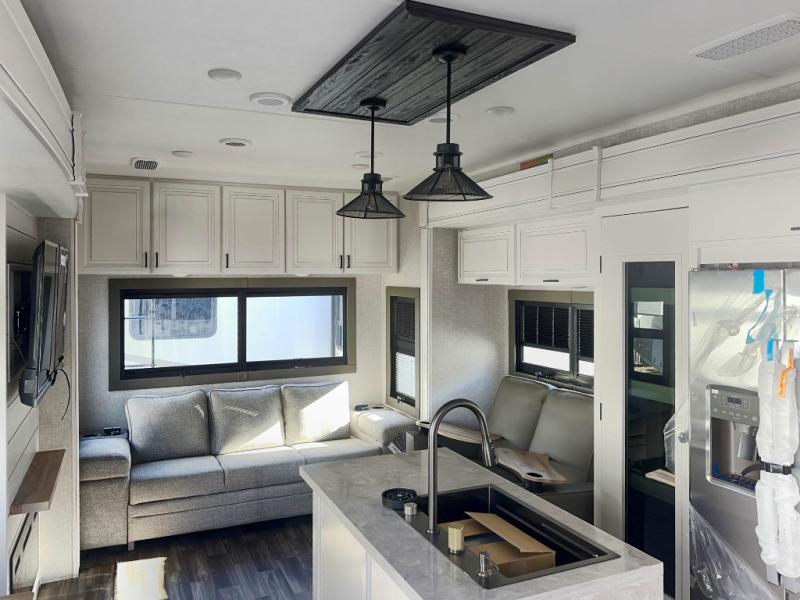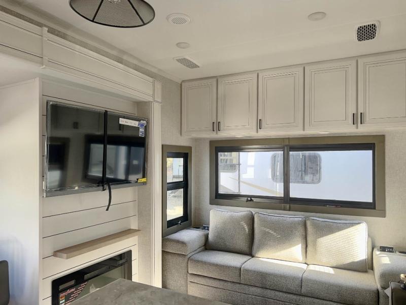 You will love the great space and layout in this amazing fifth wheel! The rear living area features theater seats as well as a tri-fold sofa with adjustable headrests. It's the perfect place to watch a movie on the 40" Smart TV located in the entertainment center with fireplace! The kitchen includes a full suite of GE residential appliances, including a 4-burner range, 21 cu. ft. refrigerator, and over-the range microwave. Also standard are a dishwasher and central vacuum system so cleaning up is easy! At night retire to the bedroom with its king bed with power base. A second TV lets you watch your favorite shows as you fall asleep. Storage abounds including a full wardrobe and dresser with pull-out top. A dual-entry full bath is easily accessible and includes even more storage with a linen closet!