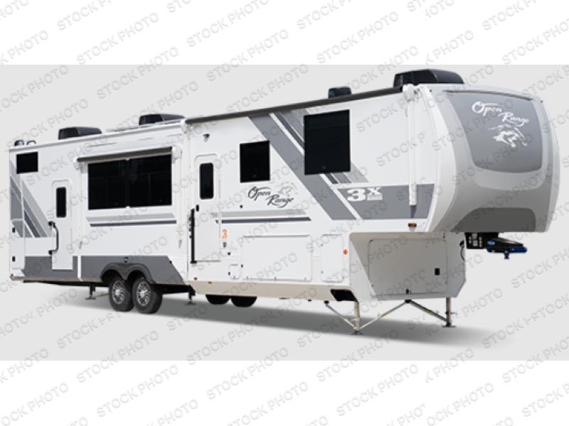 With any Open Range 3X fifth wheel by Highland Ridge, you will enjoy residential luxuries and an exceptional build. The TuffShell construction includes vacuum bonded laminated fiberglass and welded aluminum frames for added strength, and the PVC roofing membrane is ultra durable. You can plan to camp year around or go full-time since there is a mandatory Four Season Package that includes a heated and enclosed underbelly, a 40K BTU high-performance furnace, double insulated baggage doors, and more. The residential features continue on with the mandatory Executive Package with the TravelLINK Smart RV system, Keyed-Alike entry and baggage doors, painted fiberglass front cap with LED lighting, and three 15,000 BTU A/C units with quiet residential return air. Inside, you'll enjoy GE Profile kitchen appliances, sleek square windows with integrated blinds, ceramic subway tile backsplash, a glass shower door, and the list of amenities goes on!