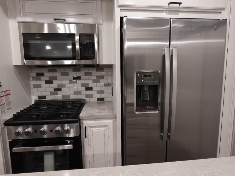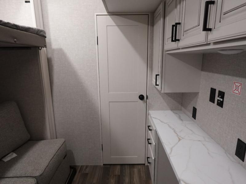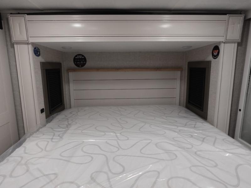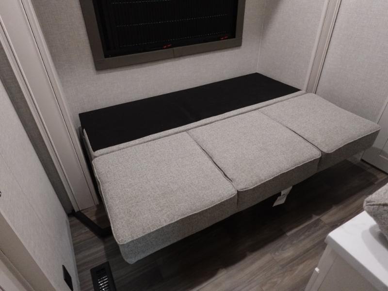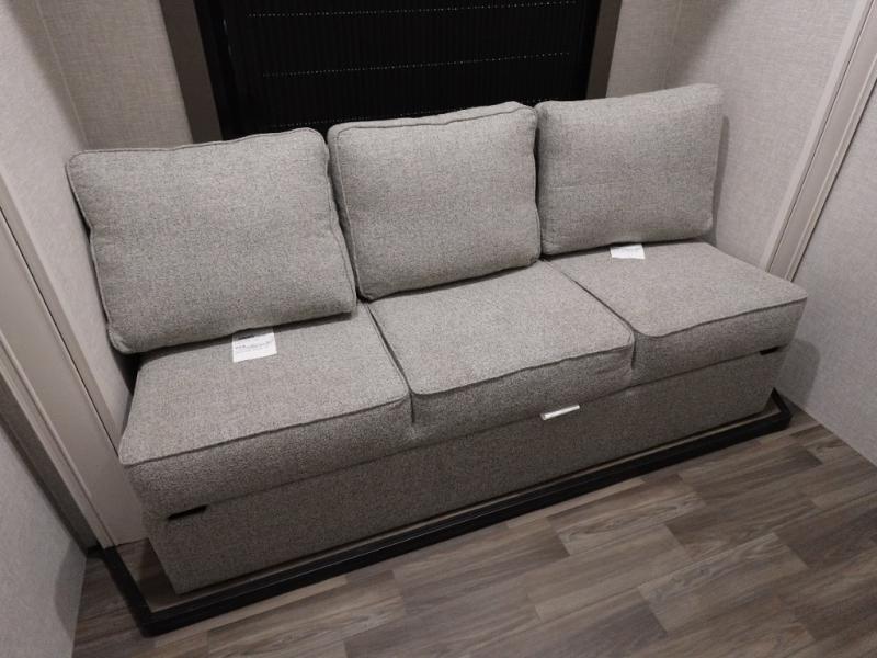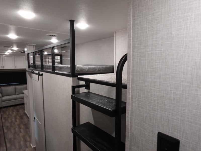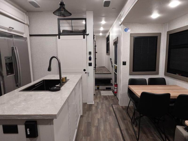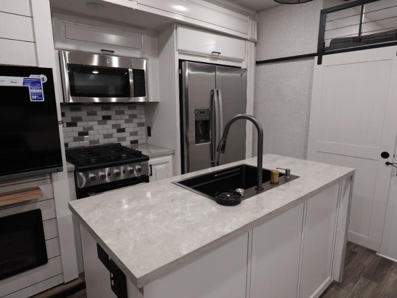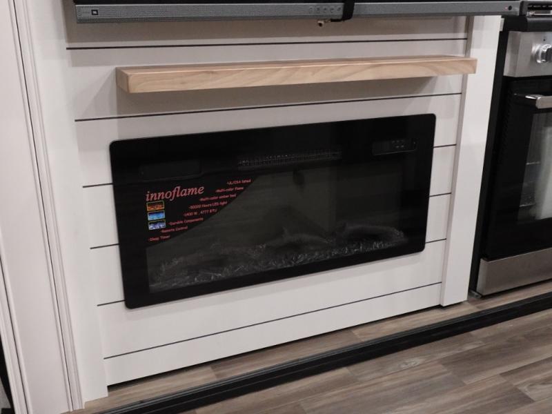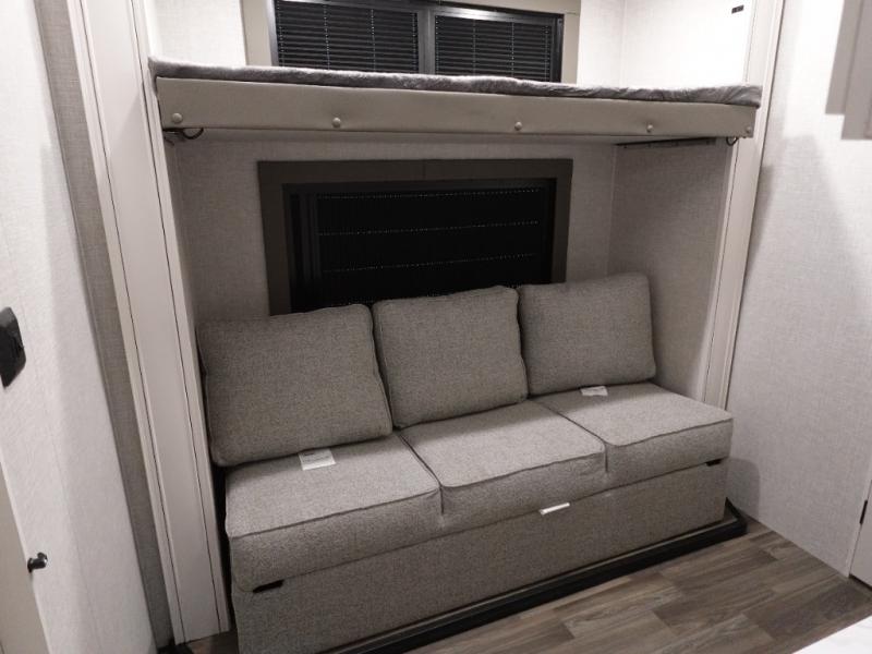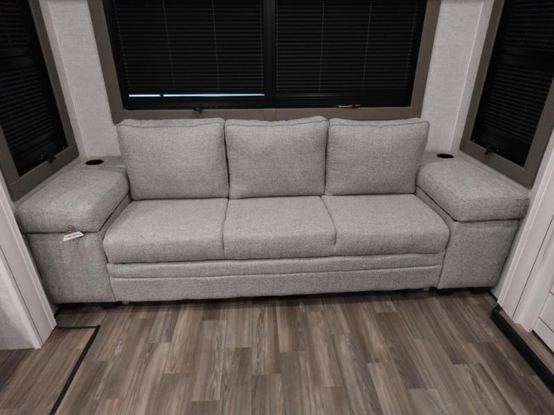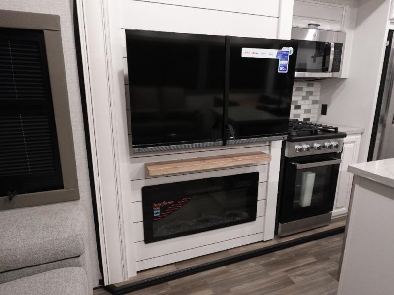 You won't even feel like you are camping in this fifth wheel! The rear living area features theater seats as well as a tri-fold sofa with adjustable headrests. It's the perfect place to watch a movie with the Smart entertainment HDTV that has Bluetooth, soundbar, and built-in stereo, plus there is a cozy fireplace! The kitchen includes a full suite of GE residential appliances, including a 4-burner range, 21 cu. ft. refrigerator, and over-the range microwave. Also standard are a dishwasher and central vacuum system so cleaning up is easy! At night retire to the bedroom with its king bed with power base slide. A second TV lets you watch your favorite shows as you fall asleep. Storage abounds including a full wardrobe and dresser with pull-out top. A dual-entry full bath is easily accessible and includes even more storage with a linen closet. The second bedroom has slide that houses a flip-up bunk above a bi-fold sofa and a desk/dresser with overhead storage, and above it all is a loft for extra sleeping or storage space!