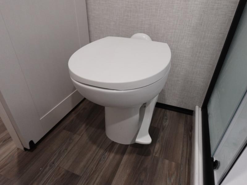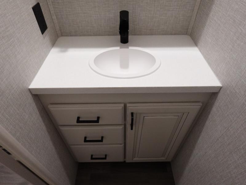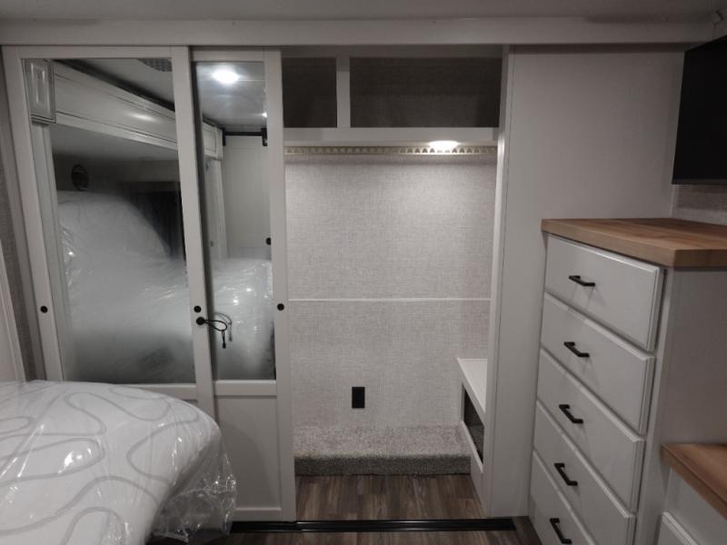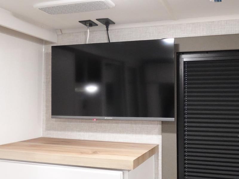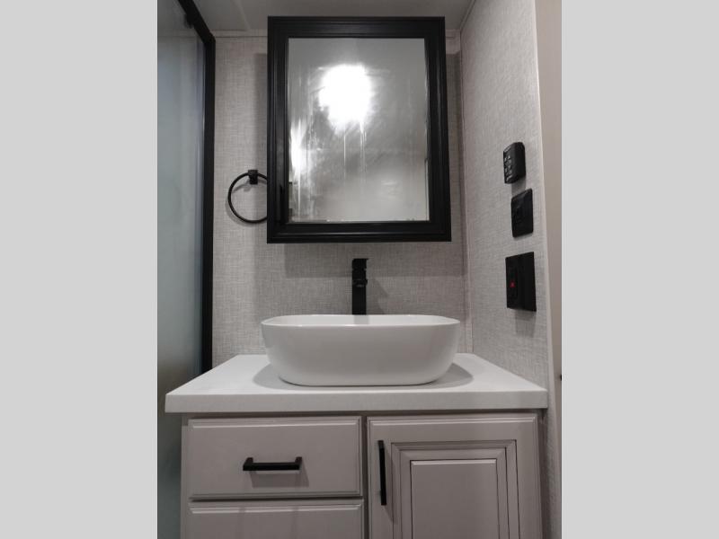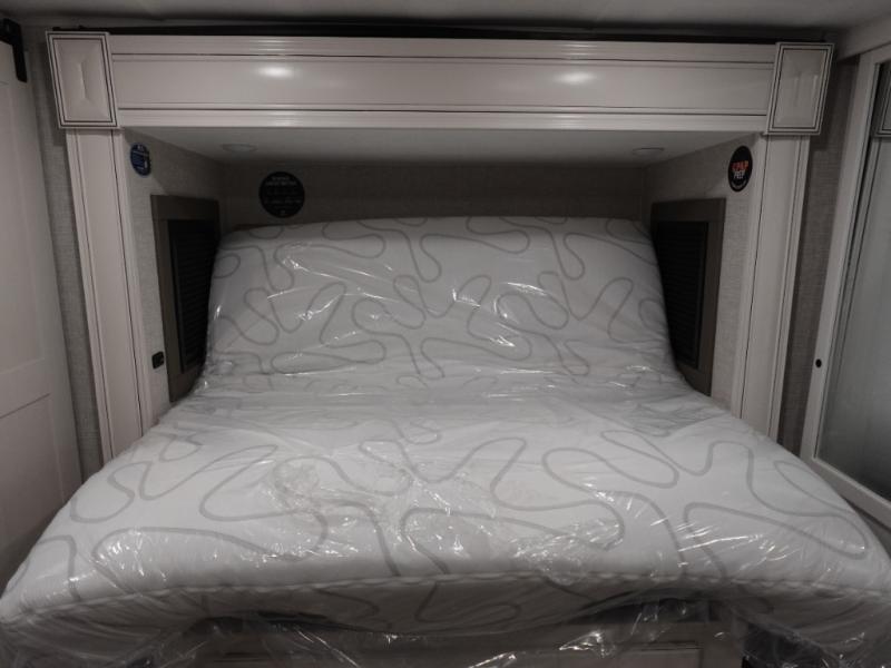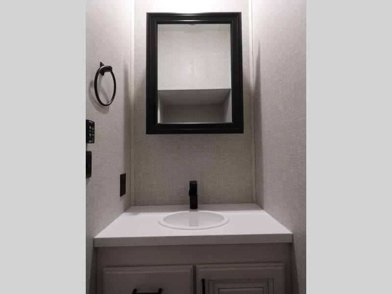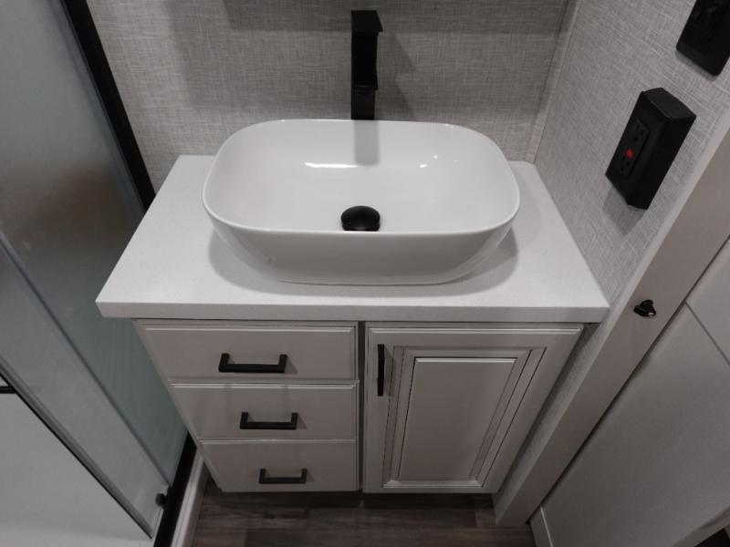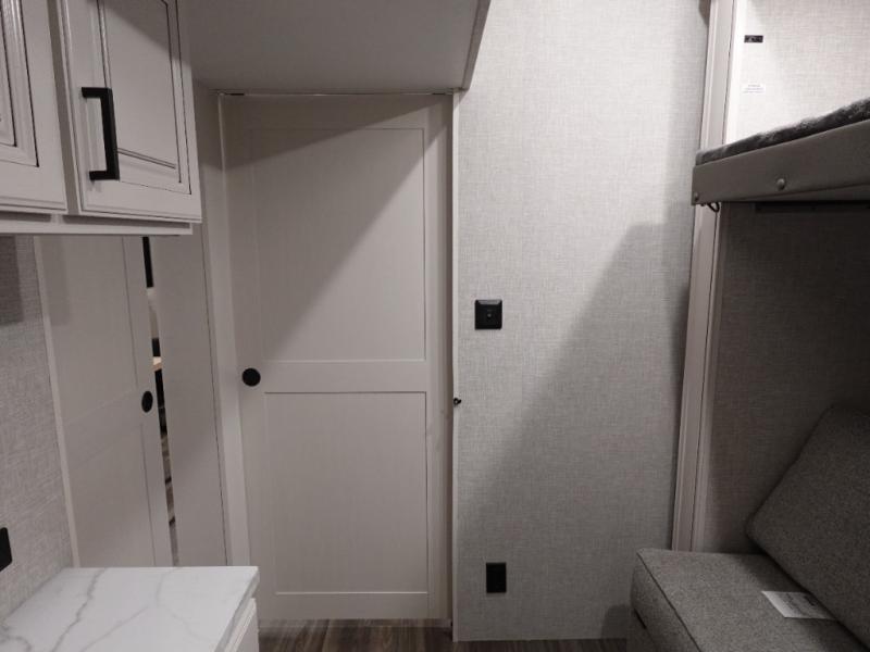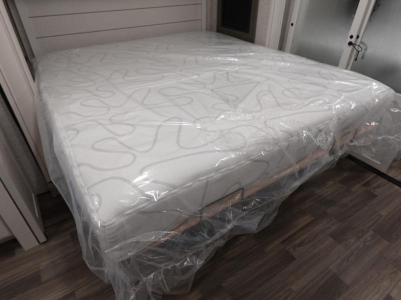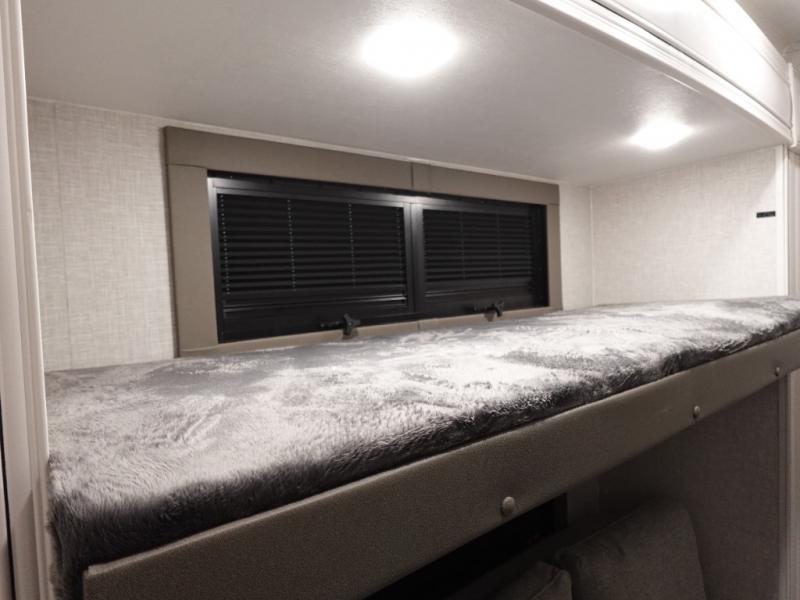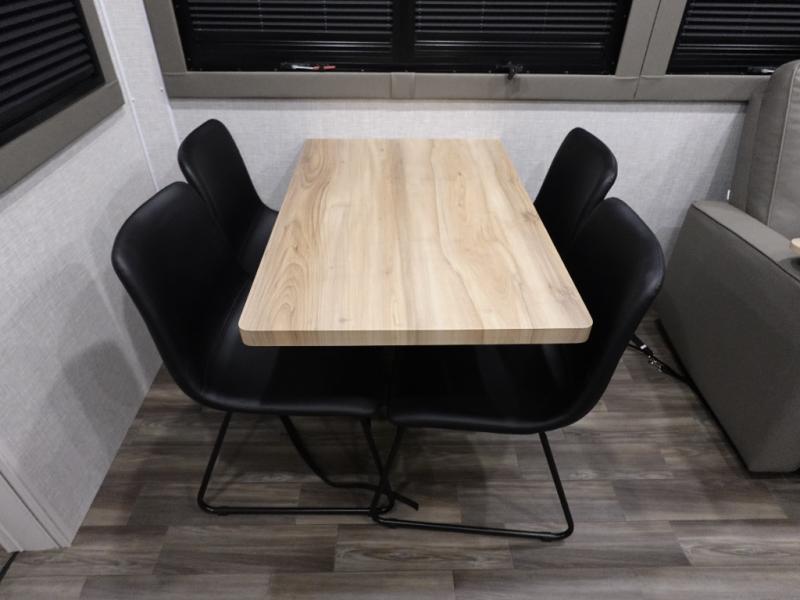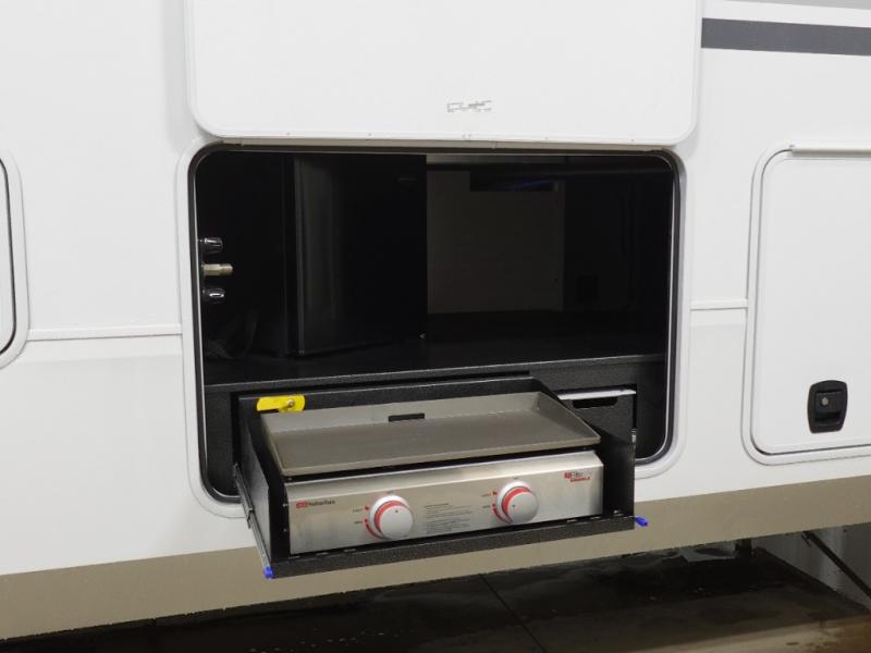 You won't even feel like you are camping in this fifth wheel! The rear living area features theater seats as well as a tri-fold sofa with adjustable headrests. It's the perfect place to watch a movie with the Smart entertainment HDTV that has Bluetooth, soundbar, and built-in stereo, plus there is a cozy fireplace! The kitchen includes a full suite of GE residential appliances, including a 4-burner range, 21 cu. ft. refrigerator, and over-the range microwave. Also standard are a dishwasher and central vacuum system so cleaning up is easy! At night retire to the bedroom with its king bed with power base slide. A second TV lets you watch your favorite shows as you fall asleep. Storage abounds including a full wardrobe and dresser with pull-out top. A dual-entry full bath is easily accessible and includes even more storage with a linen closet. The second bedroom has slide that houses a flip-up bunk above a bi-fold sofa and a desk/dresser with overhead storage, and above it all is a loft for extra sleeping or storage space!