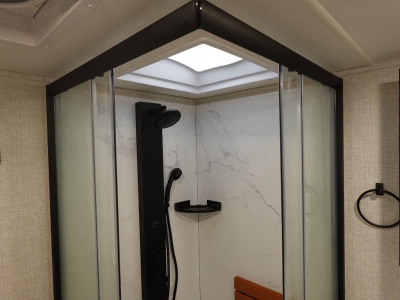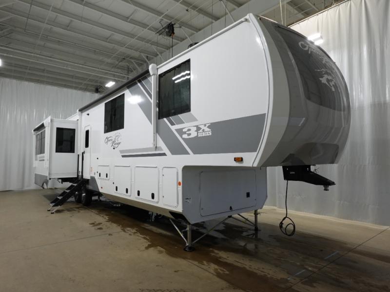 With any Open Range 3X fifth wheel by Highland Ridge, you will enjoy residential luxuries and an exceptional build. The TuffShell construction includes vacuum bonded laminated fiberglass and welded aluminum frames for added strength, and the PVC roofing membrane is ultra durable. You can plan to camp year around or go full-time since there is a mandatory Four Season Package that includes a heated and enclosed underbelly, a 40K BTU high-performance furnace, double insulated baggage doors, and more. The residential features continue on with the mandatory Executive Package with the TravelLINK Smart RV system, Keyed-Alike entry and baggage doors, painted fiberglass front cap with LED lighting, and three 15,000 BTU A/C units with quiet residential return air. Inside, you'll enjoy GE Profile kitchen appliances, sleek square windows with integrated blinds, ceramic subway tile backsplash, a glass shower door, and the list of amenities goes on!