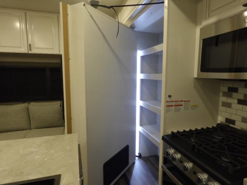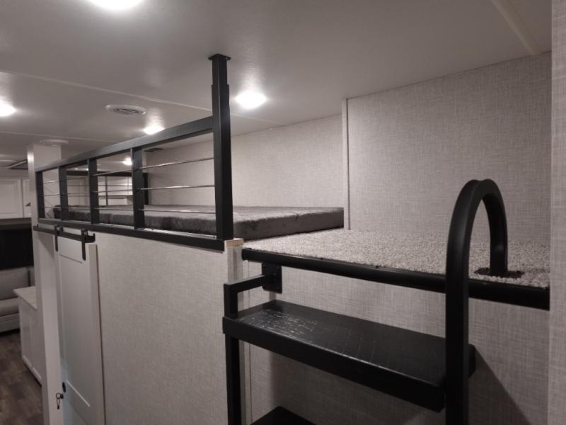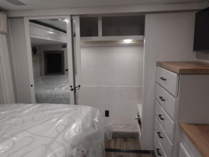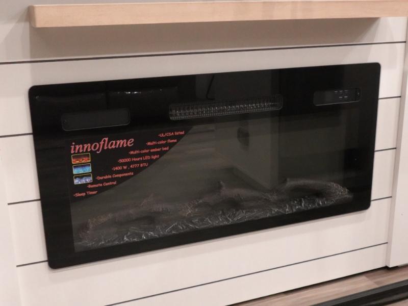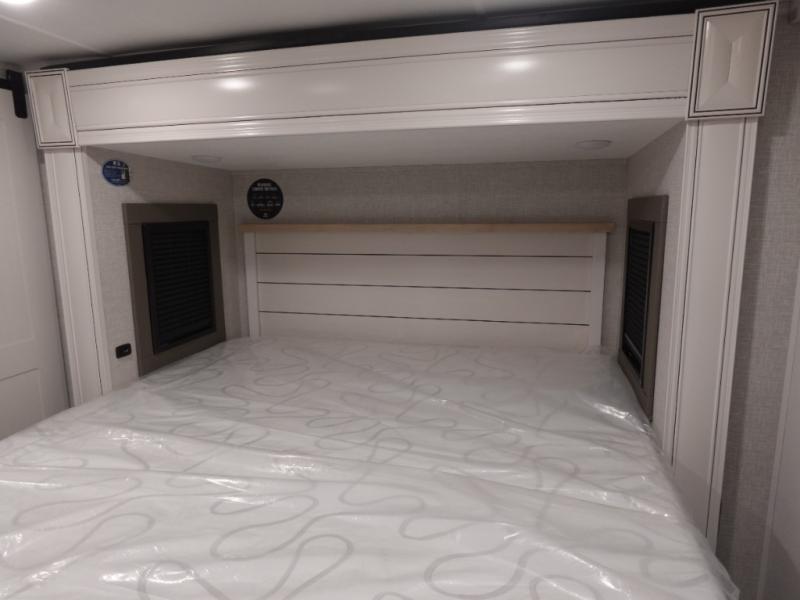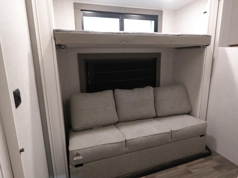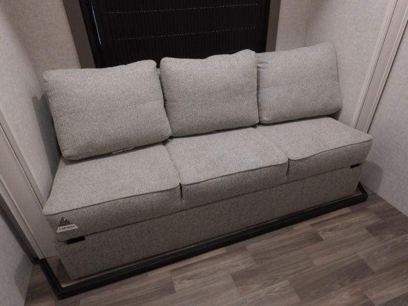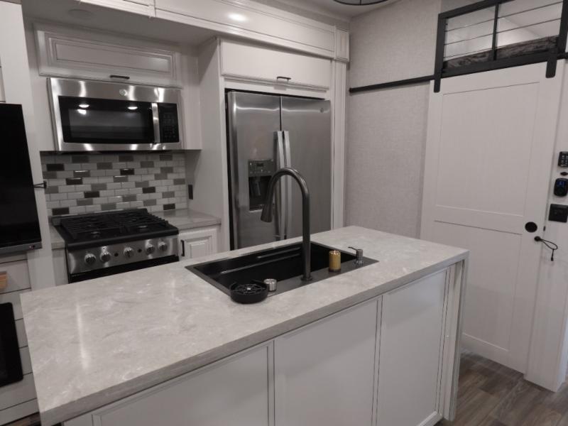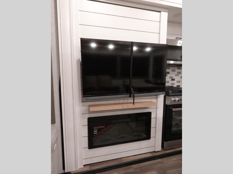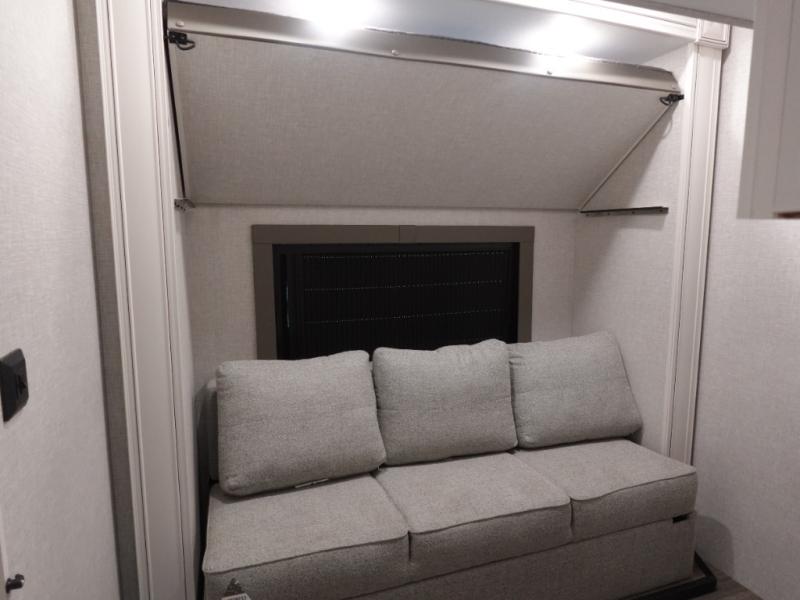 You won't even feel like you are camping in this fifth wheel! The rear living area features theater seats as well as a tri-fold sofa with adjustable headrests. It's the perfect place to watch a movie with the Smart entertainment HDTV that has Bluetooth, soundbar, and built-in stereo, plus there is a cozy fireplace! The kitchen includes a full suite of GE residential appliances, including a 4-burner range, 21 cu. ft. refrigerator, and over-the range microwave. Also standard are a dishwasher and central vacuum system so cleaning up is easy! At night retire to the bedroom with its king bed with power base slide. A second TV lets you watch your favorite shows as you fall asleep. Storage abounds including a full wardrobe and dresser with pull-out top. A dual-entry full bath is easily accessible and includes even more storage with a linen closet. The second bedroom has slide that houses a flip-up bunk above a bi-fold sofa and a desk/dresser with overhead storage, and above it all is a loft for extra sleeping or storage space!