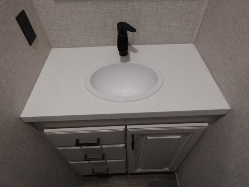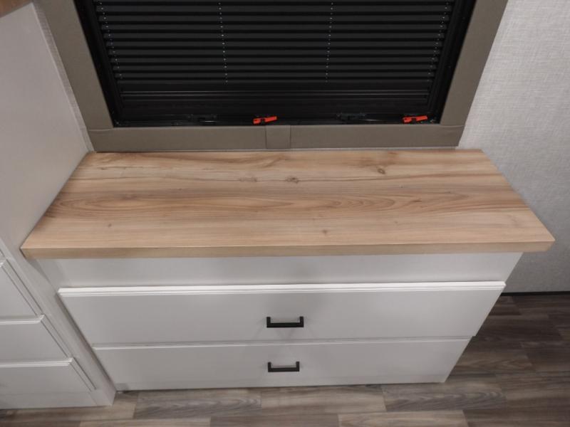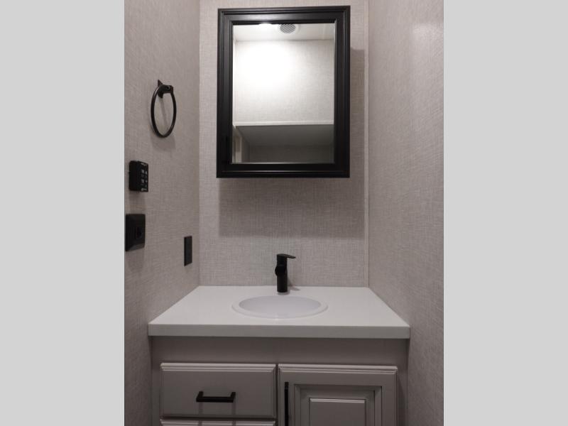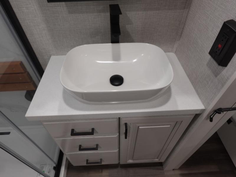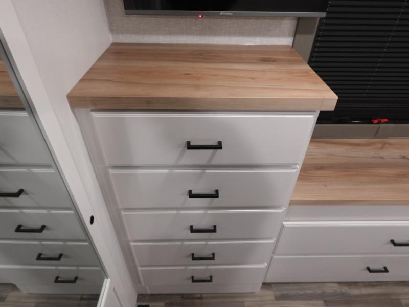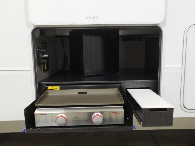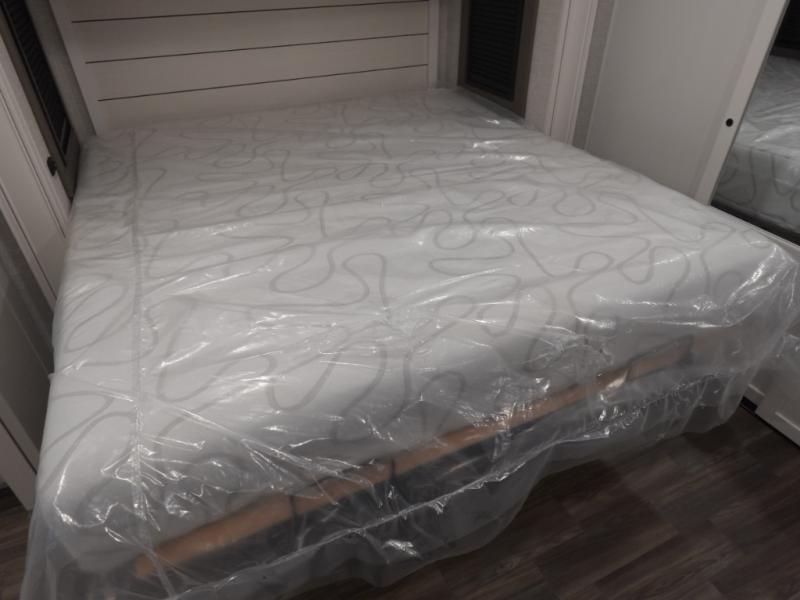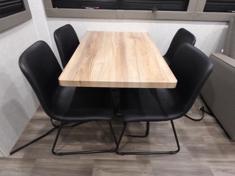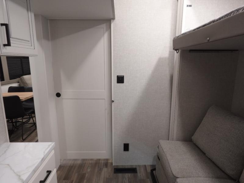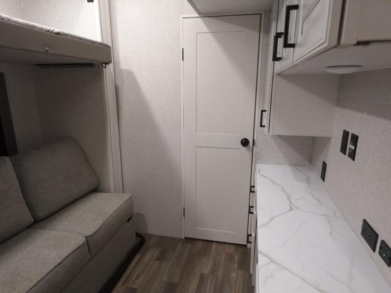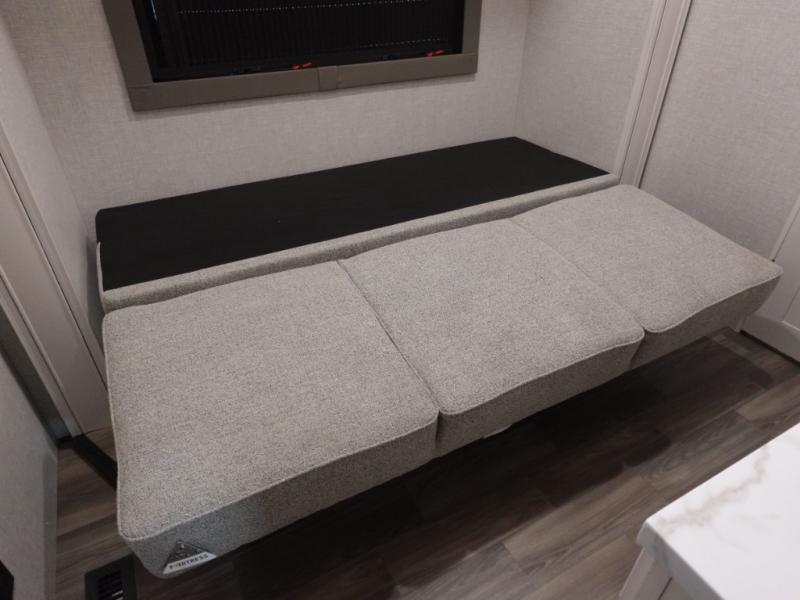 You won't even feel like you are camping in this fifth wheel! The rear living area features theater seats as well as a tri-fold sofa with adjustable headrests. It's the perfect place to watch a movie with the Smart entertainment HDTV that has Bluetooth, soundbar, and built-in stereo, plus there is a cozy fireplace! The kitchen includes a full suite of GE residential appliances, including a 4-burner range, 21 cu. ft. refrigerator, and over-the range microwave. Also standard are a dishwasher and central vacuum system so cleaning up is easy! At night retire to the bedroom with its king bed with power base slide. A second TV lets you watch your favorite shows as you fall asleep. Storage abounds including a full wardrobe and dresser with pull-out top. A dual-entry full bath is easily accessible and includes even more storage with a linen closet. The second bedroom has slide that houses a flip-up bunk above a bi-fold sofa and a desk/dresser with overhead storage, and above it all is a loft for extra sleeping or storage space!