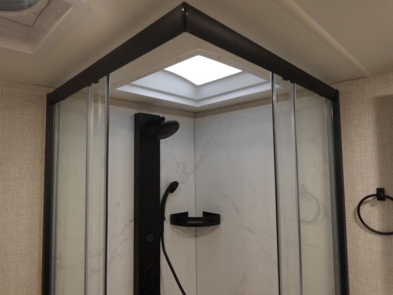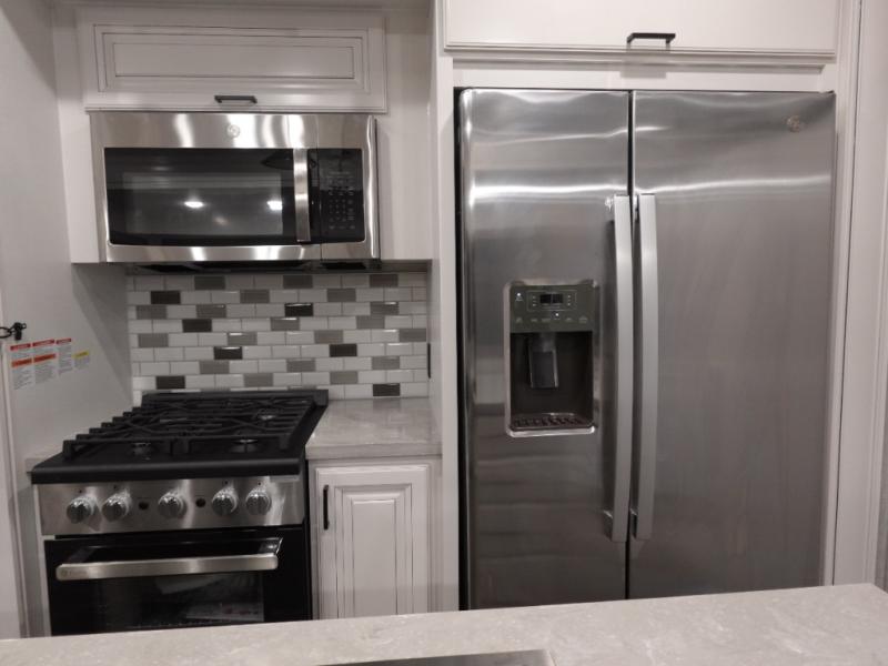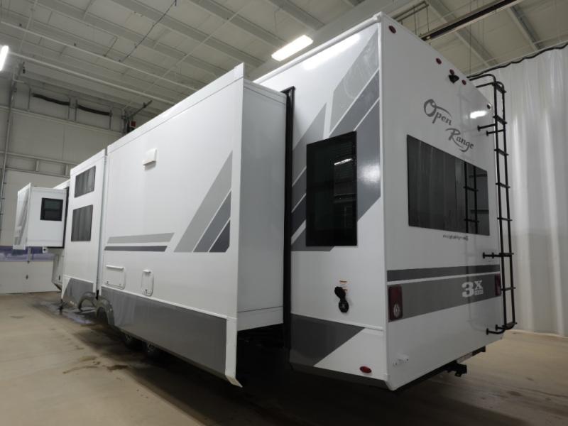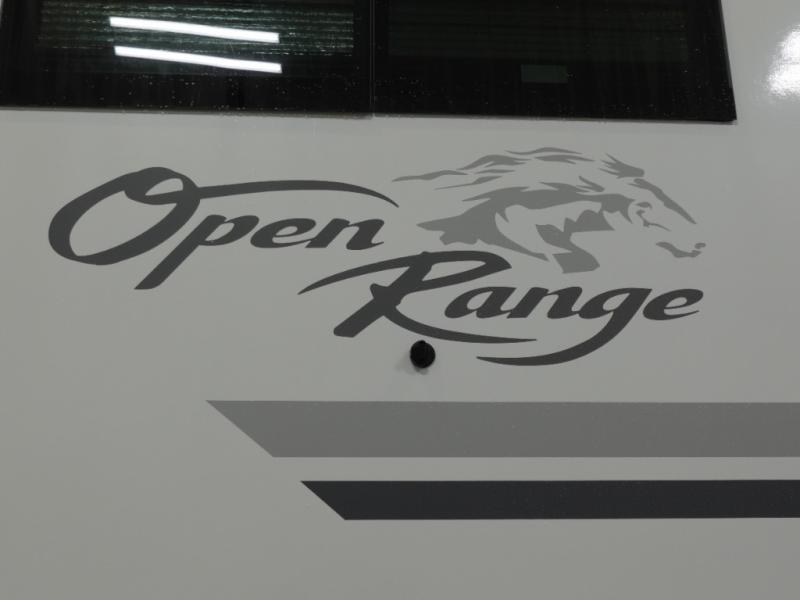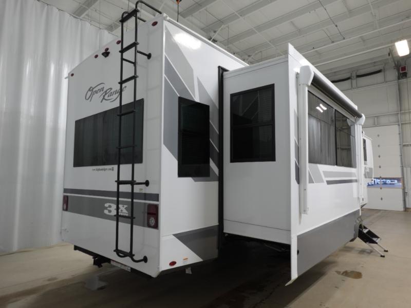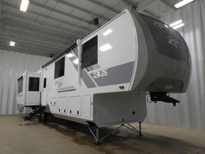 With any Open Range 3X fifth wheel by Highland Ridge, you will enjoy residential luxuries and an exceptional build. The TuffShell construction includes vacuum bonded laminated fiberglass and welded aluminum frames for added strength, and the PVC roofing membrane is ultra durable. You can plan to camp year around or go full-time since there is a mandatory Four Season Package that includes a heated and enclosed underbelly, a 40K BTU high-performance furnace, double insulated baggage doors, and more. The residential features continue on with the mandatory Executive Package with the TravelLINK Smart RV system, Keyed-Alike entry and baggage doors, painted fiberglass front cap with LED lighting, and three 15,000 BTU A/C units with quiet residential return air. Inside, you'll enjoy GE Profile kitchen appliances, sleek square windows with integrated blinds, ceramic subway tile backsplash, a glass shower door, and the list of amenities goes on!