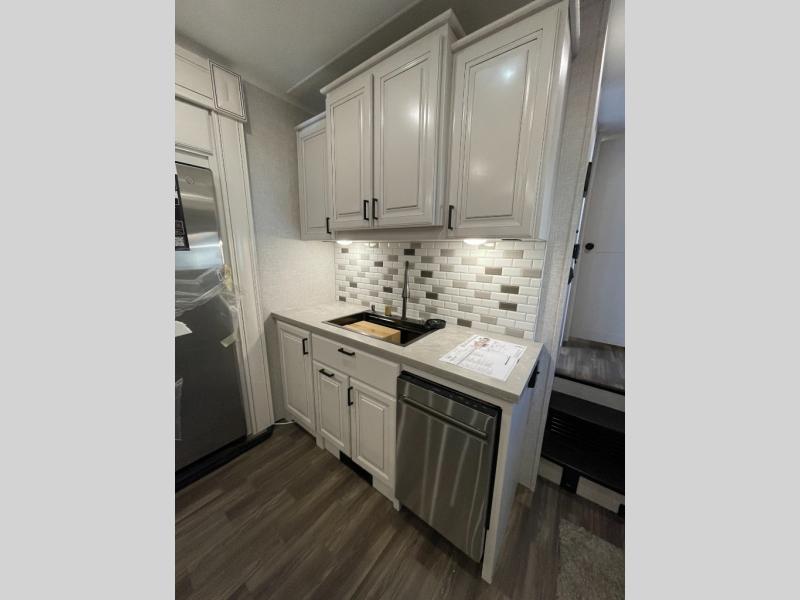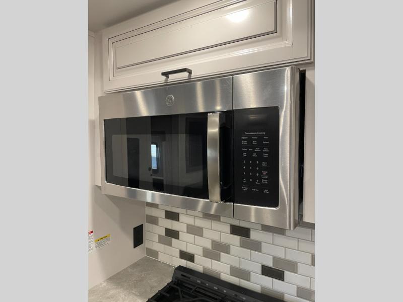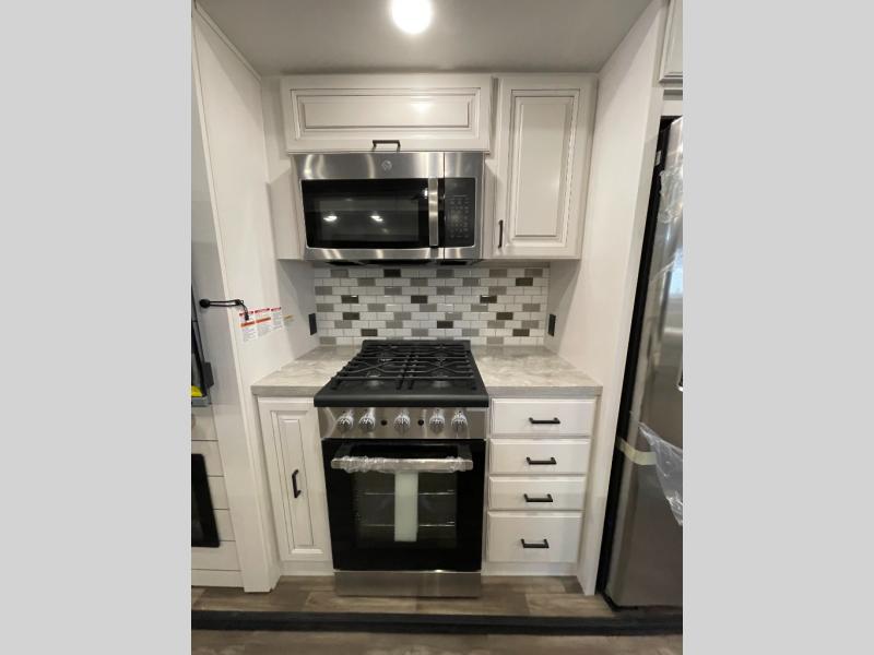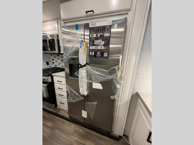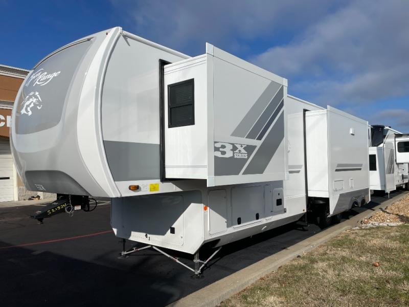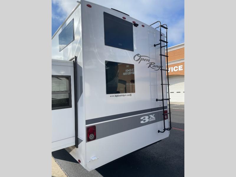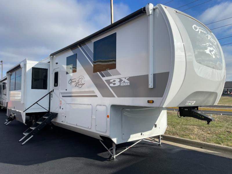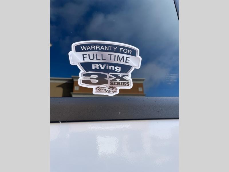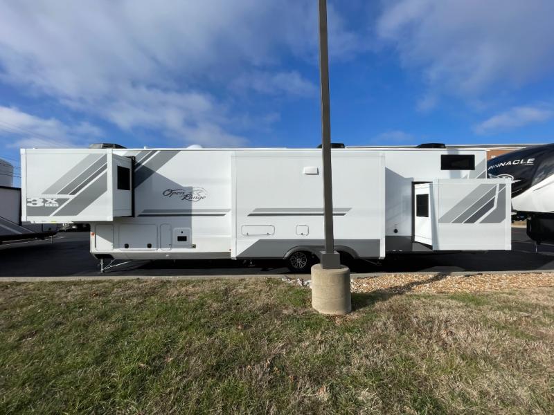 With any Open Range 3X fifth wheel by Highland Ridge, you will enjoy residential luxuries and an exceptional build. The TuffShell construction includes vacuum bonded laminated fiberglass and welded aluminum frames for added strength, and the PVC roofing membrane is ultra durable. You can plan to camp year around or go full-time since there is a mandatory Four Season Package that includes a heated and enclosed underbelly, a 40K BTU high-performance furnace, double insulated baggage doors, and more. The residential features continue on with the mandatory Executive Package with the TravelLINK Smart RV system, Keyed-Alike entry and baggage doors, painted fiberglass front cap with LED lighting, and three 15,000 BTU A/C units with quiet residential return air. Inside, you'll enjoy GE Profile kitchen appliances, sleek square windows with integrated blinds, ceramic subway tile backsplash, a glass shower door, and the list of amenities goes on!