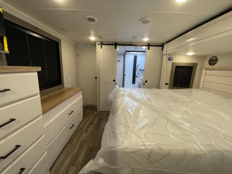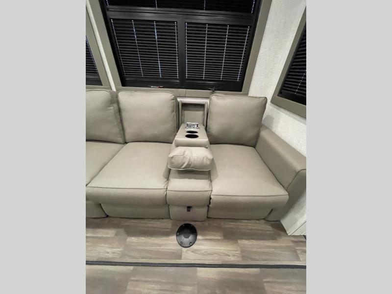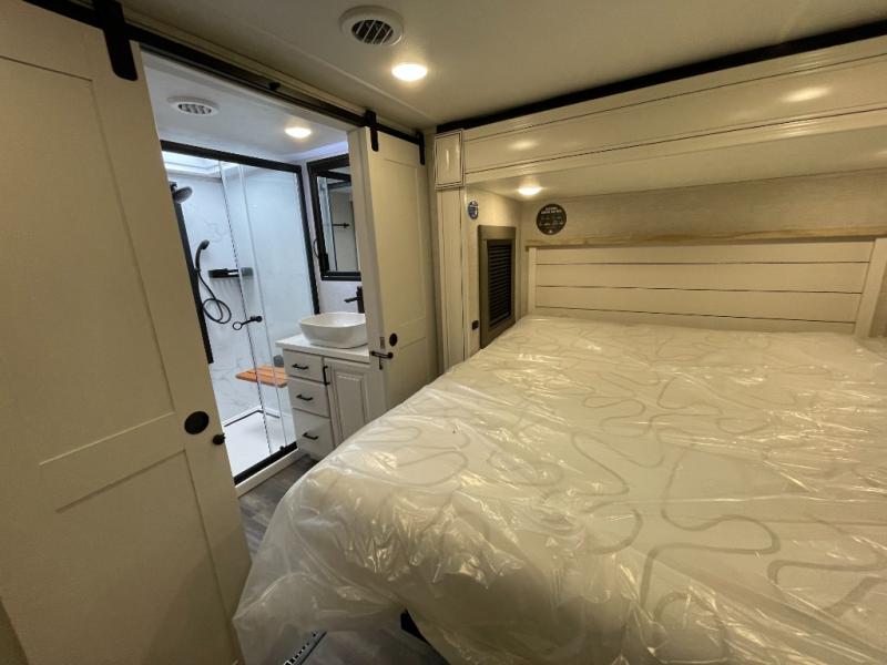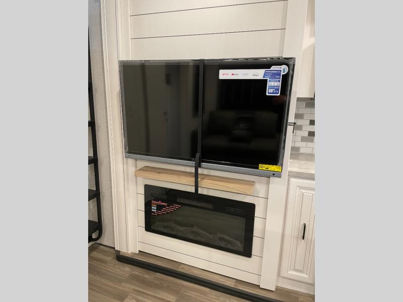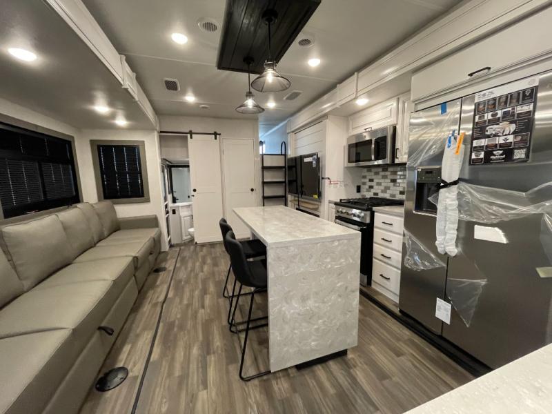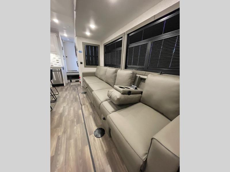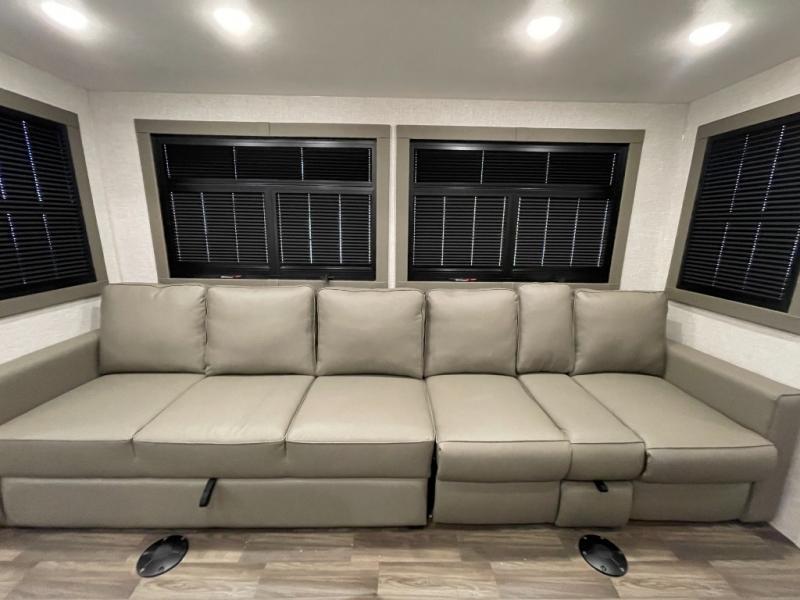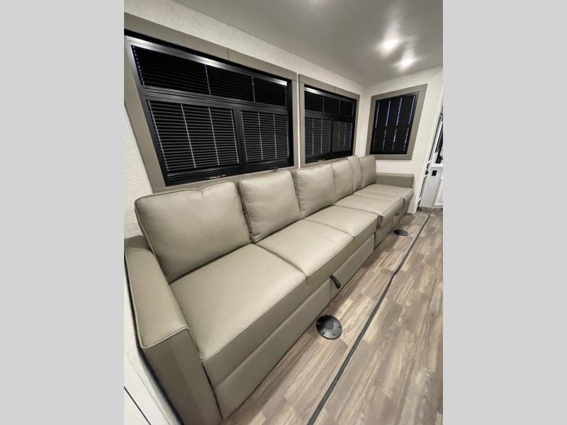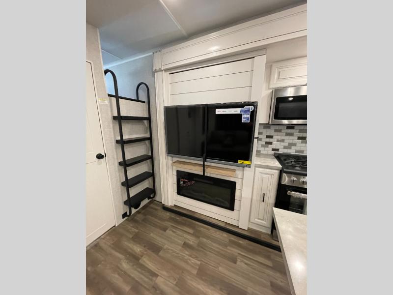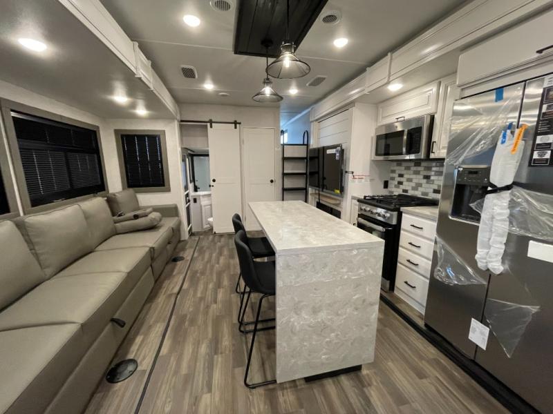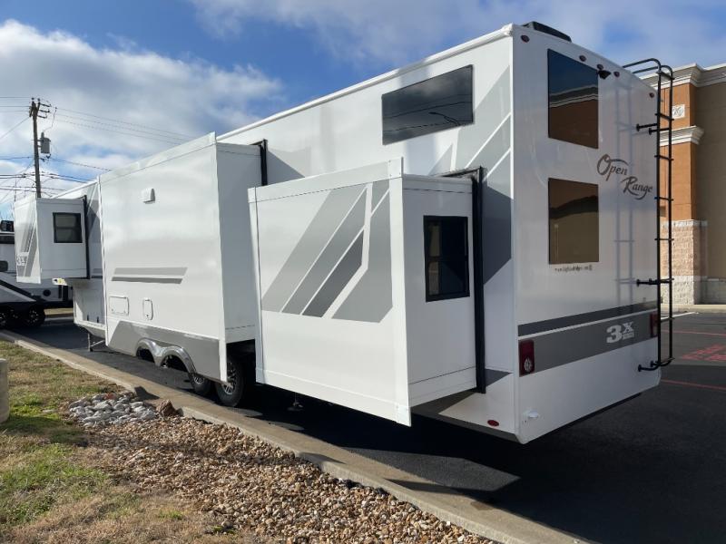 If you enjoy luxury camping or you're looking for a residential fifth wheel to go full-time in, this Open Range 3X is the one! The middle kitchen and living room is made open by the dual opposing slides, and your crew can get comfortable on the mega lounge with two tables. The chef of your group will love cooking on GE free-standing four burner range, or they can use the GE residential microwave to heat up leftovers. The standard dishwasher and central vacuum make cleanup a breeze. A waterfall island with four chairs will provide a place to dine and the hidden pantry behind the swing-out entertainment center can hold snacks galore. There is also a fireplace and smart HDTV to make movie nights cozy. The front master bedroom includes a slide out king bed with a power base, two dressers, a large front closet, and a 32" TV to watch shows in bed. You even have your own entrance into the full bath plus washer and dryer prep if you choose to add those appliances. The rear master bedroom is just as accommodating with its queen bed slide out, wardrobe and dresser, plus second full bath with its own exterior entry door. And the loft above the rear bedroom provides even more sleeping space.
