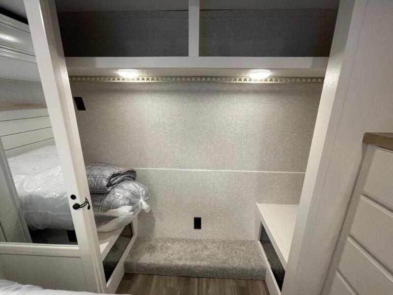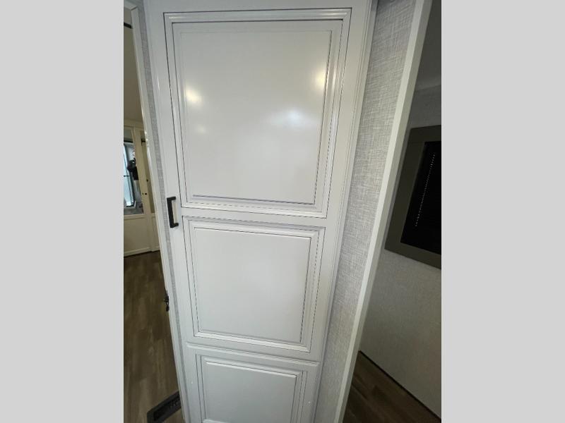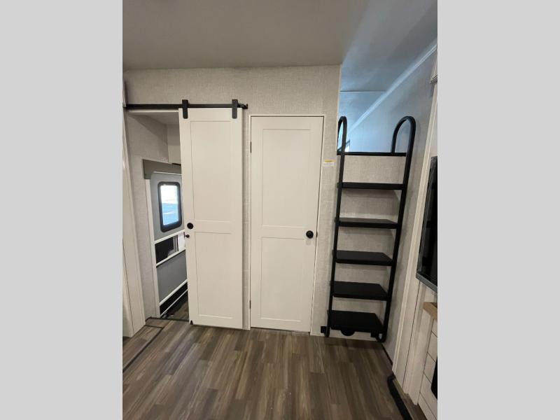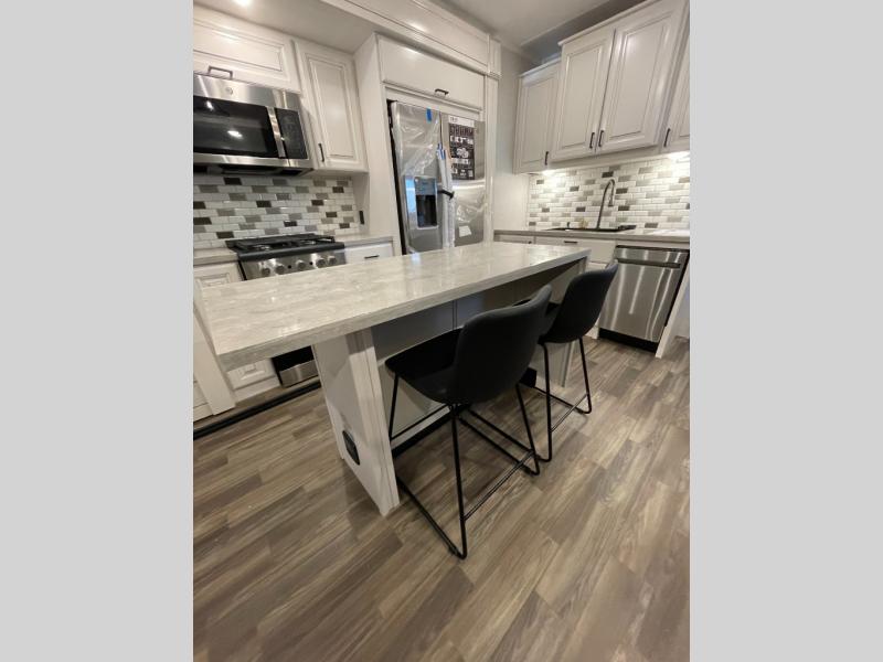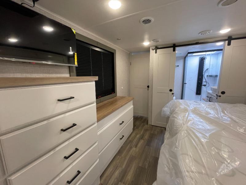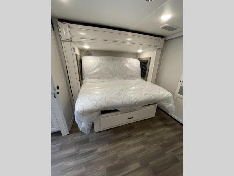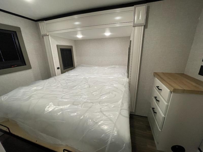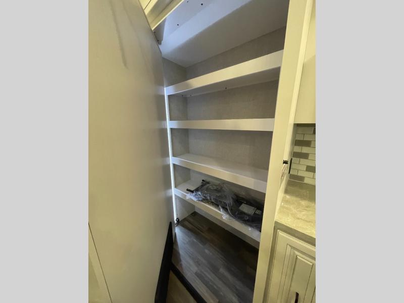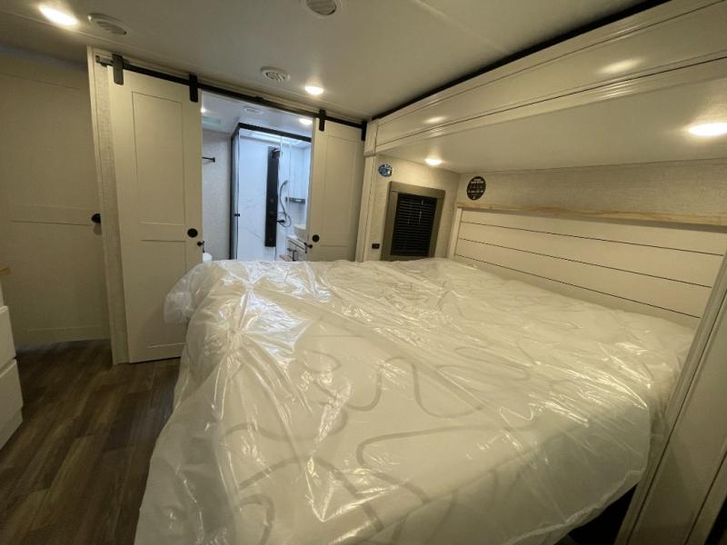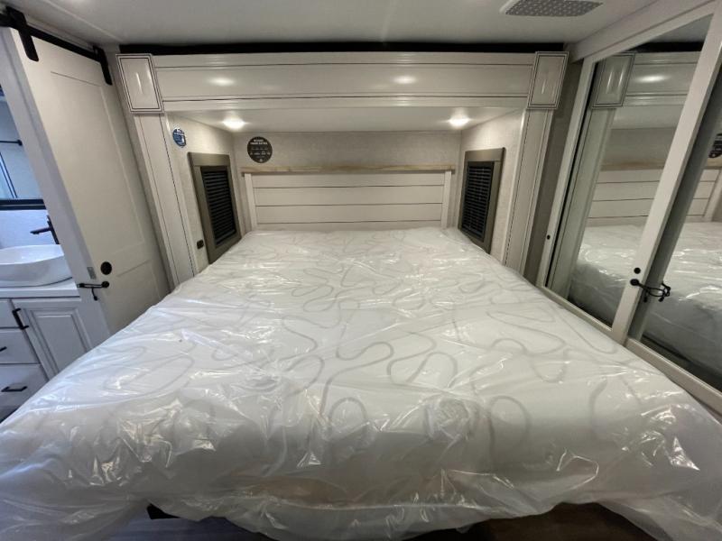 If you enjoy luxury camping or you're looking for a residential fifth wheel to go full-time in, this Open Range 3X is the one! The middle kitchen and living room is made open by the dual opposing slides, and your crew can get comfortable on the mega lounge with two tables. The chef of your group will love cooking on GE free-standing four burner range, or they can use the GE residential microwave to heat up leftovers. The standard dishwasher and central vacuum make cleanup a breeze. A waterfall island with four chairs will provide a place to dine and the hidden pantry behind the swing-out entertainment center can hold snacks galore. There is also a fireplace and smart HDTV to make movie nights cozy. The front master bedroom includes a slide out king bed with a power base, two dressers, a large front closet, and a 32" TV to watch shows in bed. You even have your own entrance into the full bath plus washer and dryer prep if you choose to add those appliances. The rear master bedroom is just as accommodating with its queen bed slide out, wardrobe and dresser, plus second full bath with its own exterior entry door. And the loft above the rear bedroom provides even more sleeping space.