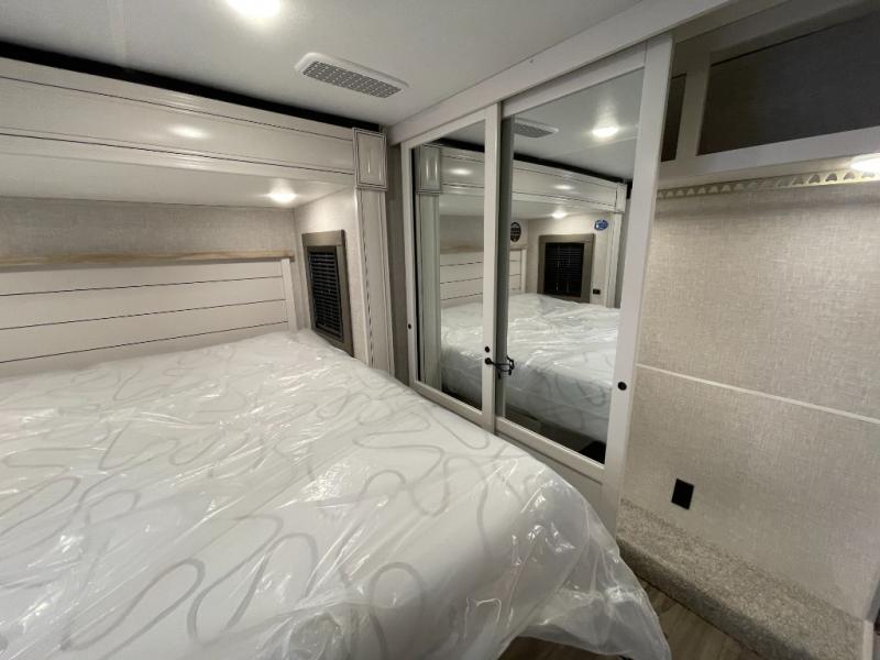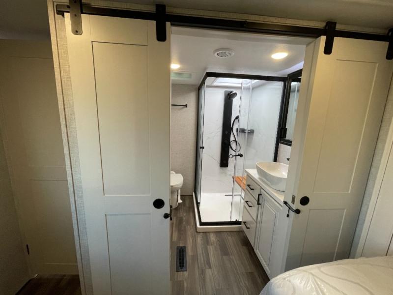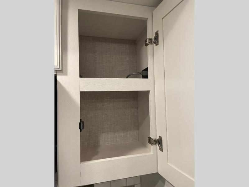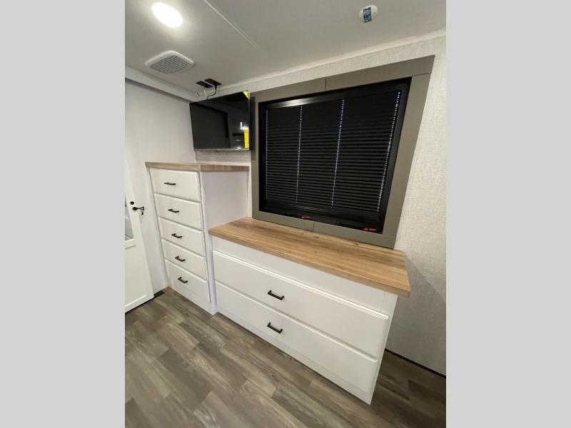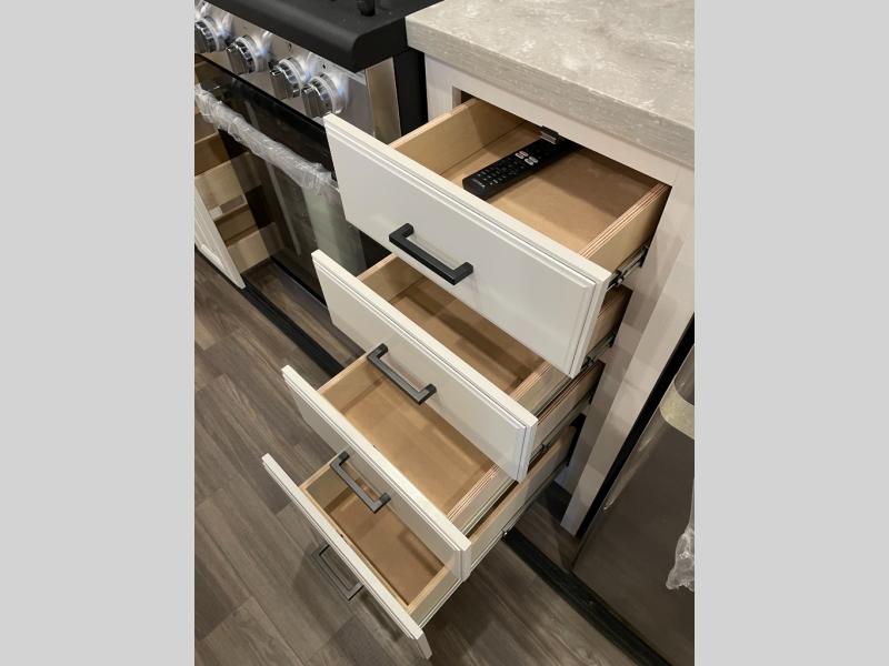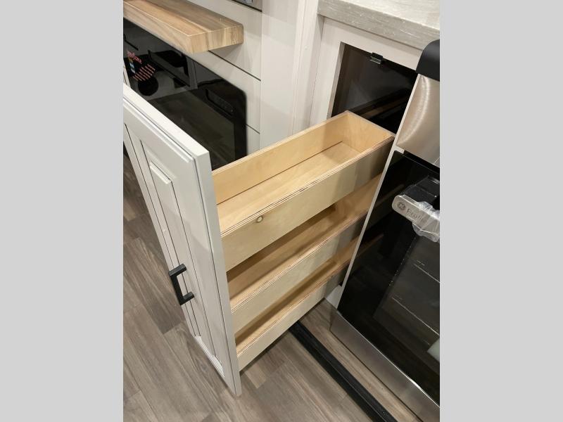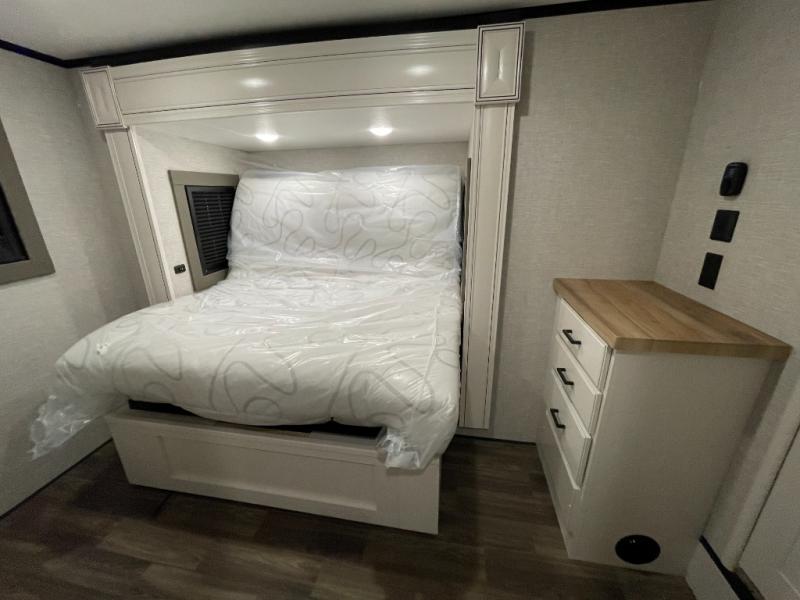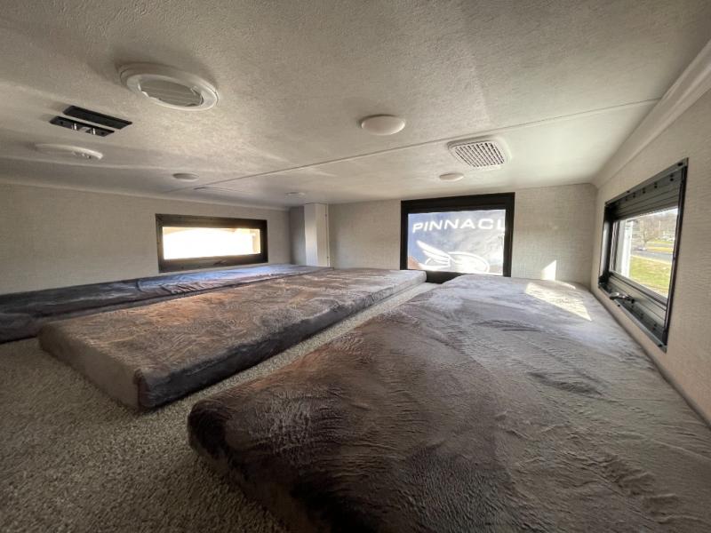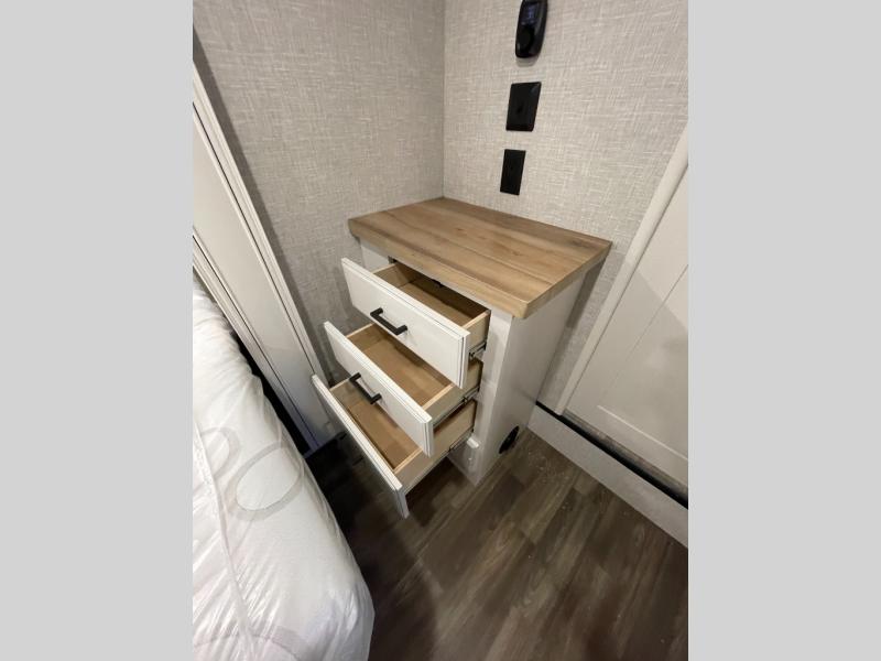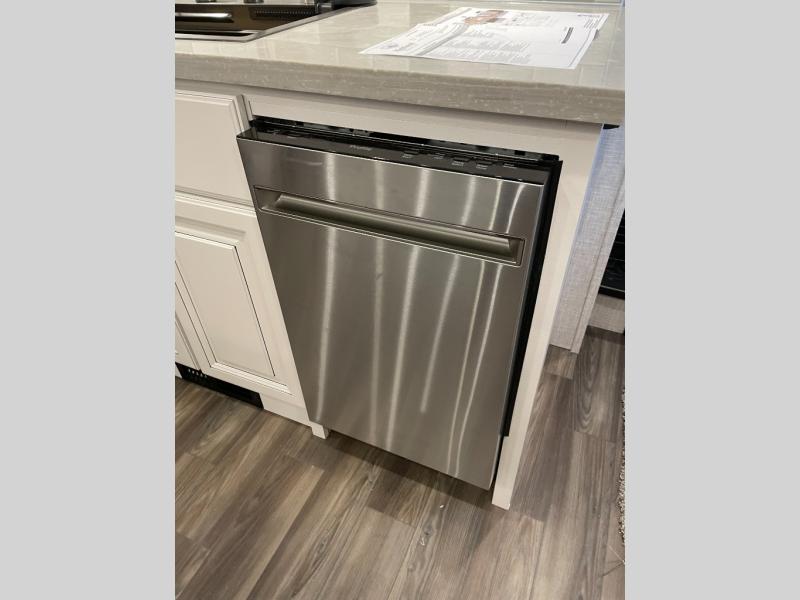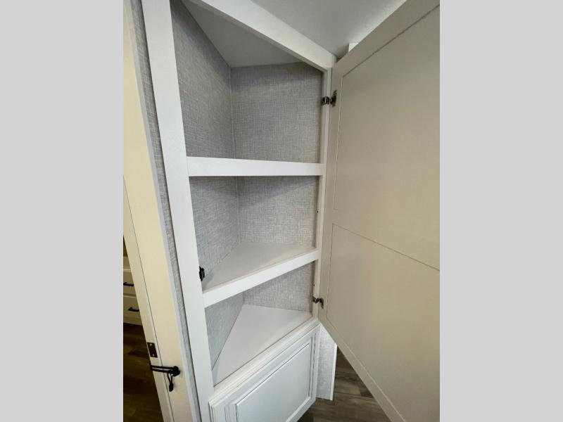 If you enjoy luxury camping or you're looking for a residential fifth wheel to go full-time in, this Open Range 3X is the one! The middle kitchen and living room is made open by the dual opposing slides, and your crew can get comfortable on the mega lounge with two tables. The chef of your group will love cooking on GE free-standing four burner range, or they can use the GE residential microwave to heat up leftovers. The standard dishwasher and central vacuum make cleanup a breeze. A waterfall island with four chairs will provide a place to dine and the hidden pantry behind the swing-out entertainment center can hold snacks galore. There is also a fireplace and smart HDTV to make movie nights cozy. The front master bedroom includes a slide out king bed with a power base, two dressers, a large front closet, and a 32" TV to watch shows in bed. You even have your own entrance into the full bath plus washer and dryer prep if you choose to add those appliances. The rear master bedroom is just as accommodating with its queen bed slide out, wardrobe and dresser, plus second full bath with its own exterior entry door. And the loft above the rear bedroom provides even more sleeping space.