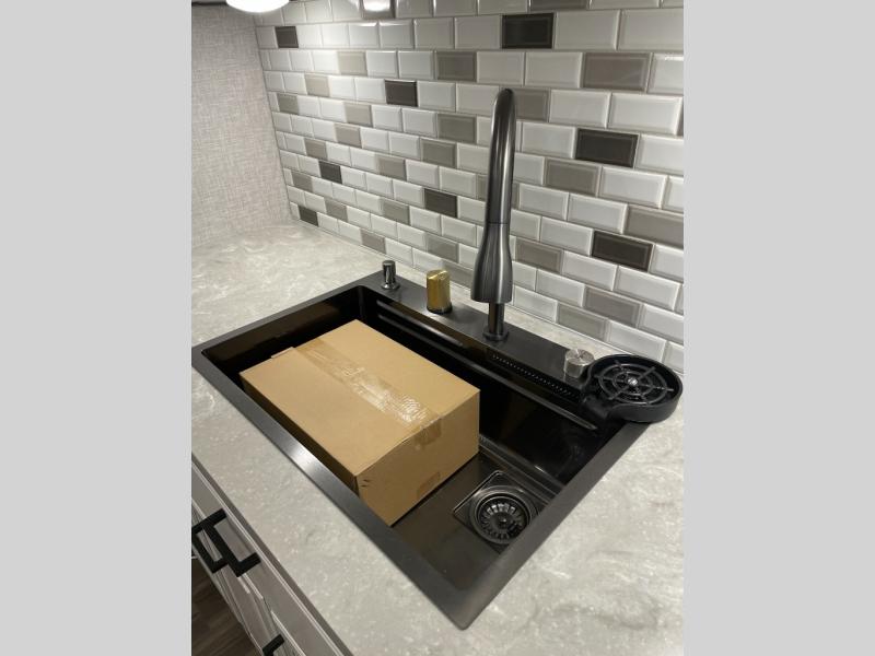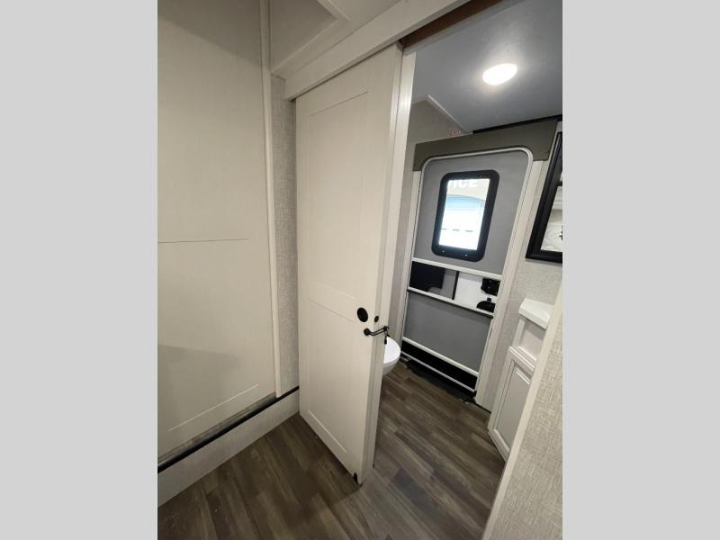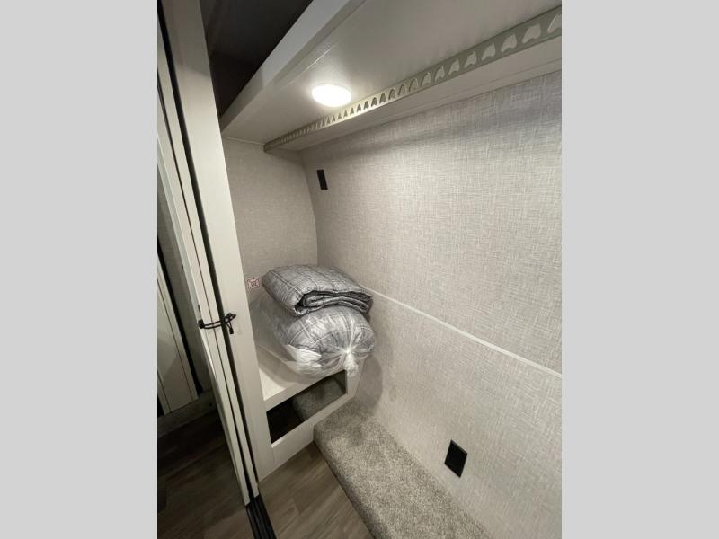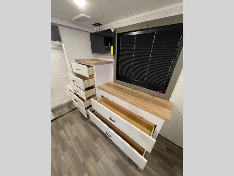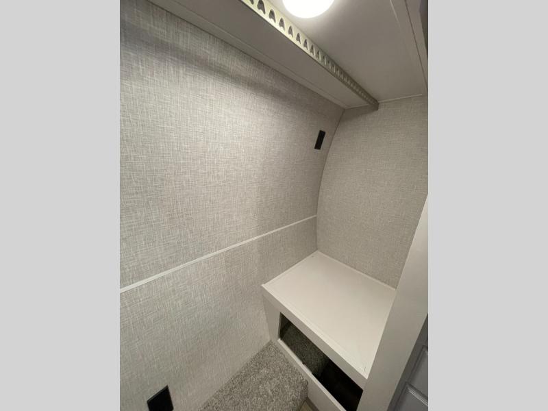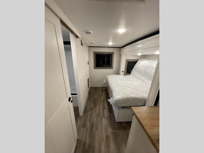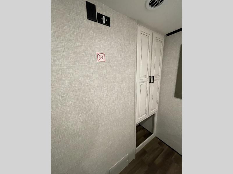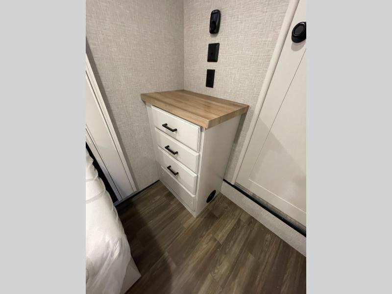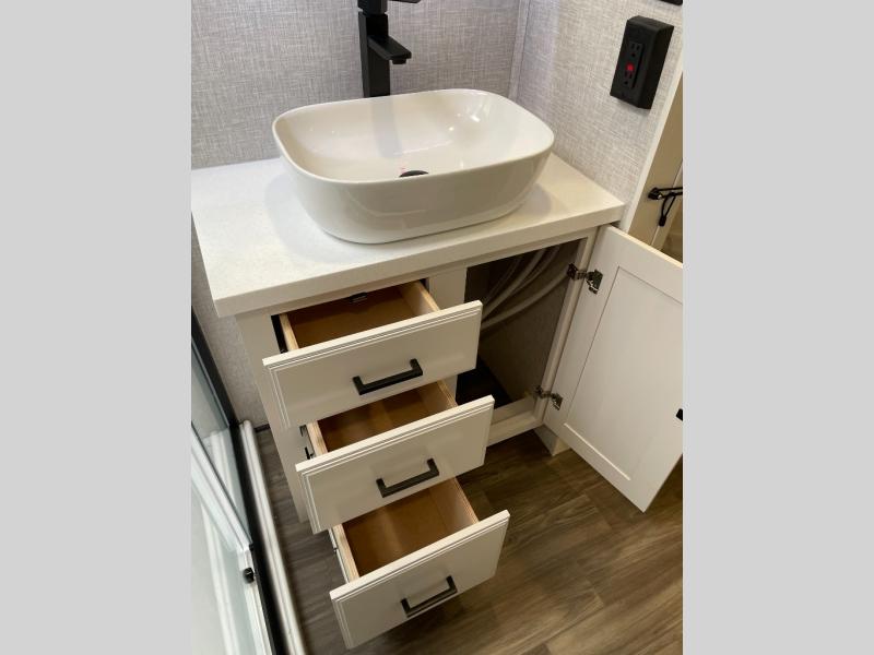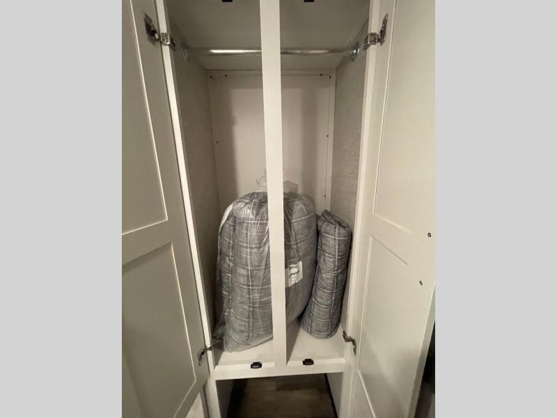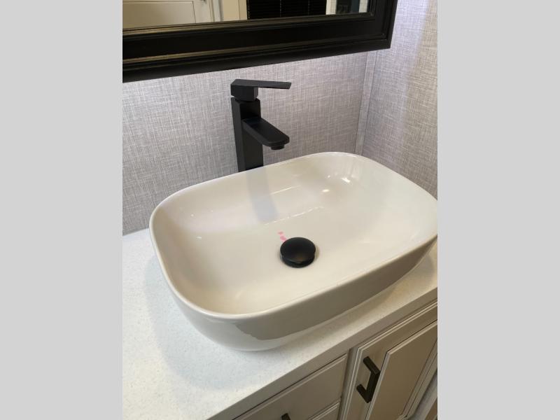 If you enjoy luxury camping or you're looking for a residential fifth wheel to go full-time in, this Open Range 3X is the one! The middle kitchen and living room is made open by the dual opposing slides, and your crew can get comfortable on the mega lounge with two tables. The chef of your group will love cooking on GE free-standing four burner range, or they can use the GE residential microwave to heat up leftovers. The standard dishwasher and central vacuum make cleanup a breeze. A waterfall island with four chairs will provide a place to dine and the hidden pantry behind the swing-out entertainment center can hold snacks galore. There is also a fireplace and smart HDTV to make movie nights cozy. The front master bedroom includes a slide out king bed with a power base, two dressers, a large front closet, and a 32" TV to watch shows in bed. You even have your own entrance into the full bath plus washer and dryer prep if you choose to add those appliances. The rear master bedroom is just as accommodating with its queen bed slide out, wardrobe and dresser, plus second full bath with its own exterior entry door. And the loft above the rear bedroom provides even more sleeping space.