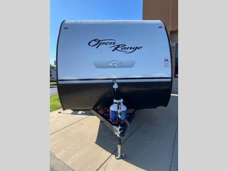 The affordable Open Range Conventional travel trailers by Highland Ridge are ready to meet your camping needs! You will appreciate the durable Magnum Roof system, plus each model is constructed with black front diamond plate protection, 5/8" main floor decking, and self-adjusting electric brakes with E-Z Lube axles for smooth towing. The 81" interior height means you won't feel cramped when relaxing with friends and family, and the residential vinyl flooring throughout is easy to clean, which will be perfect if you're camping with little ones or pets. These models also include a ceiling mount Bluetooth speaker, a digital TV antenna that will go perfectly with the optional Smart TV, plus a 13,500 BTU roof mounted A/C to keep you cool on those hot summer months.