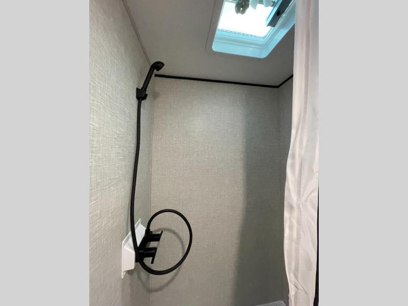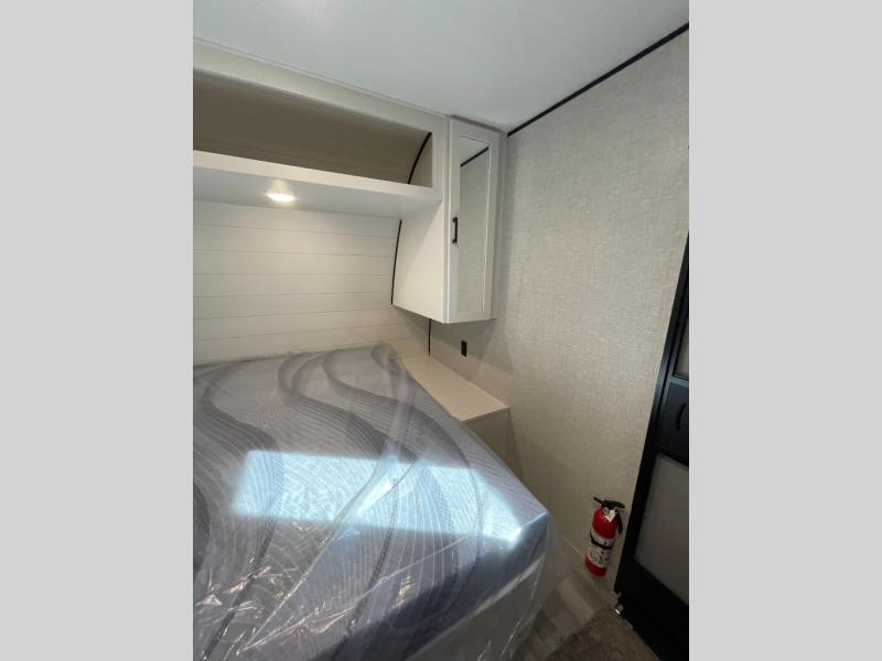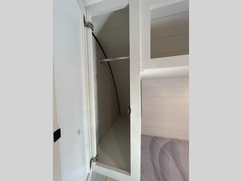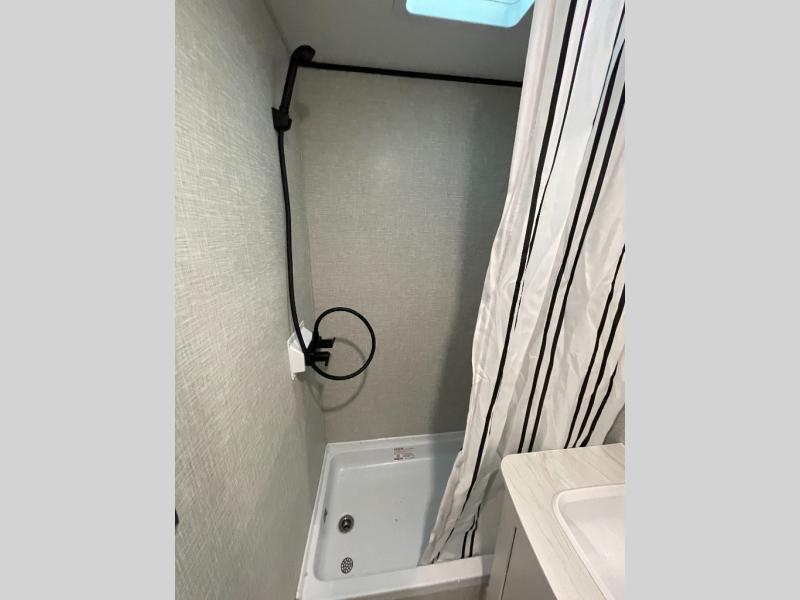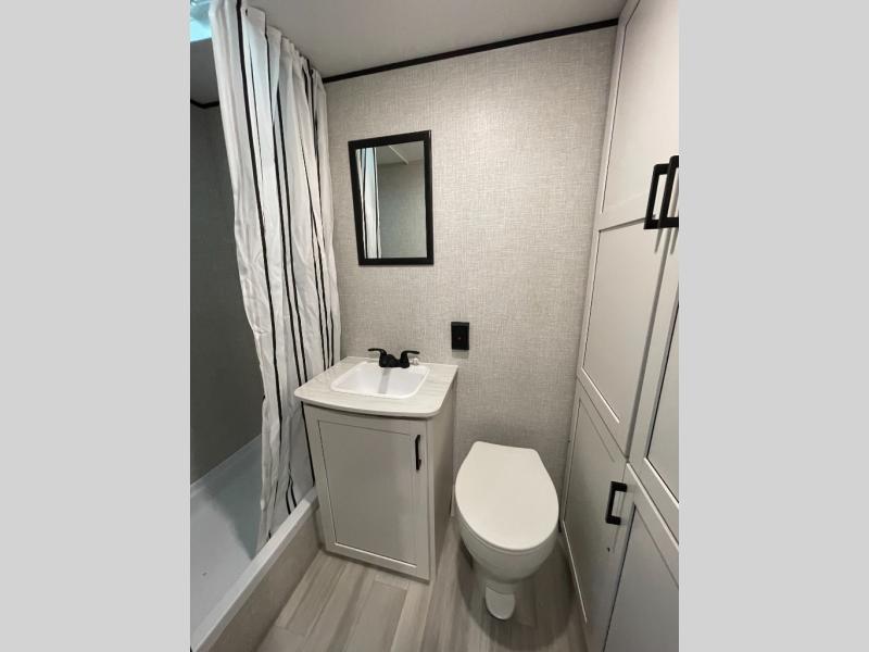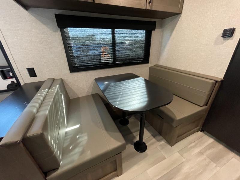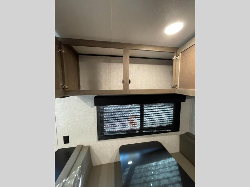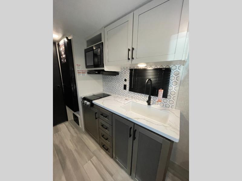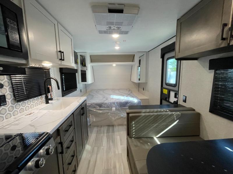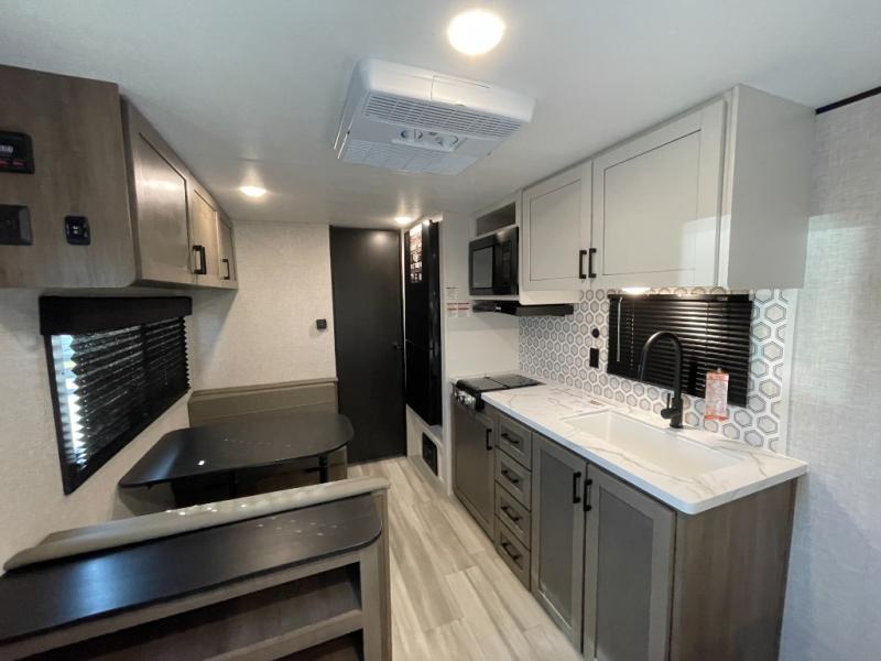 Head to the lake or the woods in this cozy travel trailer that can sleep three to four each night. There is a bed up front with dual wardrobes on either side of the bed, plus a booth dinette for guests. You will appreciate plenty of overhead storage for all your belongings, and the full rear bath is both spacious and tucked away for privacy. This model also has everything needed each day to prepare at-home meals, including a microwave oven and a two burner cooktop.