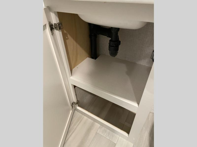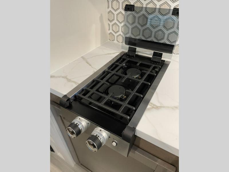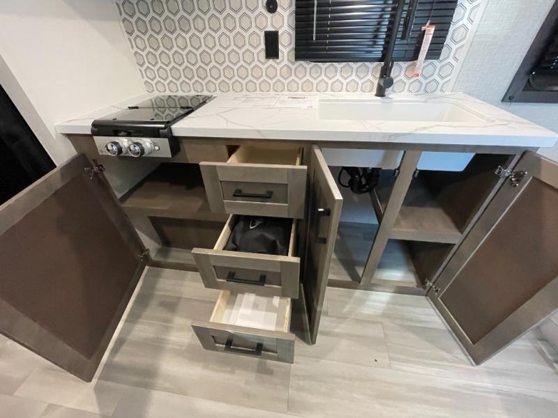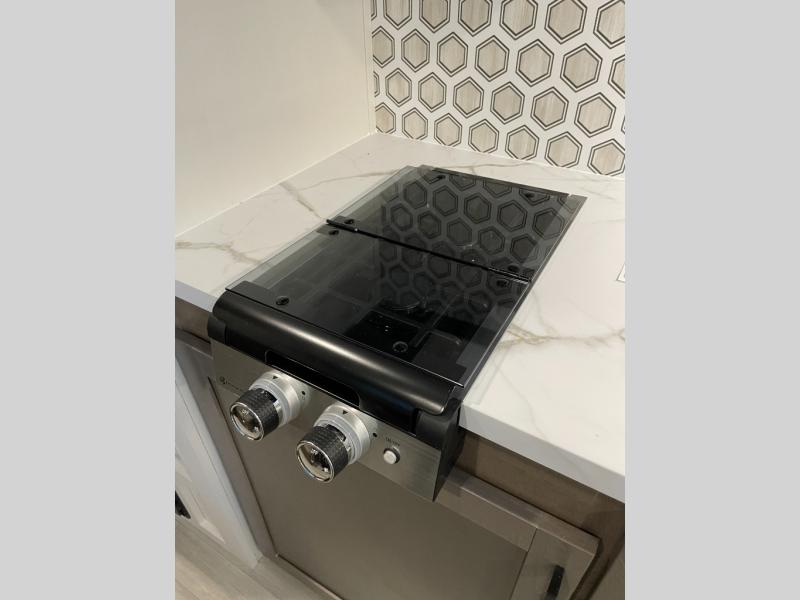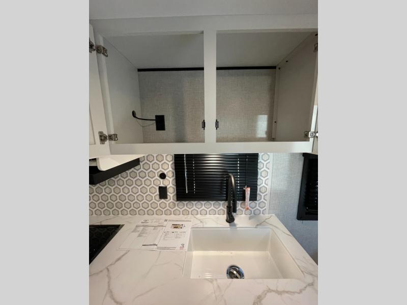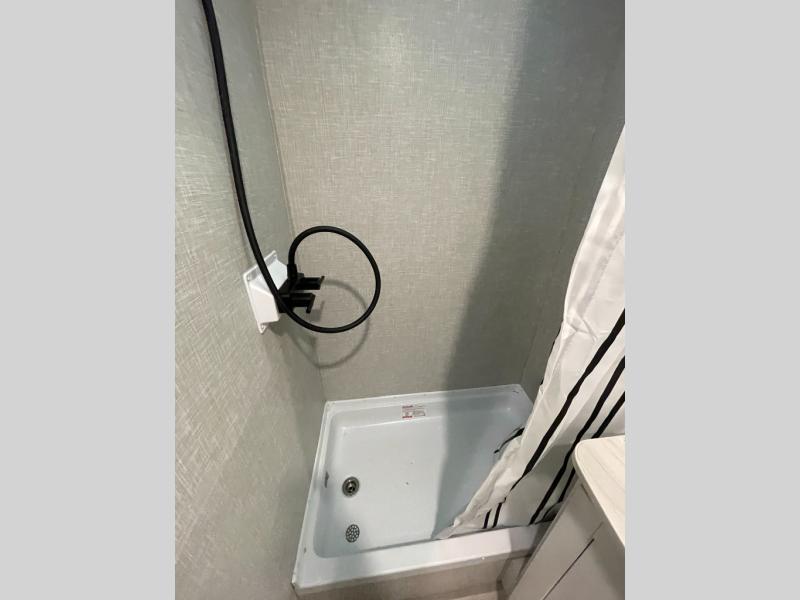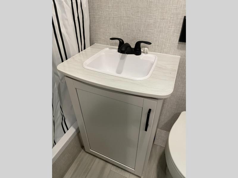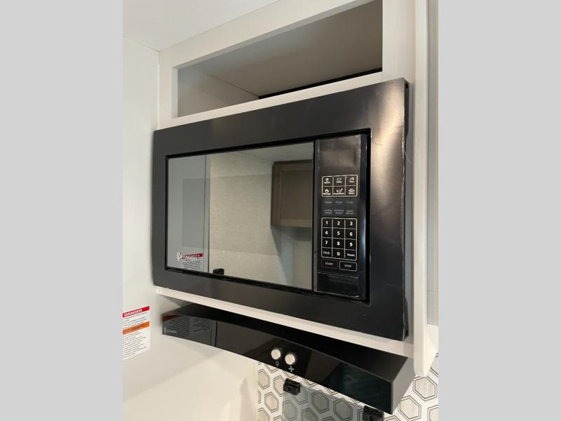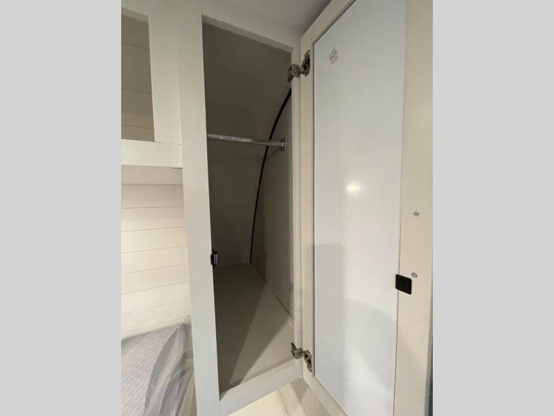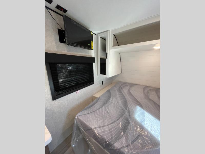 Head to the lake or the woods in this cozy travel trailer that can sleep three to four each night. There is a bed up front with dual wardrobes on either side of the bed, plus a booth dinette for guests. You will appreciate plenty of overhead storage for all your belongings, and the full rear bath is both spacious and tucked away for privacy. This model also has everything needed each day to prepare at-home meals, including a microwave oven and a two burner cooktop.