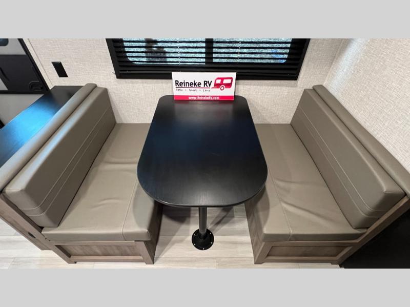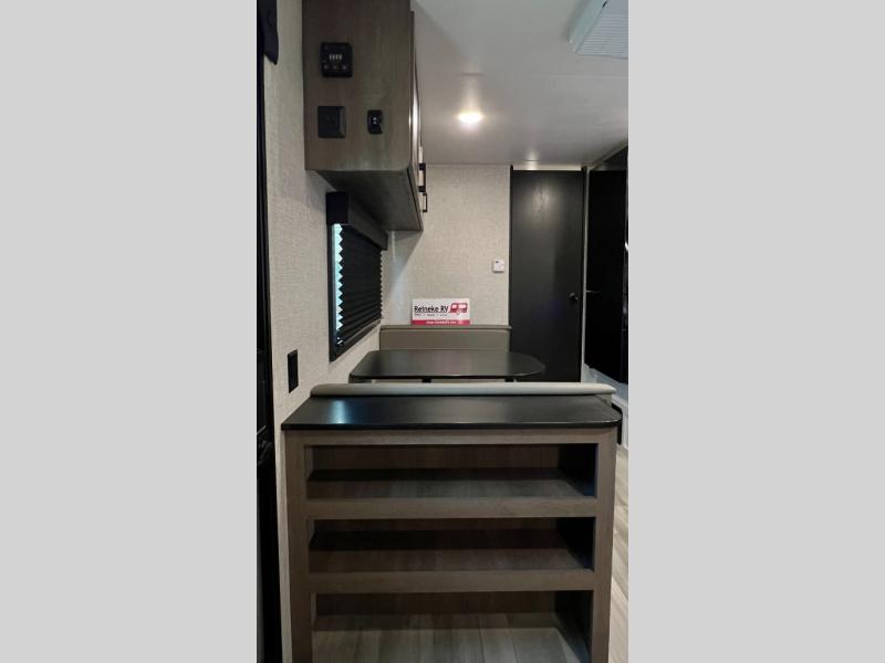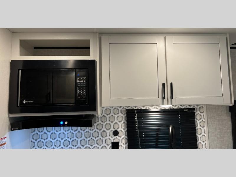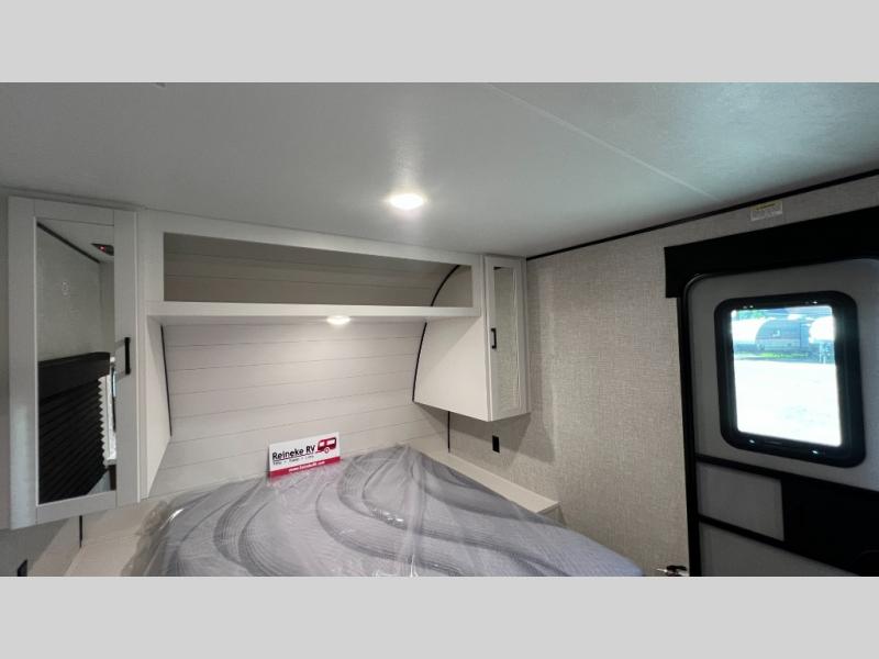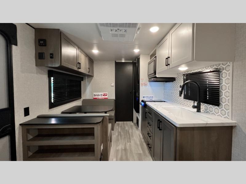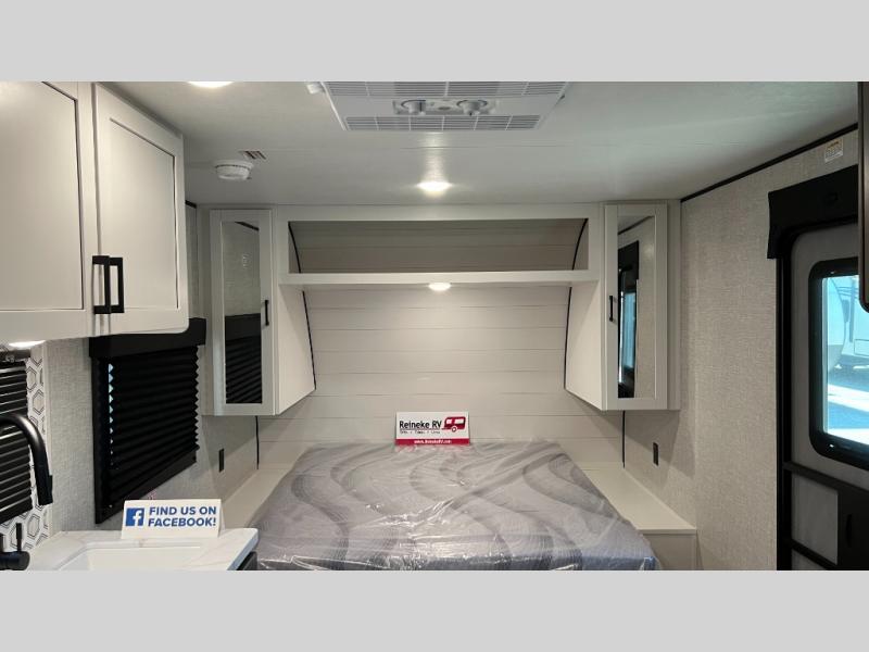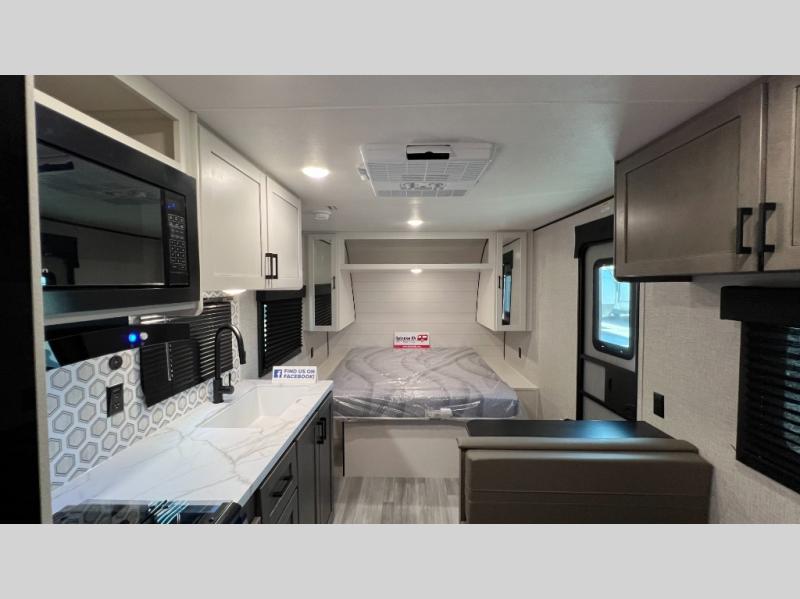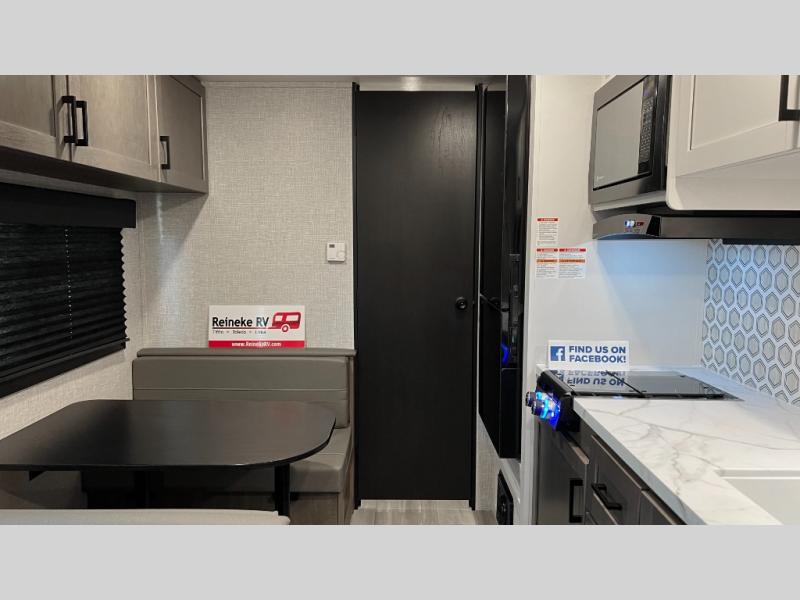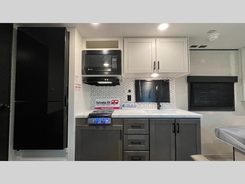 Head to the lake or the woods in this cozy travel trailer that can sleep three to four each night. There is a bed up front with dual wardrobes on either side of the bed, plus a booth dinette for guests. You will appreciate plenty of overhead storage for all your belongings, and the full rear bath is both spacious and tucked away for privacy. This model also has everything needed each day to prepare at-home meals, including a microwave oven and a two burner cooktop.