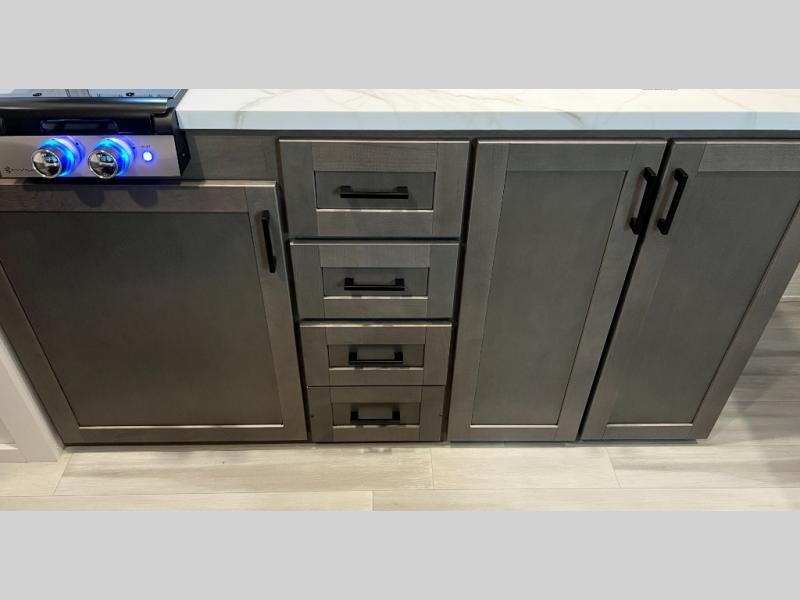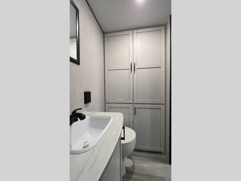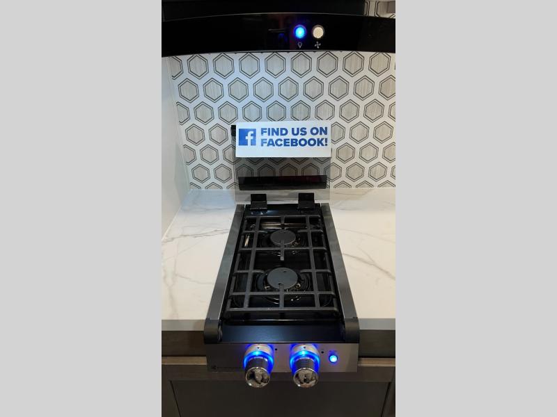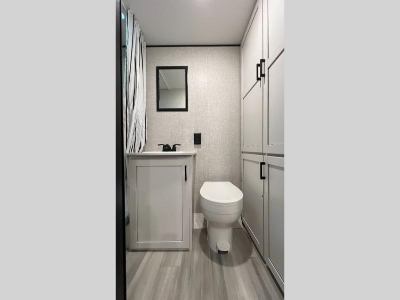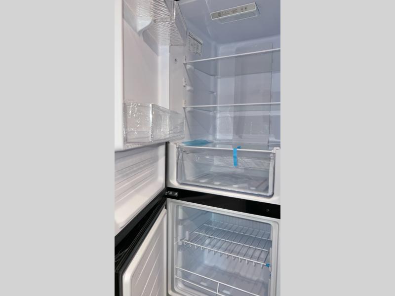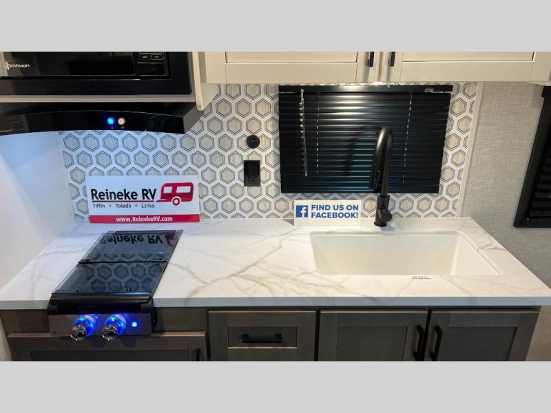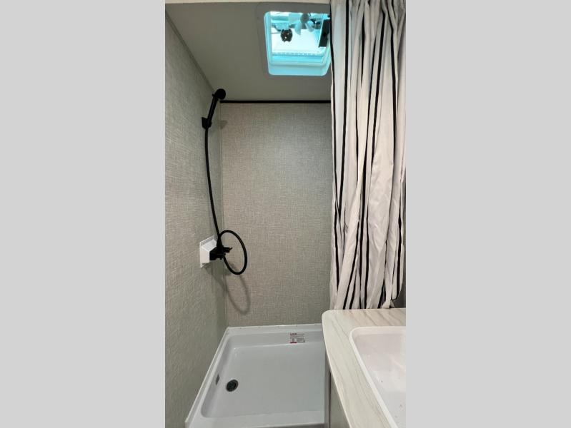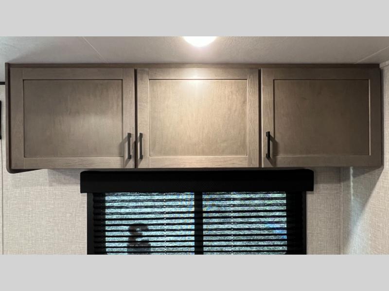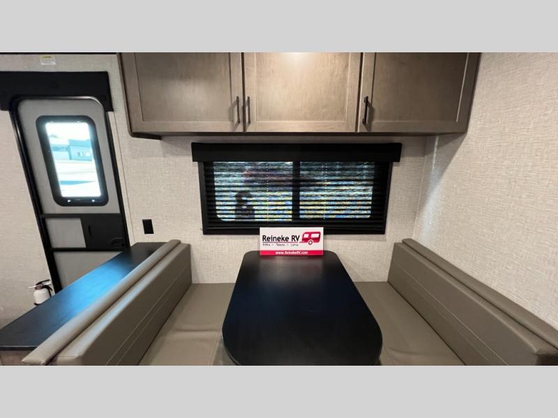 Head to the lake or the woods in this cozy travel trailer that can sleep three to four each night. There is a bed up front with dual wardrobes on either side of the bed, plus a booth dinette for guests. You will appreciate plenty of overhead storage for all your belongings, and the full rear bath is both spacious and tucked away for privacy. This model also has everything needed each day to prepare at-home meals, including a microwave oven and a two burner cooktop.