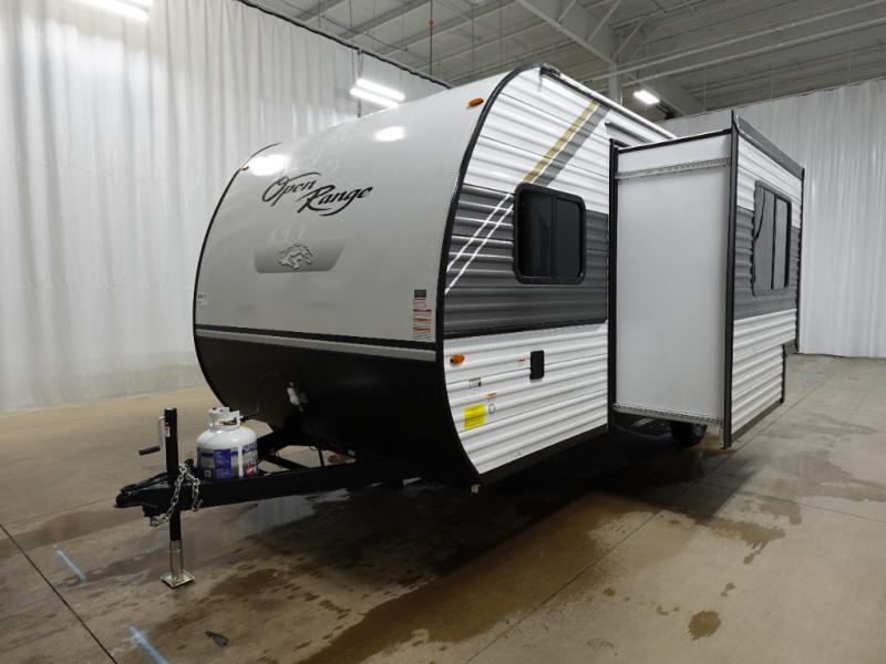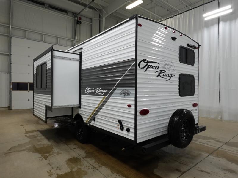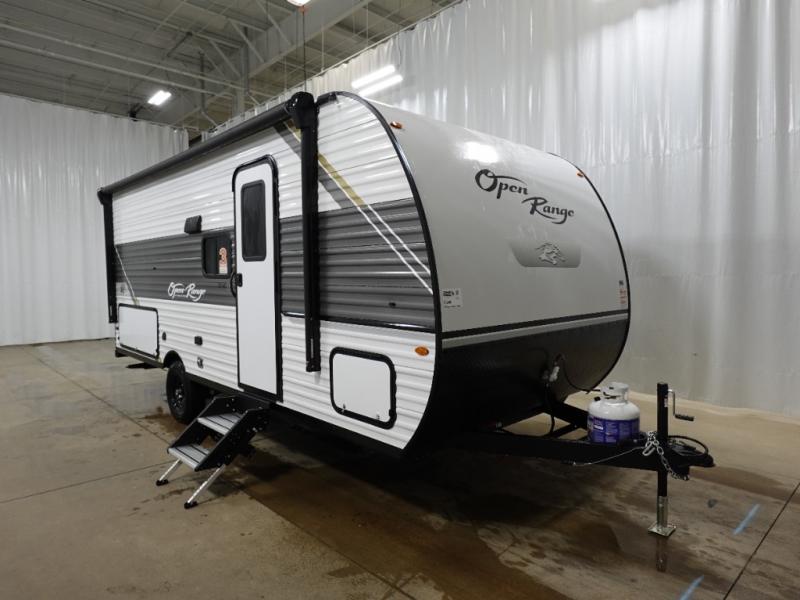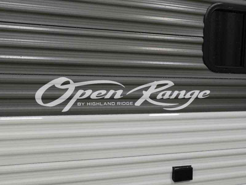 The affordable Open Range Conventional travel trailers by Highland Ridge are ready to meet your camping needs! You will appreciate the durable Magnum Roof system, plus each model is constructed with black front diamond plate protection, 5/8" main floor decking, and self-adjusting electric brakes with E-Z Lube axles for smooth towing. The 81" interior height means you won't feel cramped when relaxing with friends and family, and the residential vinyl flooring throughout is easy to clean, which will be perfect if you're camping with little ones or pets. These models also include ceiling mount Bluetooth speaker, a digital TV antenna that will go perfectly with the optional Smart TV, plus a 13,500 BTU roof mounted A/C to keep you cool on those hot summer months.