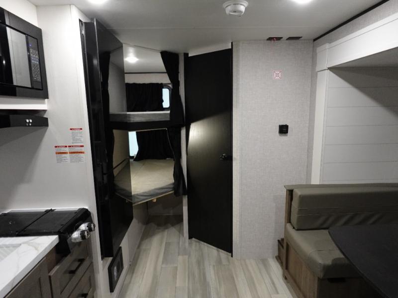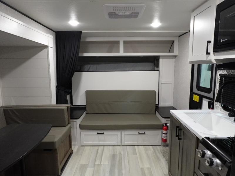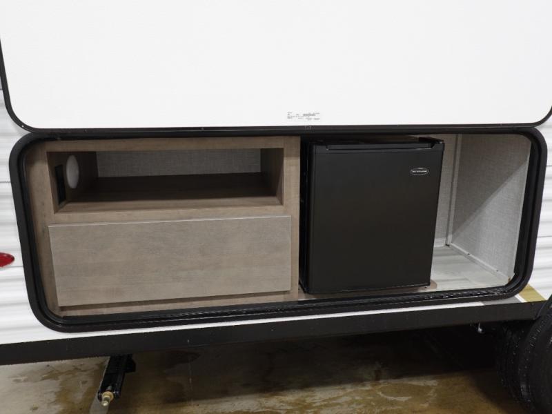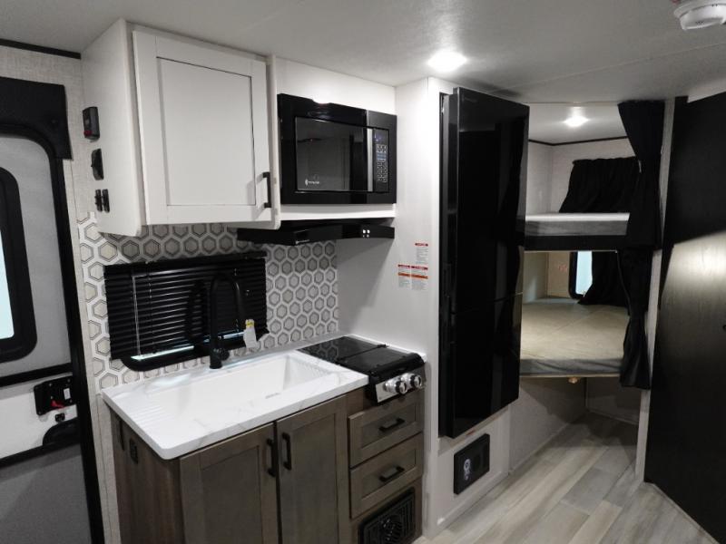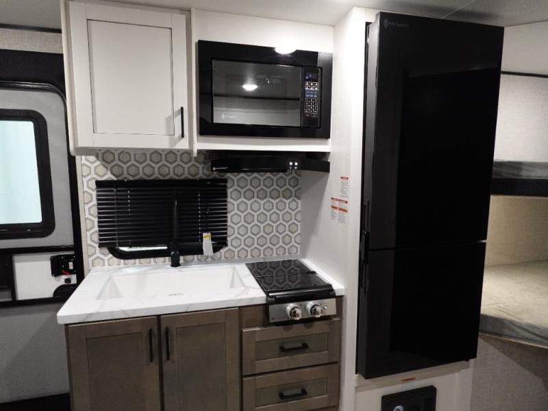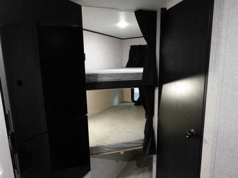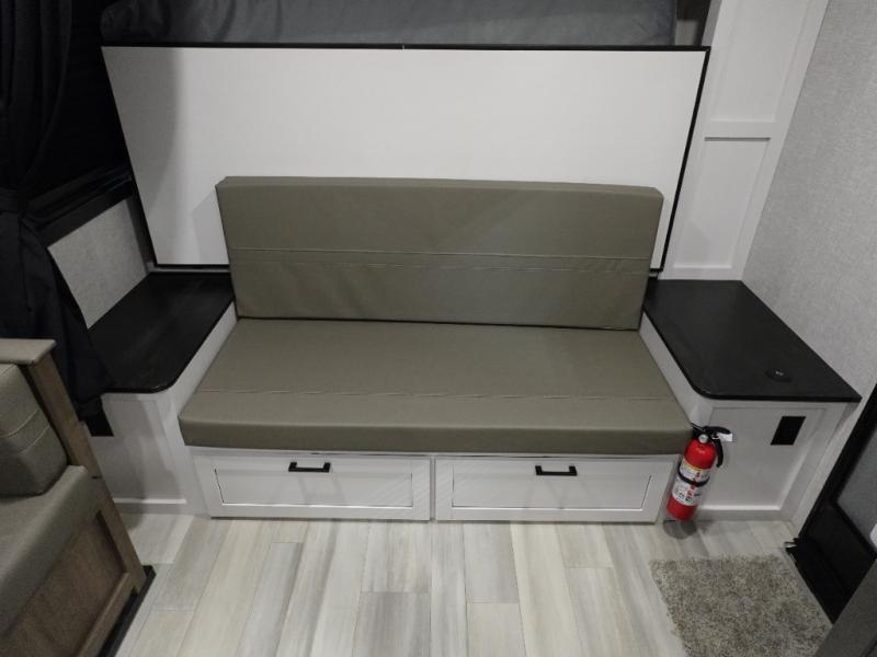 This travel trailer has everything the whole family will need for a comfortable camping trip! The kiddos can sleep on the set of double-size bunk beds, and you can sleep on the front 60" x 76" Murphy bed once converted from the sofa. You could even transform the U-shaped dinette slide into an extra sleeping space when you aren't using it to enjoy a meal prepared with the two burner range. There is even an outside kitchen with a refrigerator to enjoy a cold beverage while you cook dinner and watch the kids play a game of catch. After a fun day at the beach, head to the rear corner bathroom and wash the sand out of your hair in the tub/shower!