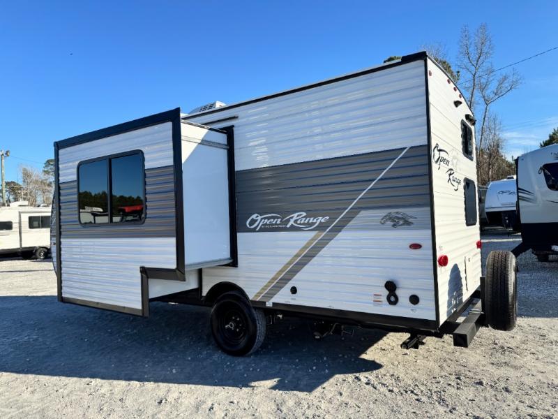 The affordable Open Range Conventional travel trailers by Highland Ridge are ready to meet your camping needs! You will appreciate the durable Magnum Roof system, plus each model is constructed with black front diamond plate protection, 5/8" main floor decking, and self-adjusting electric brakes with E-Z Lube axles for smooth towing. The 81" interior height means you won't feel cramped when relaxing with friends and family, and the residential vinyl flooring throughout is easy to clean, which will be perfect if you're camping with little ones or pets. These models also include ceiling mount Bluetooth speaker, a digital TV antenna that will go perfectly with the optional Smart TV, plus a 13,500 BTU roof mounted A/C to keep you cool on those hot summer months.