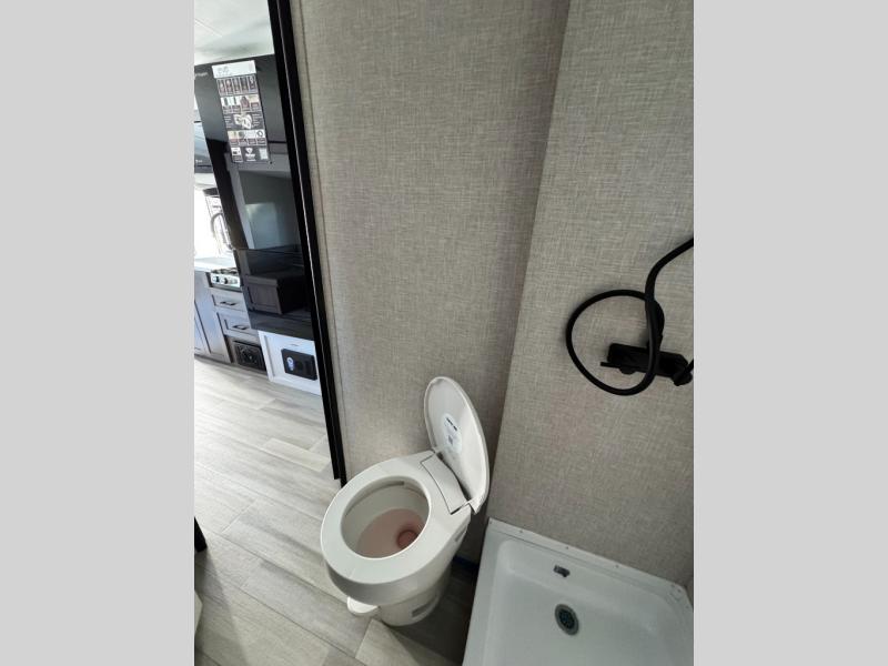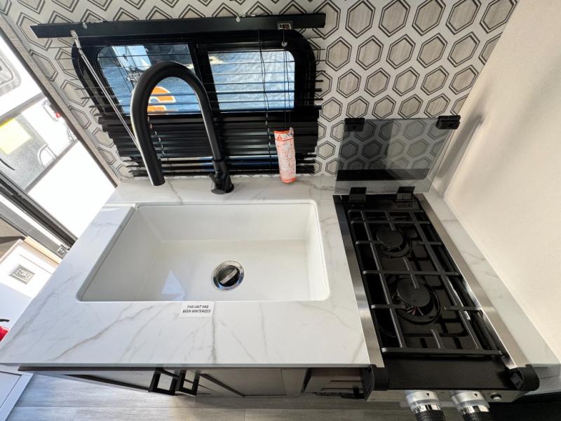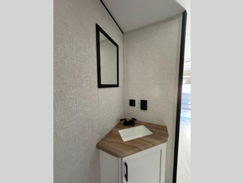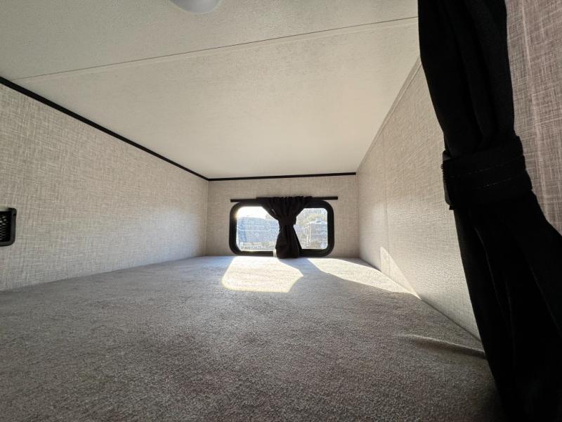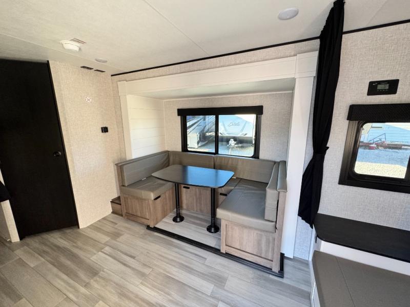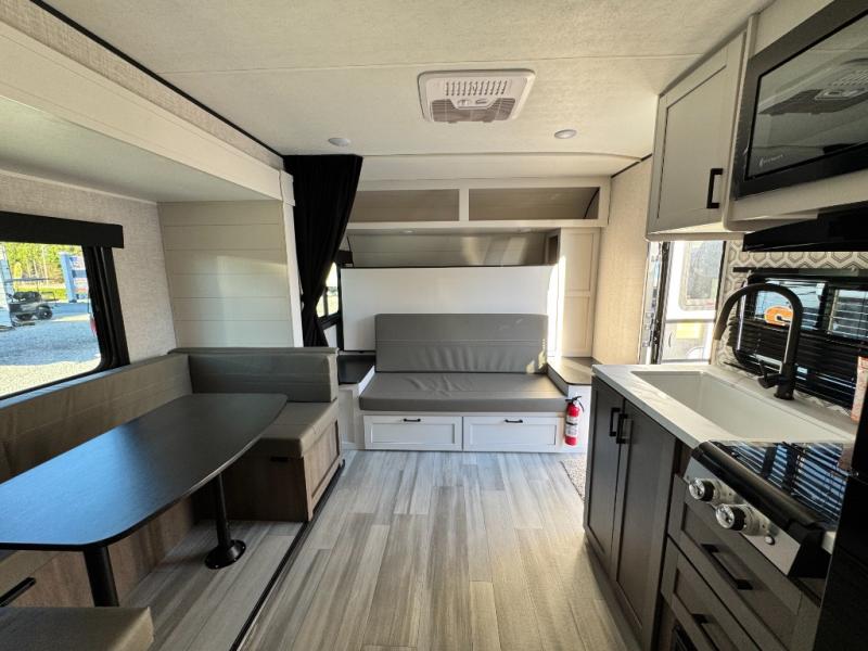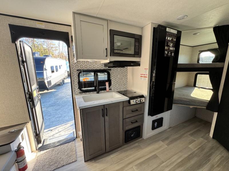 : This travel trailer has everything the whole family will need for a comfortable camping trip! The kiddos can sleep on the set of double-size bunk beds, and you can sleep on the front 60" x 76" Murphy bed once converted from the sofa. You could even transform the U-shaped dinette slide into an extra sleeping space when you aren't using it to enjoy a meal prepared with the two burner range. There is even an outside kitchen with a refrigerator to enjoy a cold beverage while you cook dinner and watch the kids play a game of catch. After a fun day at the beach, head to the rear corner bathroom and wash the sand out of your hair in the tub/shower!