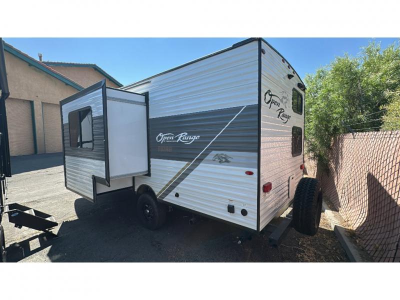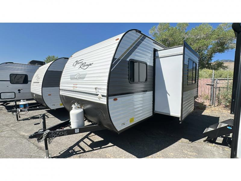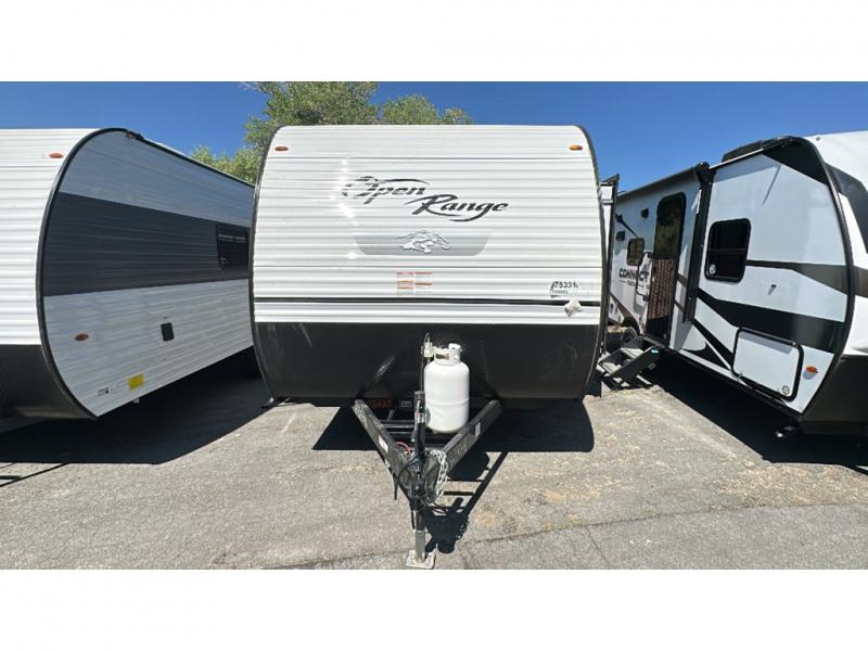 The affordable Open Range Conventional travel trailers by Highland Ridge are ready to meet your camping needs! You will appreciate the durable Magnum Roof system, plus each model is constructed with black front diamond plate protection, 5/8" main floor decking, and self-adjusting electric brakes with E-Z Lube axles for smooth towing. The 81" interior height means you won't feel cramped when relaxing with friends and family, and the residential vinyl flooring throughout is easy to clean, which will be perfect if you're camping with little ones or pets. These models also include ceiling mount Bluetooth speaker, a digital TV antenna that will go perfectly with the optional Smart TV, plus a 13,500 BTU roof mounted A/C to keep you cool on those hot summer months.