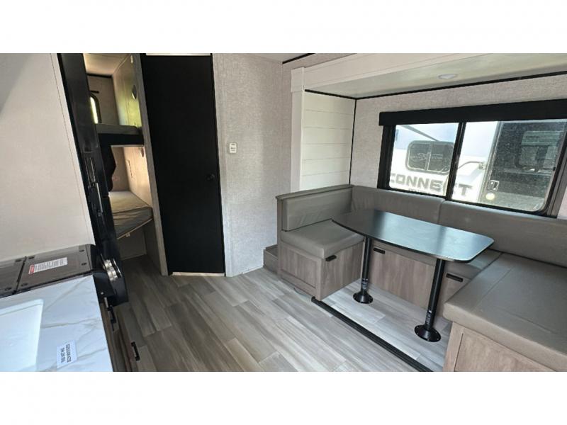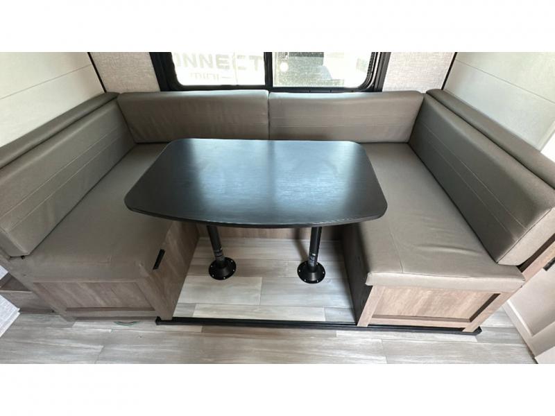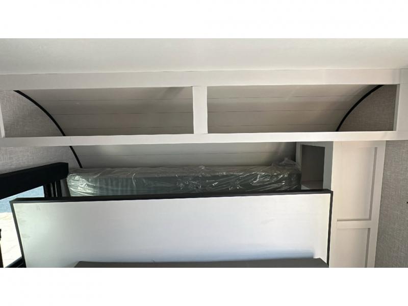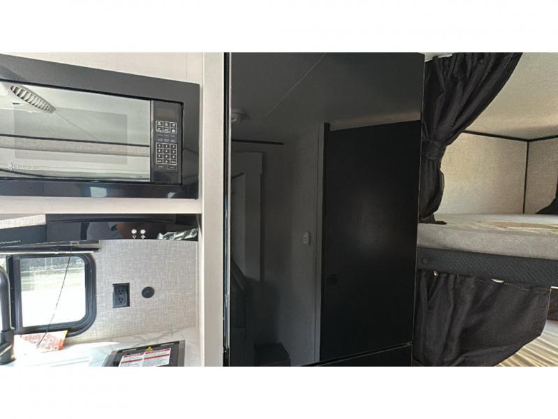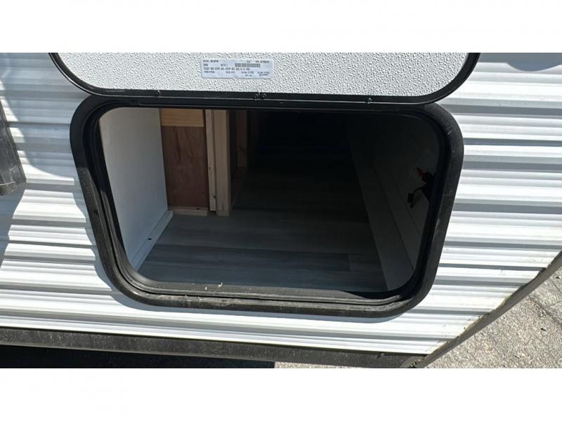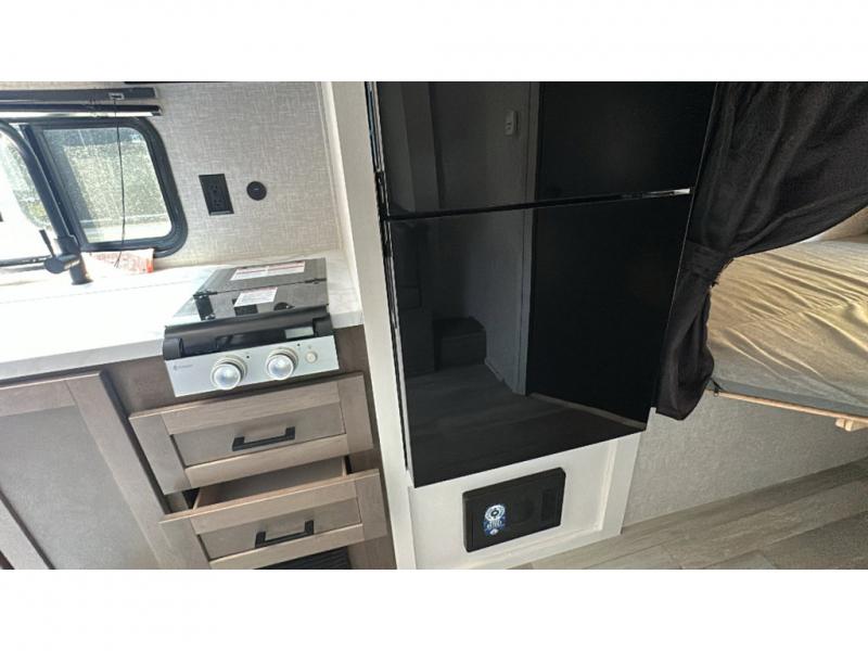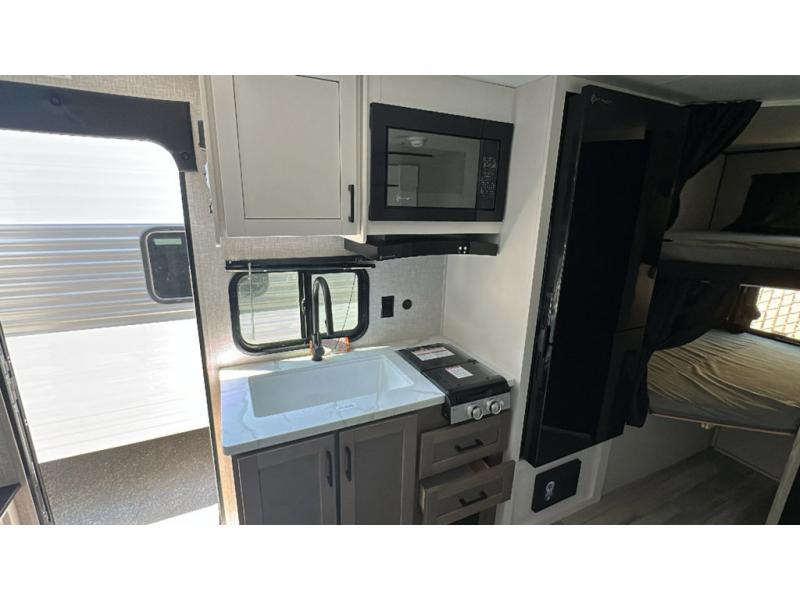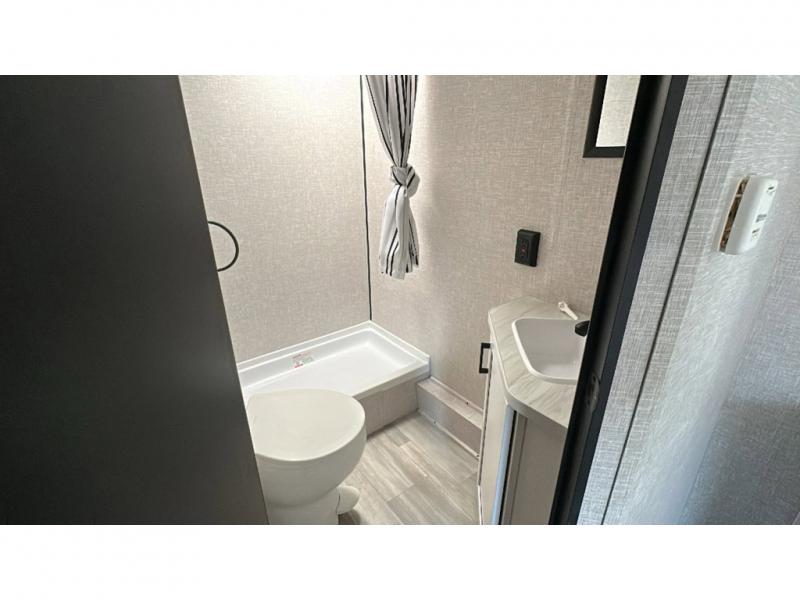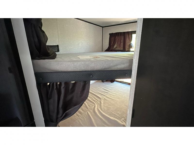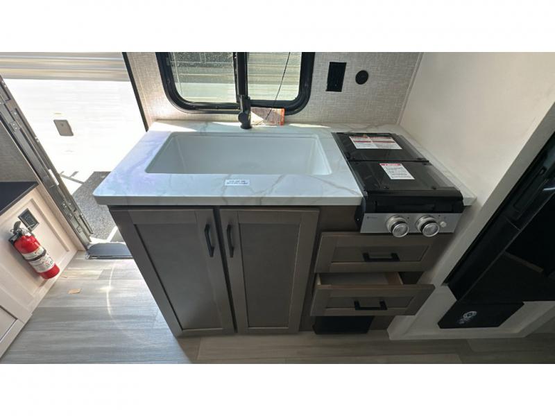 This travel trailer has everything the whole family will need for a comfortable camping trip! The kiddos can sleep on the set of double-size bunk beds, and you can sleep on the front 60" x 76" Murphy bed once converted from the sofa. You could even transform the U-shaped dinette slide into an extra sleeping space when you aren't using it to enjoy a meal prepared with the two burner range. There is even an outside kitchen with a refrigerator to enjoy a cold beverage while you cook dinner and watch the kids play a game of catch. After a fun day at the beach, head to the rear corner bathroom and wash the sand out of your hair in the tub/shower!