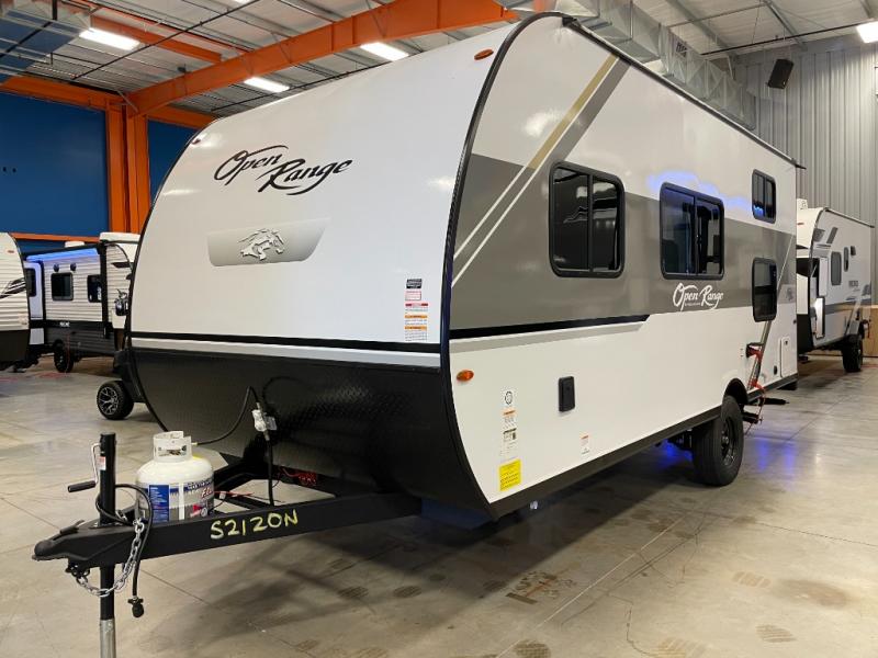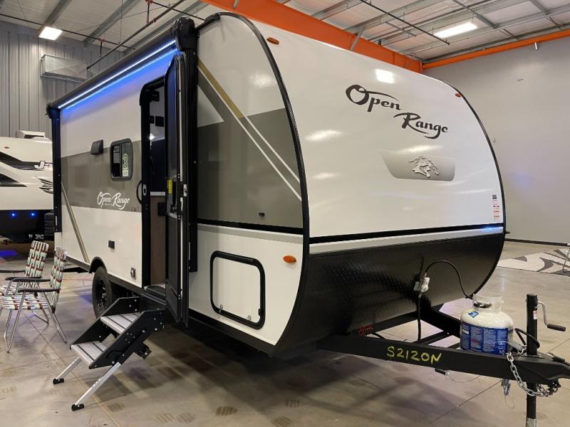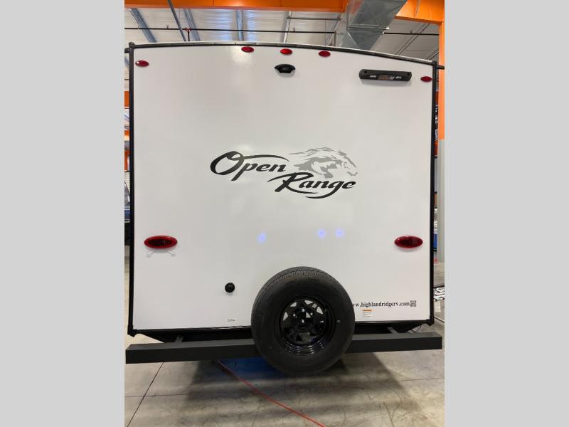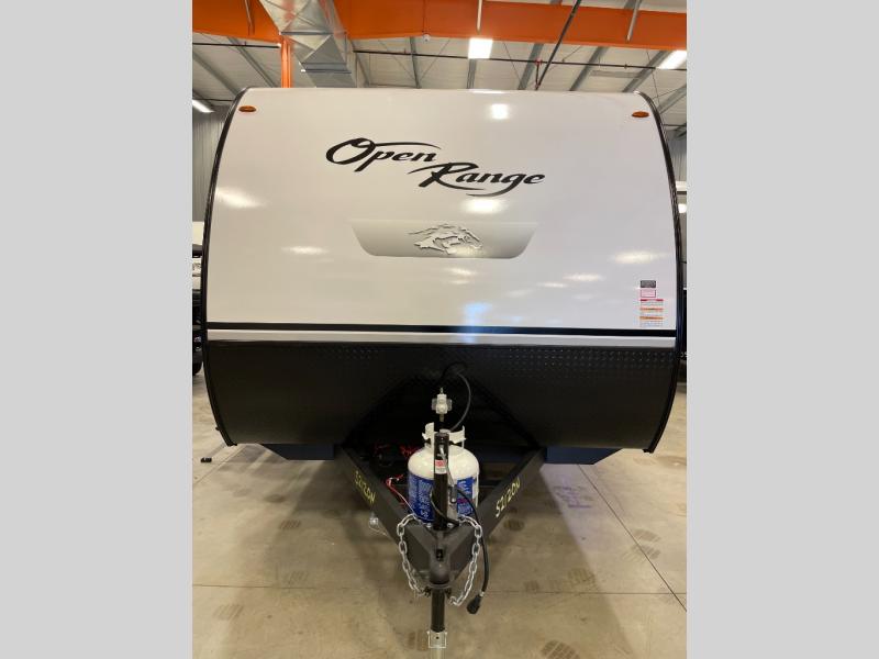The affordable Open Range Conventional travel trailers by Highland Ridge are ready to meet your camping needs! You will appreciate the durable Magnum Roof system, plus each model is constructed with black front diamond plate protection, 5/8" main floor decking, and self-adjusting electric brakes with E-Z Lube axles for smooth towing. The 81" interior height means you won't feel cramped when relaxing with friends and family, and the residential vinyl flooring throughout is easy to clean, which will be perfect if you're camping with little ones or pets. These models also include a ceiling mount Bluetooth speaker, a digital TV antenna that will go perfectly with the optional Smart TV, plus a 13,500 BTU roof mounted A/C to keep you cool on those hot summer months.