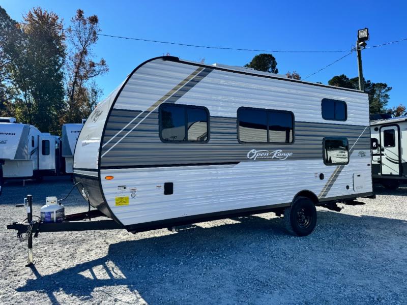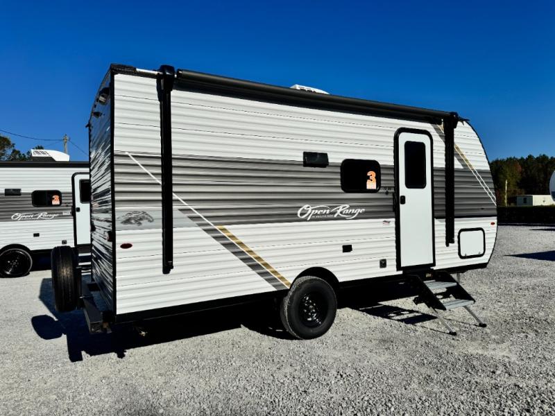 The affordable Open Range Conventional travel trailers by Highland Ridge are ready to meet your camping needs! You will appreciate the durable Magnum Roof system, plus each model is constructed with black front diamond plate protection, 5/8" main floor decking, and self-adjusting electric brakes with E-Z Lube axles for smooth towing. The 81" interior height means you won't feel cramped when relaxing with friends and family, and the residential vinyl flooring throughout is easy to clean, which will be perfect if you're camping with little ones or pets. These models also include a ceiling mount Bluetooth speaker, a digital TV antenna that will go perfectly with the optional Smart TV, plus a 13,500 BTU roof mounted A/C to keep you cool on those hot summer months.