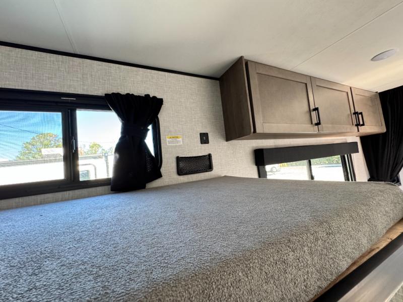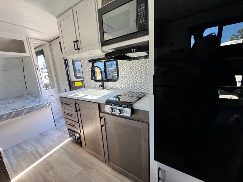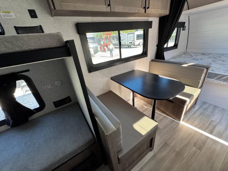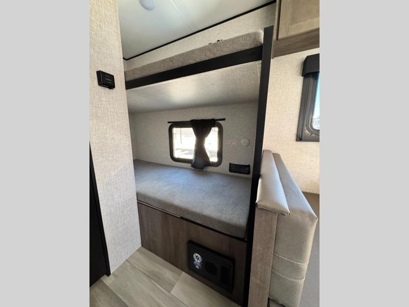 2025 Highland Ridge Open Range Conventional travel trailer 19BH: This single-axle trailer is perfect for outdoor excursions, so head out! You will find bunk beds, a bed up front, plus a booth dinette that can also be sleeping space for one to two people each night. There is a two burner cooktop and a microwave oven to cook breakfast in the morning, and full bath amenities so you can clean up after a long day outdoors. This model also includes outdoor storage that will be perfect for tackle boxes or your tools, and the 13' power awning will provide shade as you visit with friends.