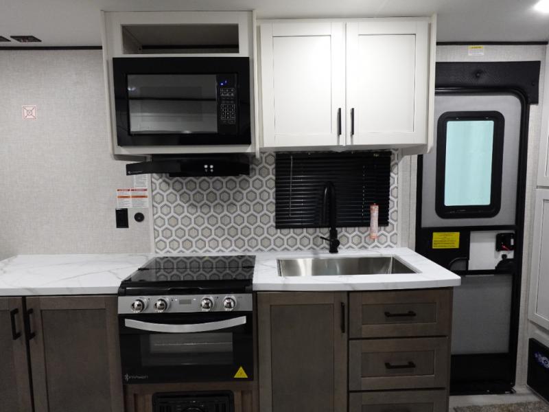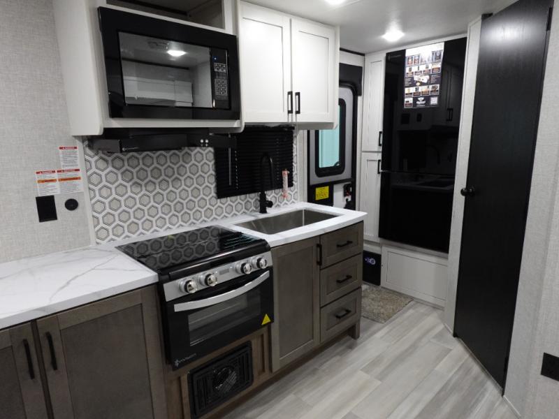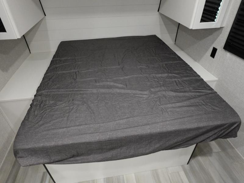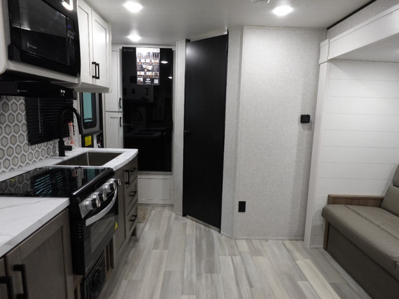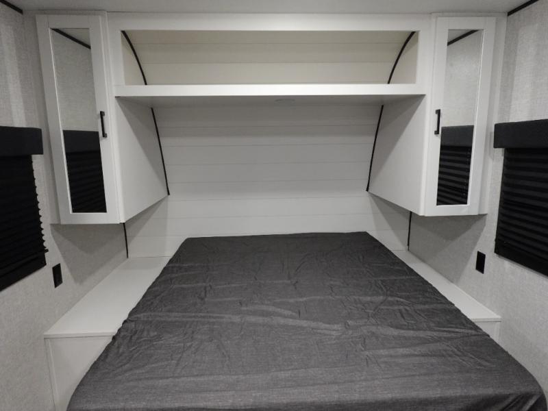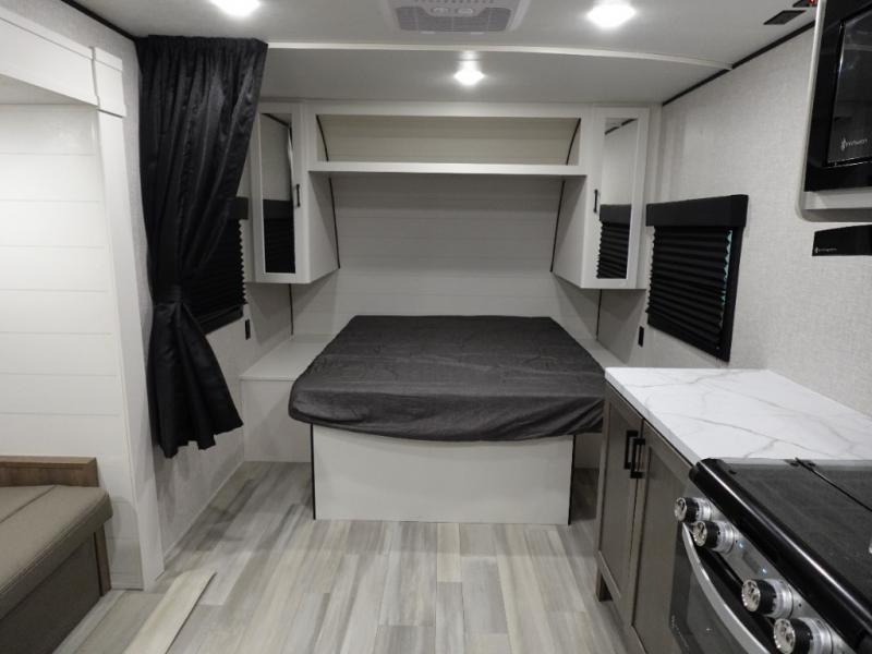 This is the perfect couple's trailer for room for an overnight guest on the jack-knife sofa. You'll appreciate a table in front of the sofa where you can enjoy eating together, and the slide out provides more space to move about. This model includes a front bedroom with a privacy curtain and dual wardrobes to store your clothes for the week, plus there is a full bath towards the back of the unit to stay clean each day. Snacks and paper goods can go in the entryway pantry, and camp gear can be kept in the outdoor storage!