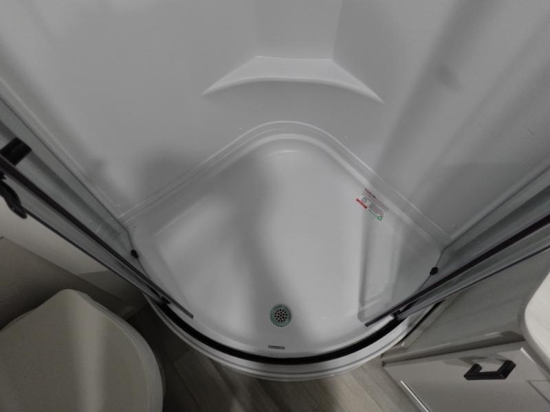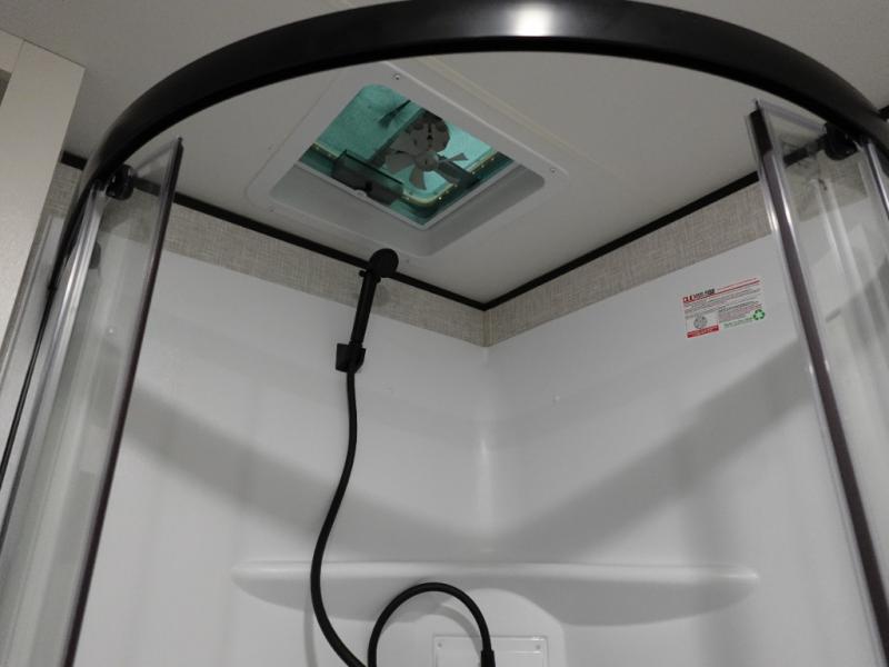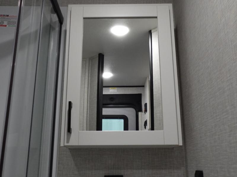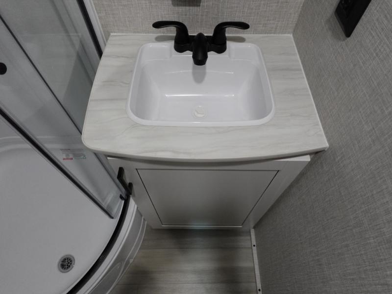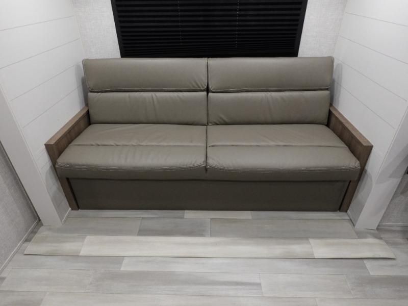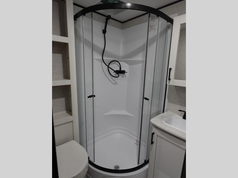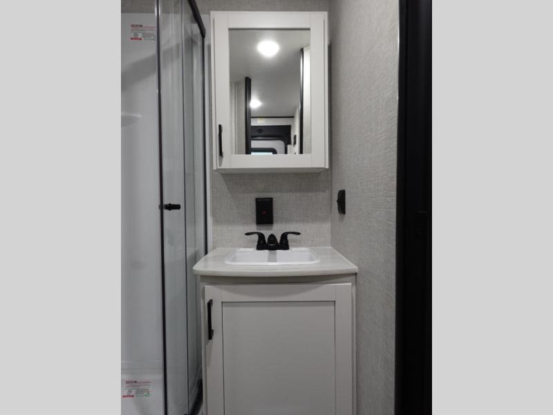 This is the perfect couple's trailer for room for an overnight guest on the jack-knife sofa. You'll appreciate a table in front of the sofa where you can enjoy eating together, and the slide out provides more space to move about. This model includes a front bedroom with a privacy curtain and dual wardrobes to store your clothes for the week, plus there is a full bath towards the back of the unit to stay clean each day. Snacks and paper goods can go in the entryway pantry, and camp gear can be kept in the outdoor storage!