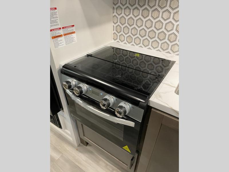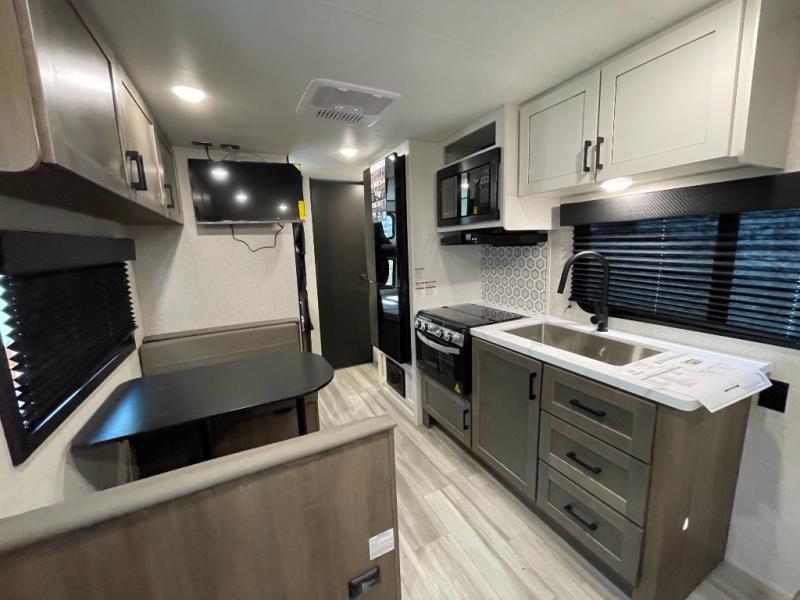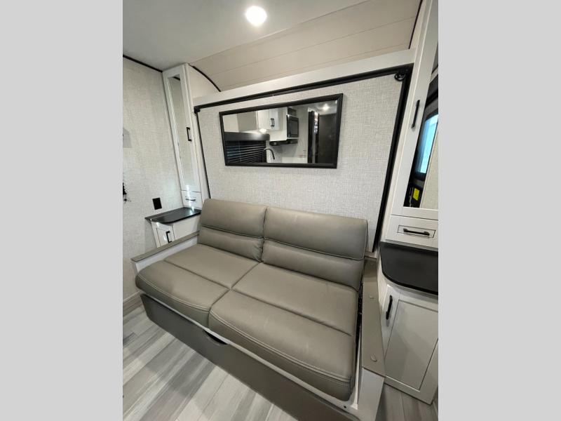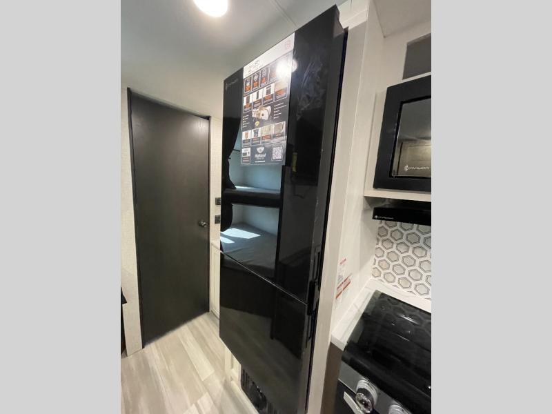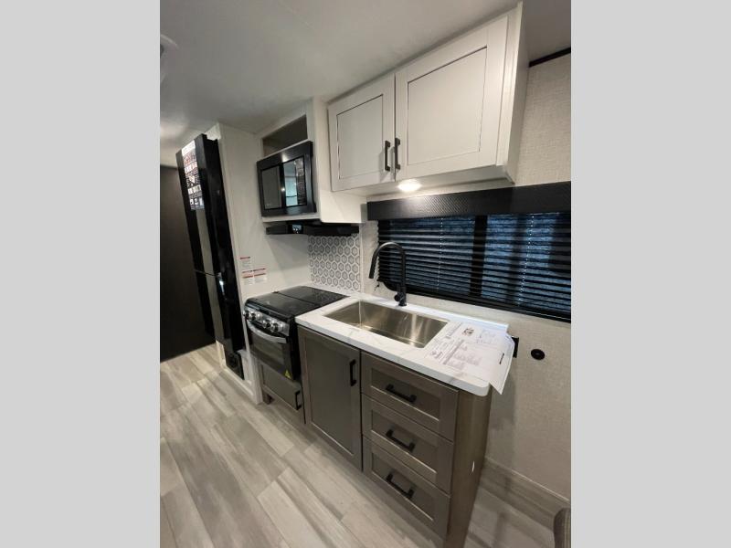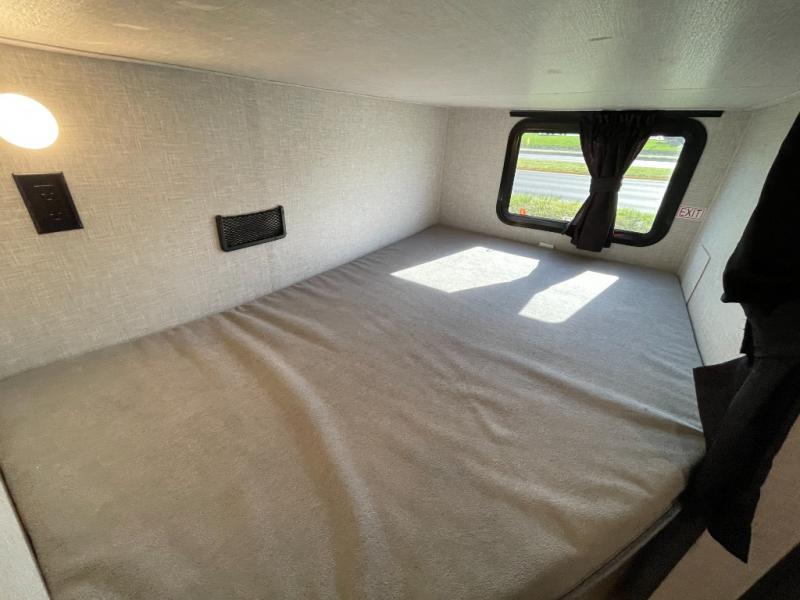 This versatile travel trailer is perfect for those wanting extra seating space during the day and extra sleeping space at night thanks to the Murphy bed. There are dual wardrobes on either side of the bed which will make it feel more like a bedroom at night, and double-size bunks can sleep four, so invite your friends along! Meals can be cooked on the three burner cooktop or in the microwave oven, and you'll appreciate an outdoor grill hookup with LP disconnect if you want to bring your own grill along.