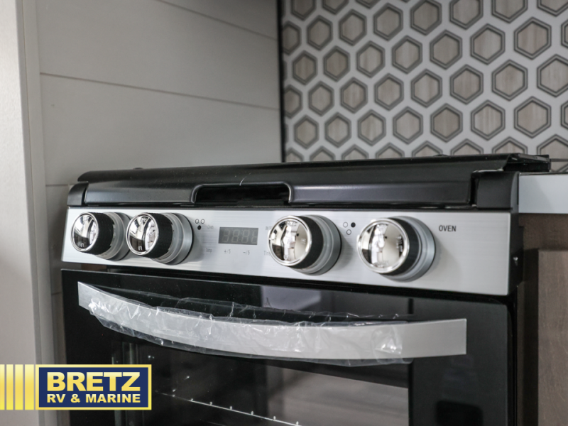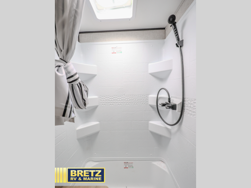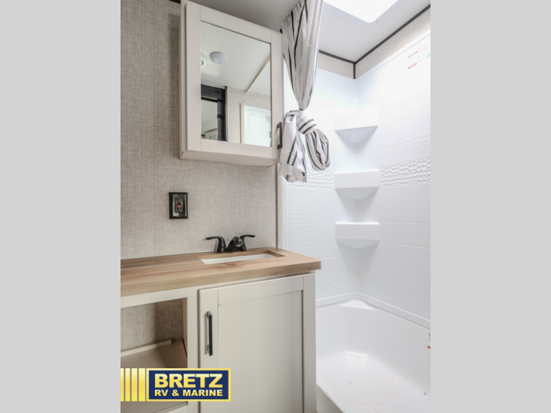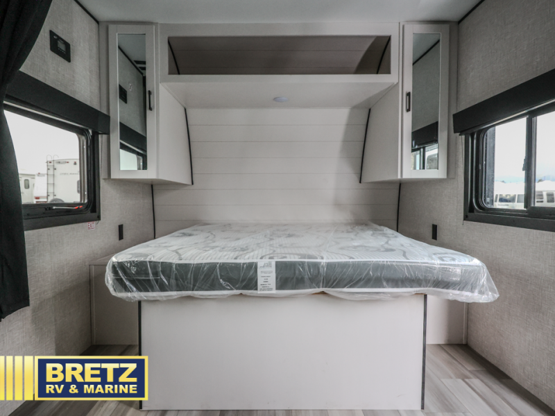 Each camping trip in this travel trailer is sure to bring great memories. You will love having your own bedroom up front with a walk-around bed and dual wardrobes to keep your things organized. The privacy curtain here will be appreciated if you have a guest or two sleeping over on the booth dinette. You'll find theater seating with tables within the large slide out, along with a three burner cooktop and 10 cu. ft. 12V refrigerator. A spacious pantry lets you pack snacks for the whole weekend, and the full bath will keep everyone squeaky clean!