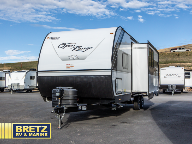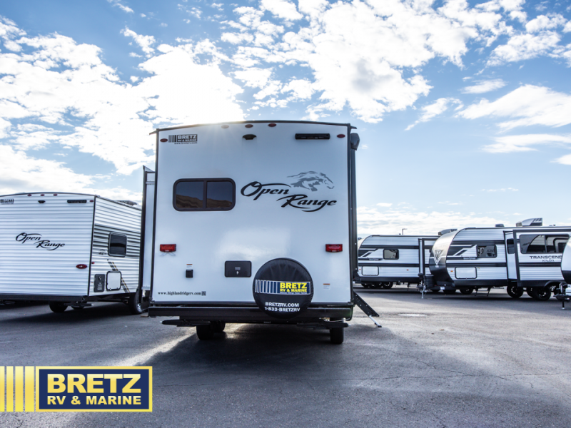 The affordable Open Range Conventional travel trailers by Highland Ridge are ready to meet your camping needs! You will appreciate the durable Magnum Roof system, plus each model is constructed with black front diamond plate protection, 5/8" main floor decking, and self-adjusting electric brakes with E-Z Lube axles for smooth towing. The 81" interior height means you won't feel cramped when relaxing with friends and family, and the residential vinyl flooring throughout is easy to clean, which will be perfect if you're camping with little ones or pets. These models also include a ceiling mount Bluetooth speaker, a digital TV antenna that will go perfectly with the optional Smart TV, plus a 13,500 BTU roof mounted A/C to keep you cool on those hot summer months.