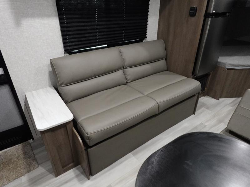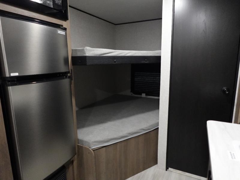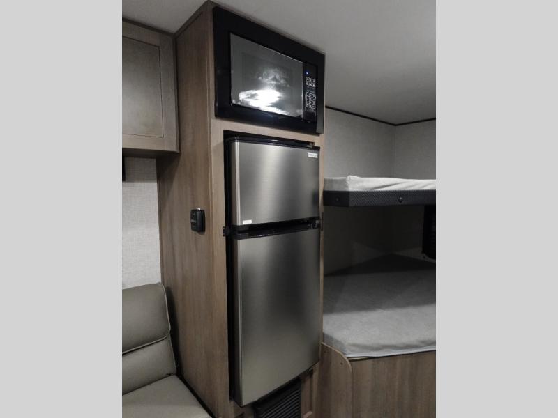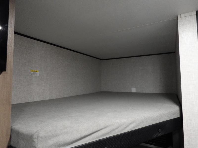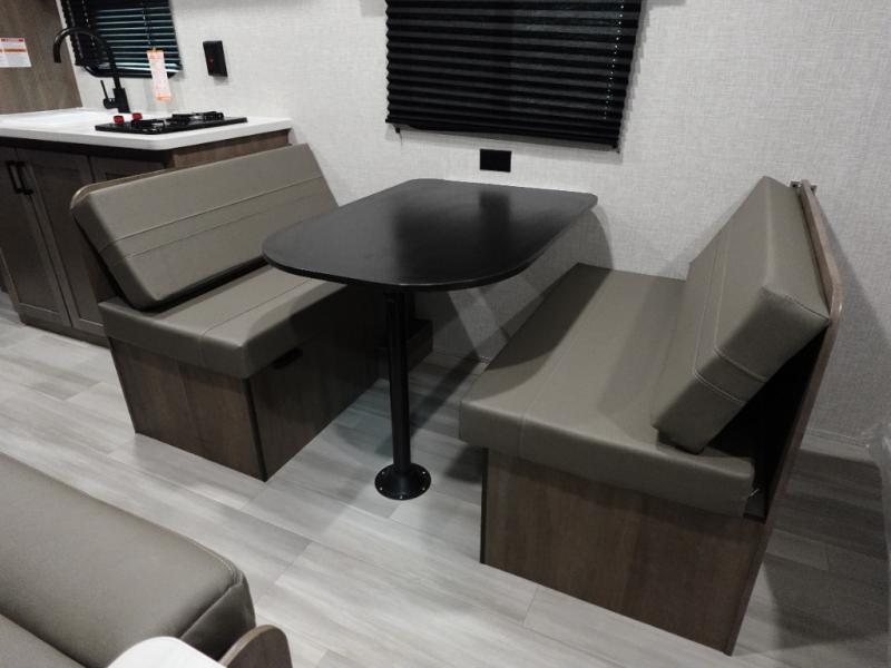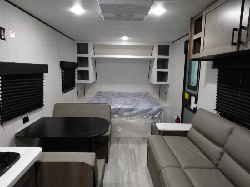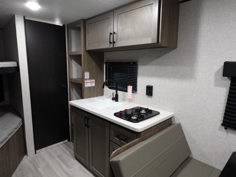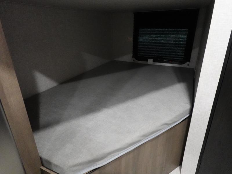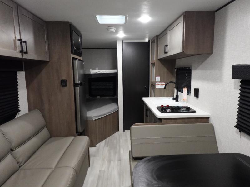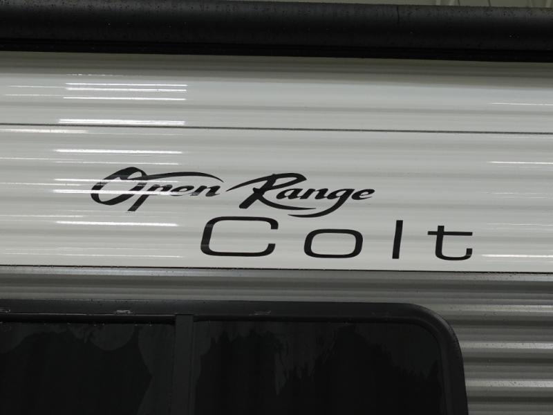 This Open Range Conventional COLT travel trailer is perfect for all your camping needs. The double-size bunk beds provide comfortable sleeping quarters for kids, while the tub/shower bathroom offers convenience and relaxation. A wardrobe provides ample storage for clothes and gear. Moving to the kitchen area, the two-burner stove top and microwave make meal prep an easy task, and overhead cabinets offer additional storage. Also, the booth dinette is perfect for family meals and games. Moreover, the jackknife sofa provides a comfortable spot for relaxation. The front bedroom features a spacious sleeping area with wardrobes on each side of the bed, offering plenty of storage for your belongings, and the 10' power awning provides shade and protection, creating a comfortable outdoor living space.