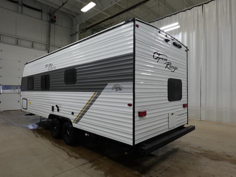 The affordable Open Range Conventional travel trailers by Highland Ridge are ready to meet your camping needs! You will appreciate the durable Magnum Roof system, plus each model is constructed with black front diamond plate protection, 5/8" main floor decking, and self-adjusting electric brakes with E-Z Lube axles for smooth towing. The 81" interior height means you won't feel cramped when relaxing with friends and family, and the residential vinyl flooring throughout is easy to clean, which will be perfect if you're camping with little ones or pets. These models also include a ceiling mount Bluetooth speaker plus a 13,500 BTU roof mounted A/C to keep you cool on those hot summer months.