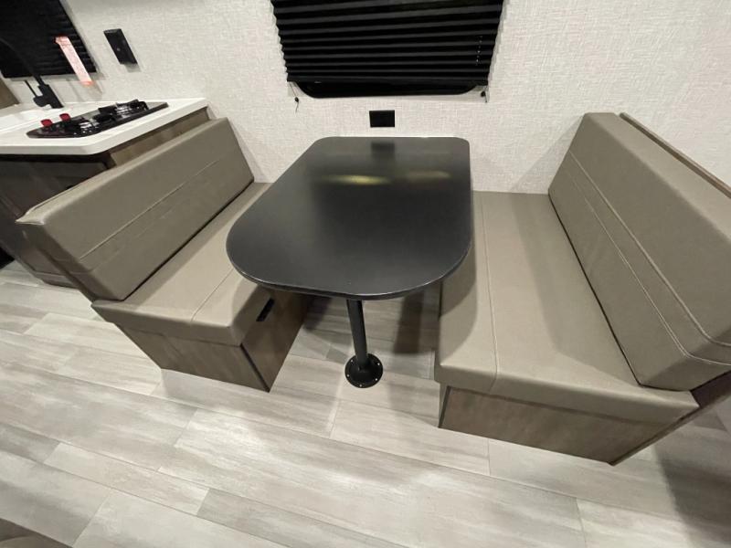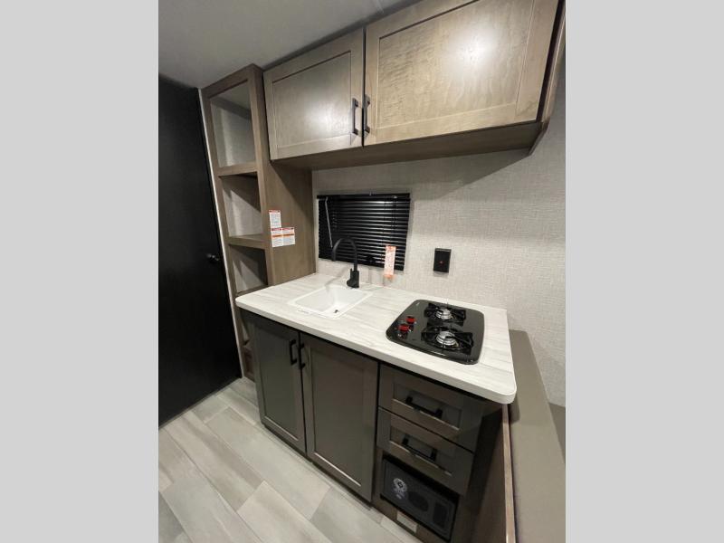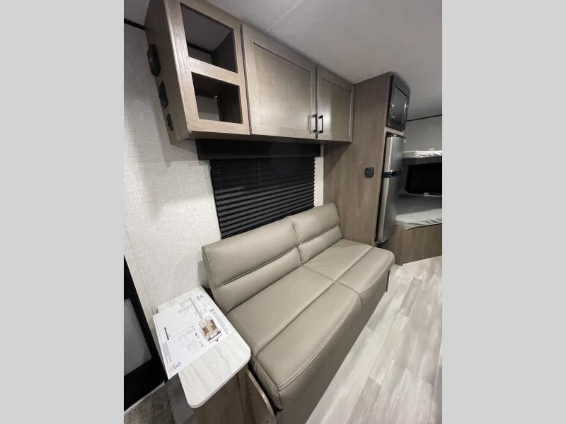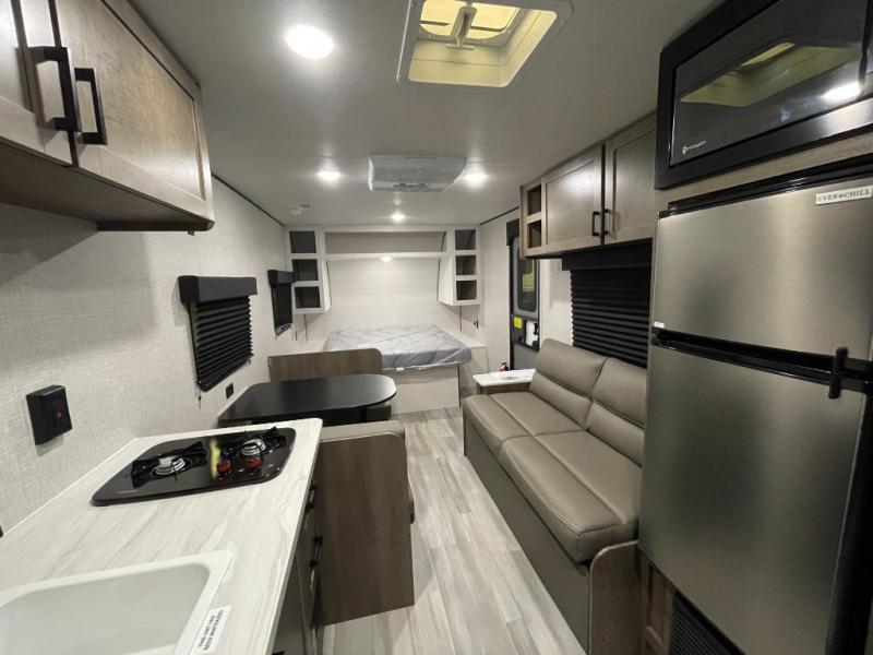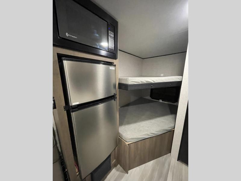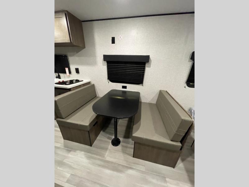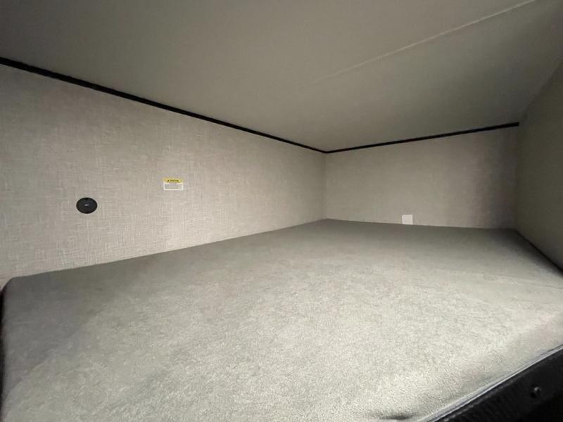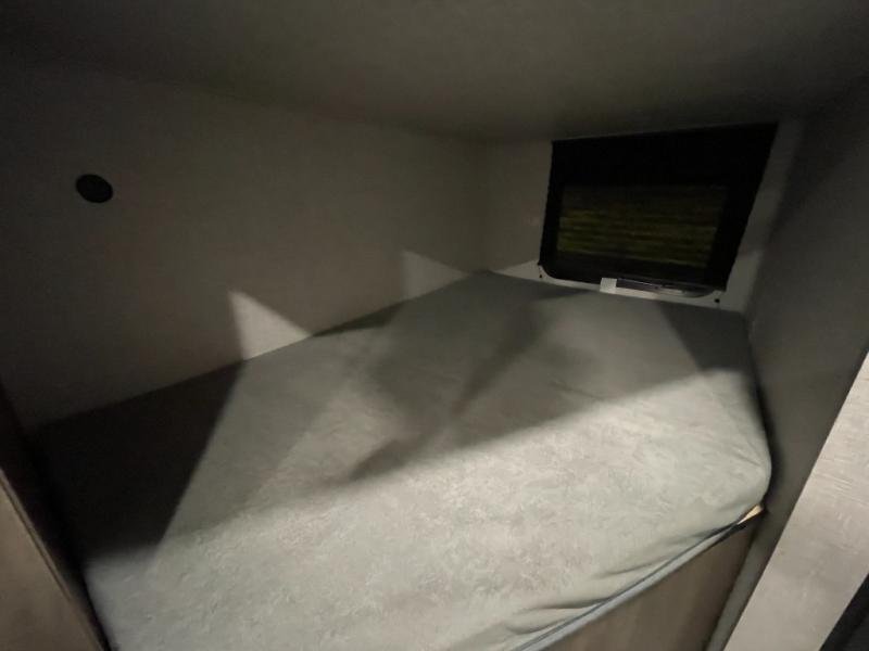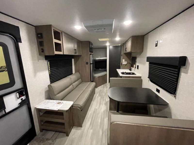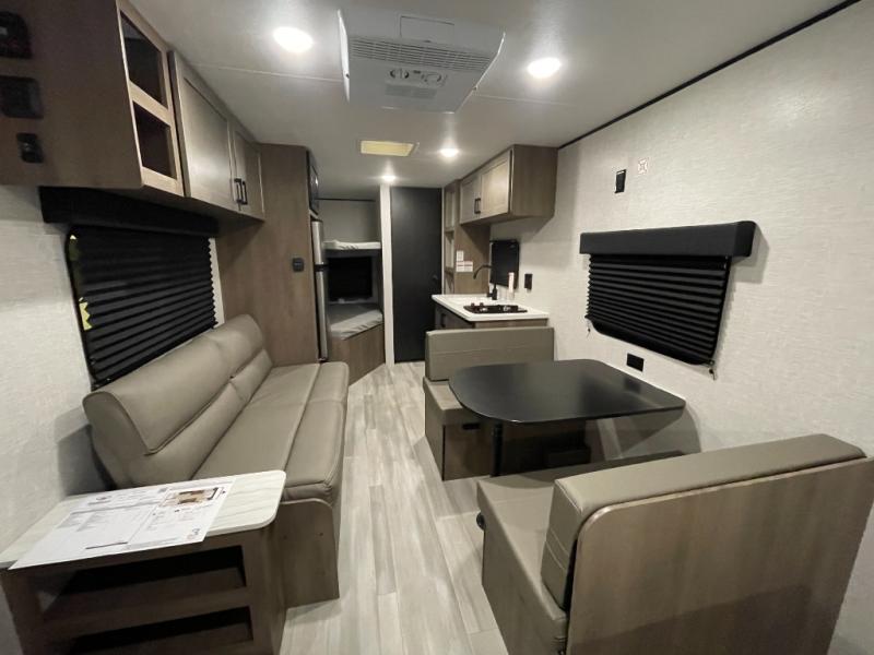This Open Range Conventional COLT travel trailer is perfect for all your camping needs. The double-size bunk beds provide comfortable sleeping quarters for kids, while the tub/shower bathroom offers convenience and relaxation. A wardrobe provides ample storage for clothes and gear. Moving to the kitchen area, the two-burner stove top and microwave make meal prep an easy task, and overhead cabinets offer additional storage. Also, the booth dinette is perfect for family meals and games. Moreover, the jackknife sofa provides a comfortable spot for relaxation. The front bedroom features a spacious sleeping area with wardrobes on each side of the bed, offering plenty of storage for your belongings, and the 10' power awning provides shade and protection, creating a comfortable outdoor living space.