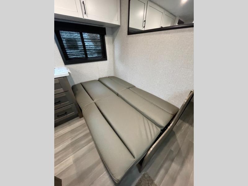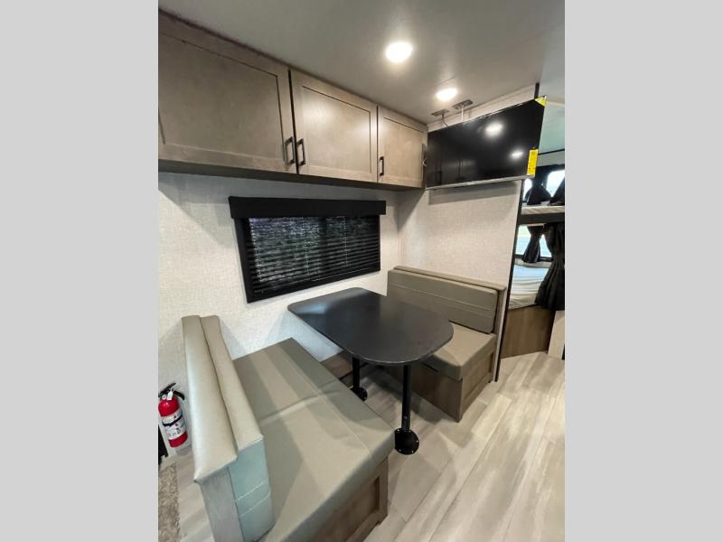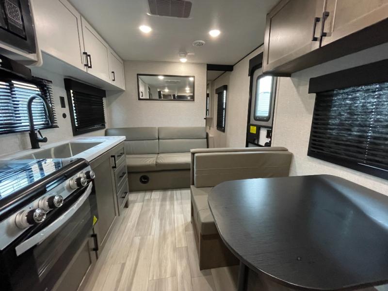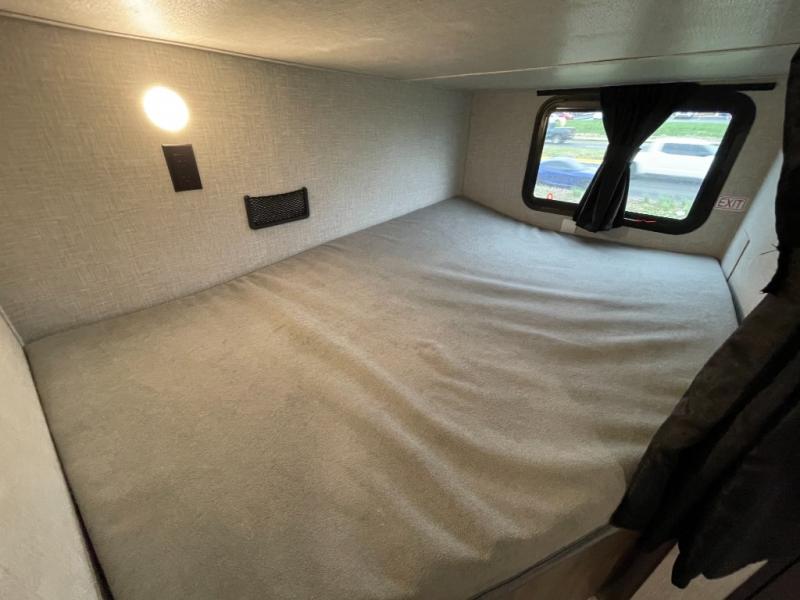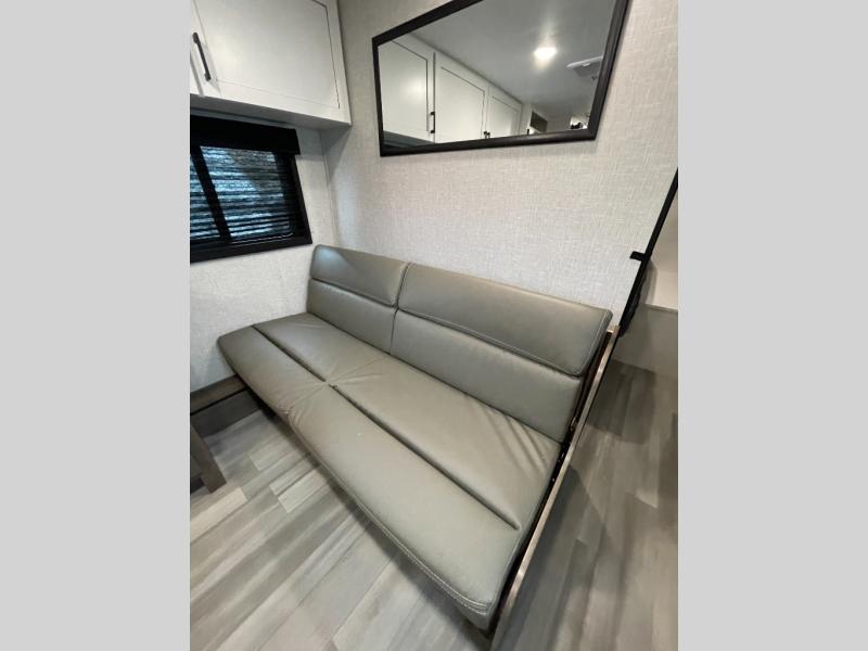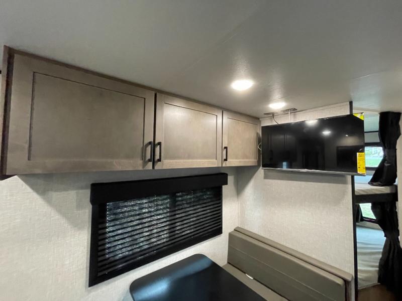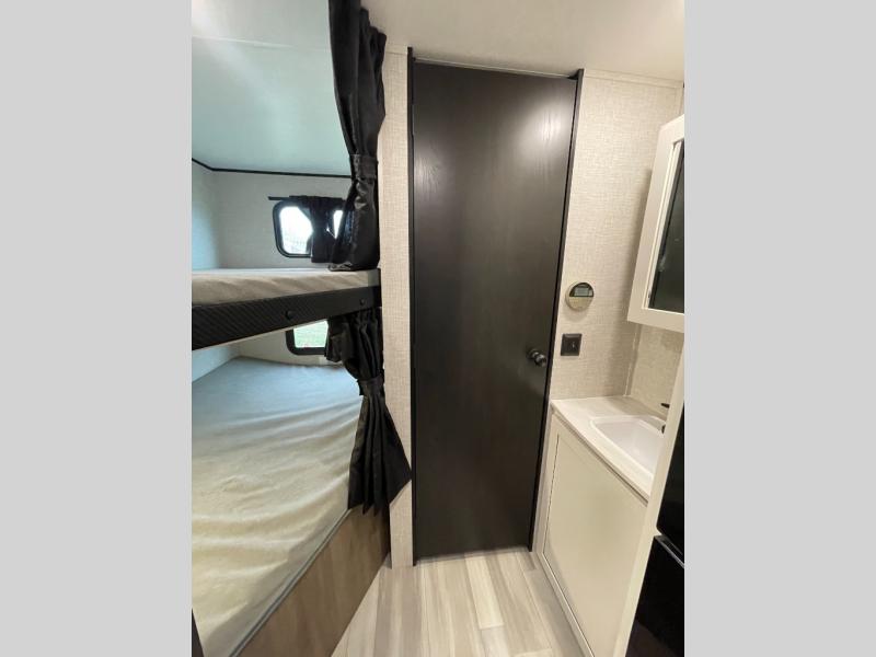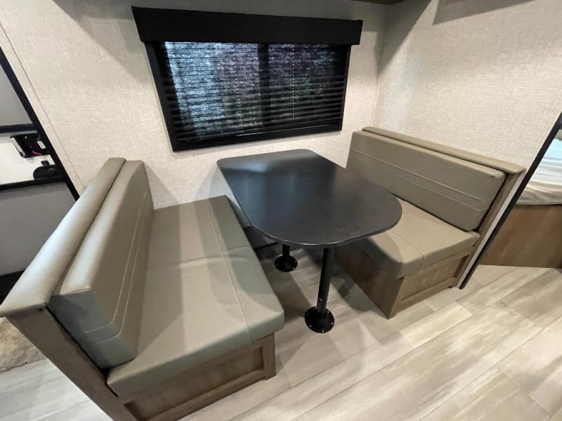 This dual-axle travel trailer can sleep eight people each night, so invite your family or friends along. You will enjoy the private bedroom up front with dual wardrobes to keep your clothes tidy. While the chef of your group is preparing lunch on the three burner cooktop, everyone else can visit on the jack-knife sofa or play a game at the booth dinette. You will also find a large 18' power awning with LED lights outdoors which is where you may usually find everyone. The private bath is right next to the double-size bunks for convenience, and the sink is just outside of this room so two people can freshen up at once.