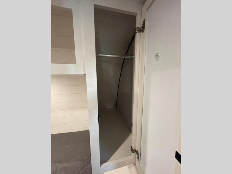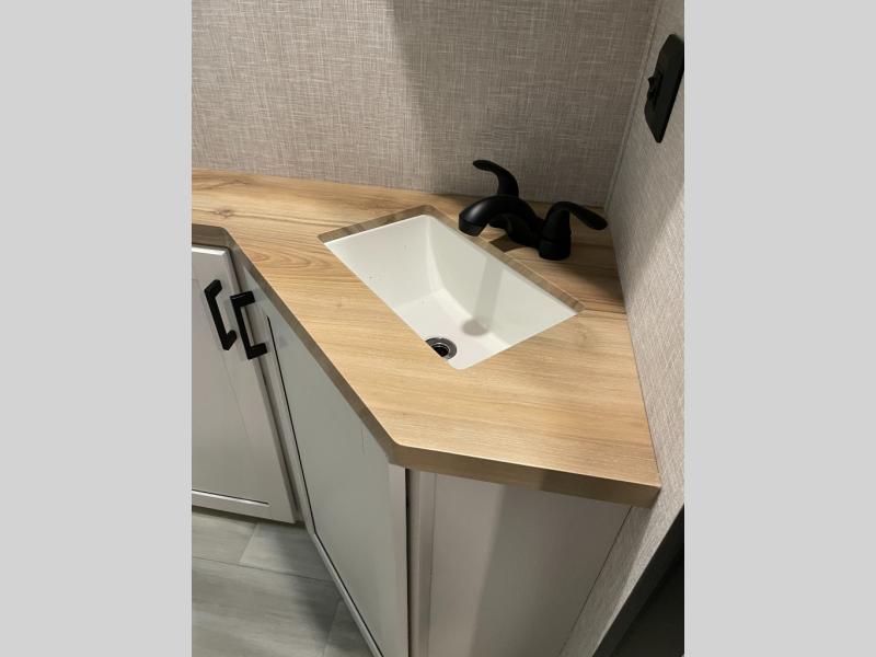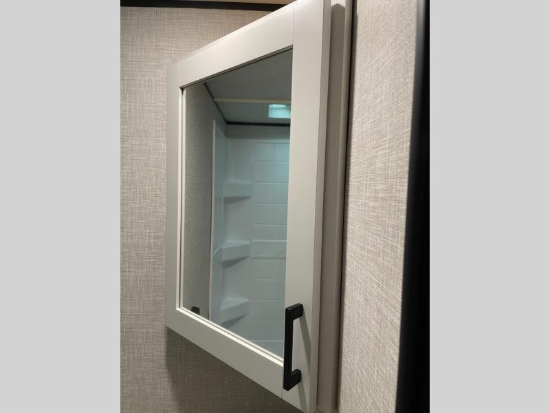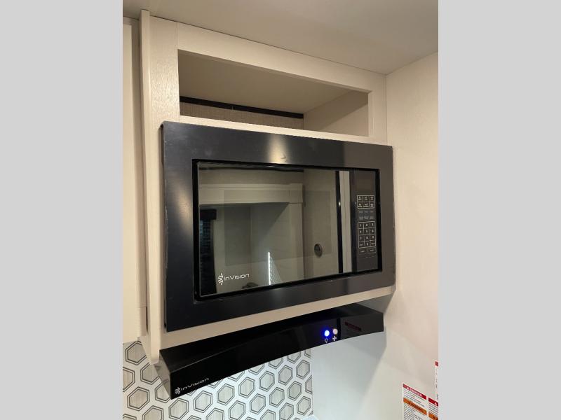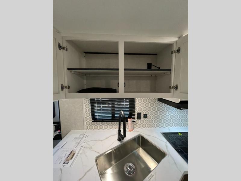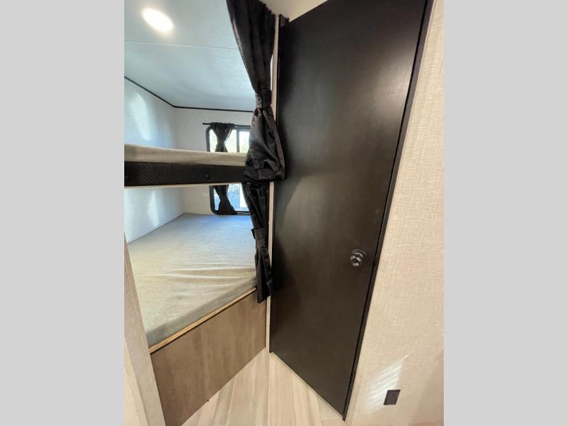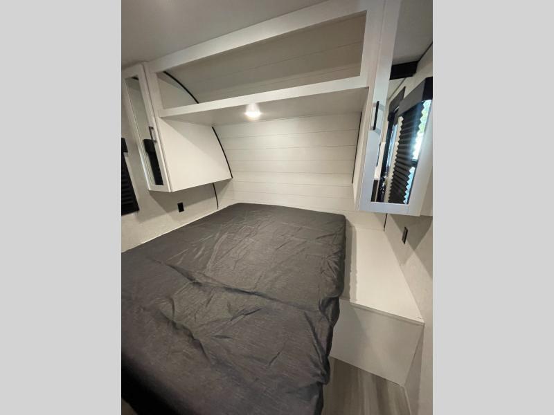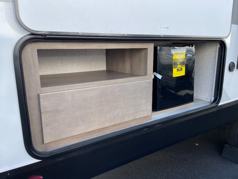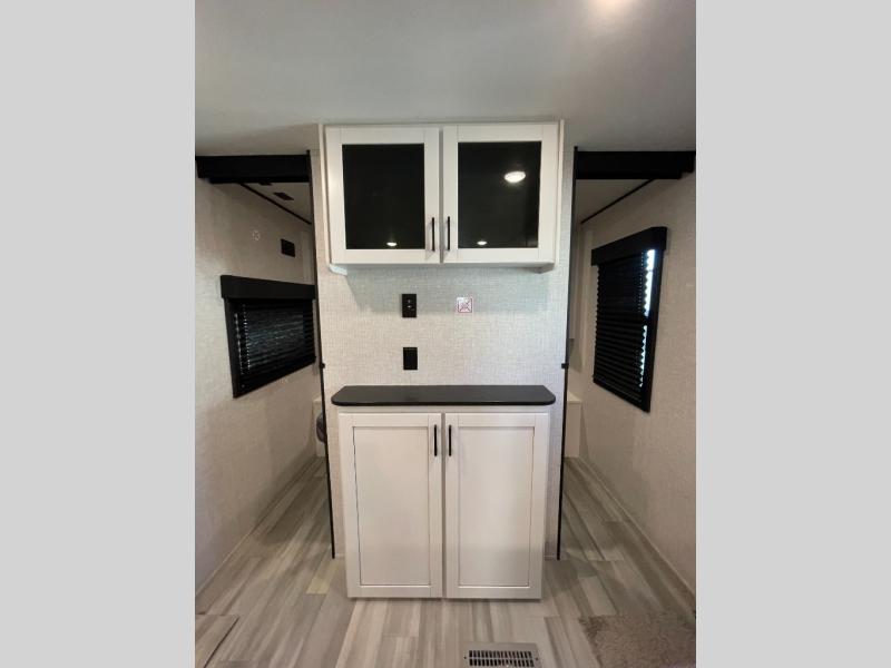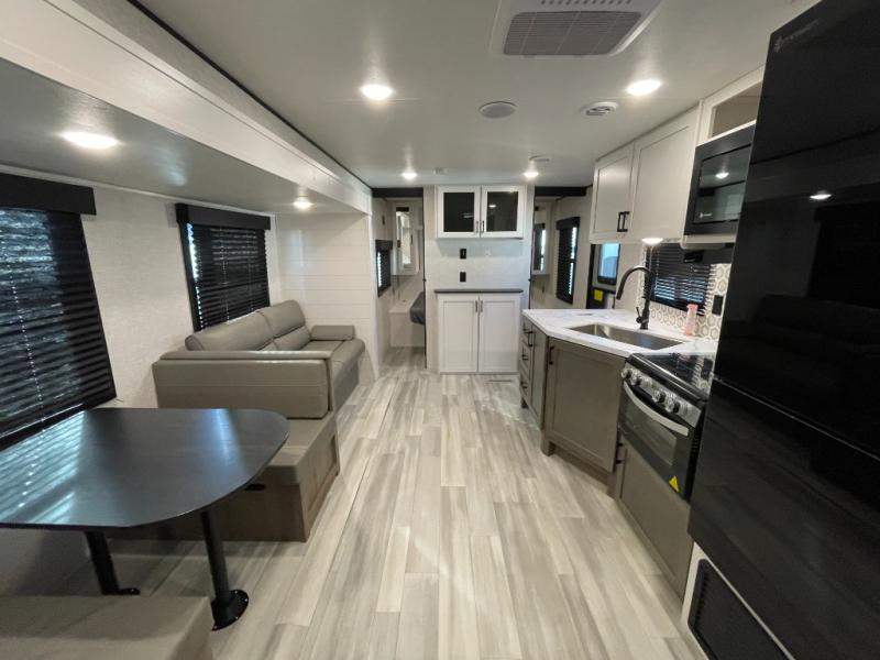 You're going to love every minute spent in this spacious travel trailer. The booth dinette and jack-knife sofa within the large slide out will be perfect for meal times, relaxing, and additional sleeping space. Add the optional Smart TV to the entertainment center and you're set up for movie night! This model includes an outside kitchen with a griddle and a refrigerator for cold drinks, plus indoor appliances if the rain has ruined your plans for the day. You will enjoy your own bedroom up front with space-saving sliding doors and two wardrobes for your clothes.