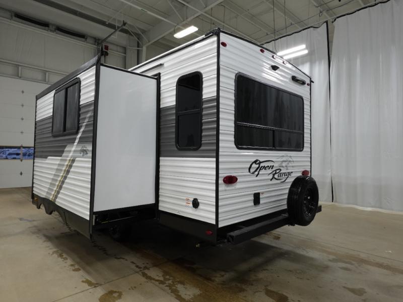 The affordable Open Range Conventional travel trailers by Highland Ridge are ready to meet your camping needs! You will appreciate the durable Magnum Roof system, plus each model is constructed with black front diamond plate protection, 5/8" main floor decking, and self-adjusting electric brakes with E-Z Lube axles for smooth towing. The 81" interior height means you won't feel cramped when relaxing with friends and family, and the residential vinyl flooring throughout is easy to clean, which will be perfect if you're camping with little ones or pets. These models also include a ceiling mount Bluetooth speaker, a digital TV antenna, plus a 13,500 BTU roof mounted A/C to keep you cool on those hot summer months.