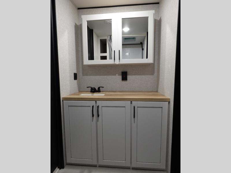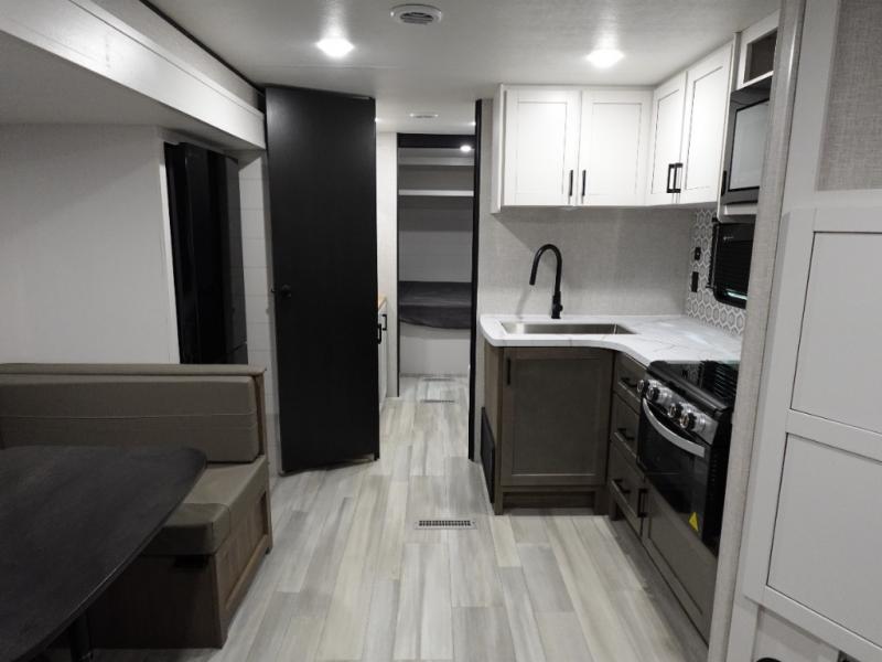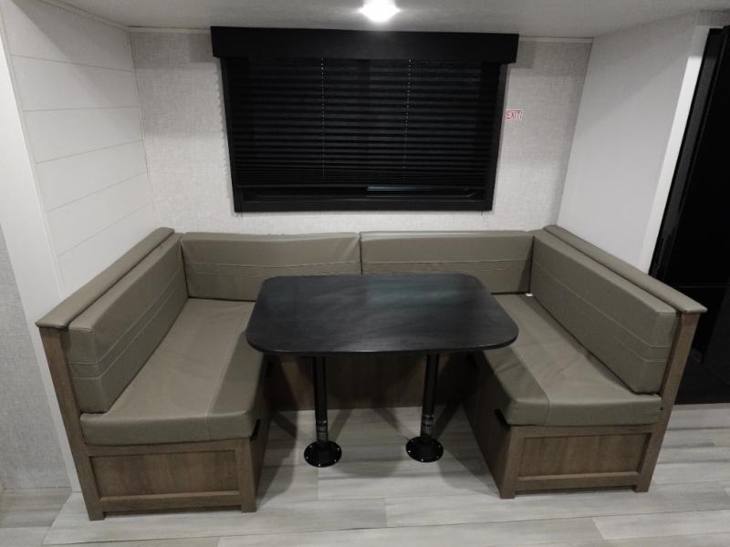 Eat, sleep, play, and relax in this travel trailer perfect for six! You will love to visit with friends on the tri-fold sofa and U-shaped dinette in the rear living area, and there is an entertainment center here. Freshen up in the spacious walk-through bath that includes a large shower and tons of counter space, and the front master bedroom will feel just like home. Here, you'll find a walk-around bed, dual wardrobes, and your own exterior entry door!
