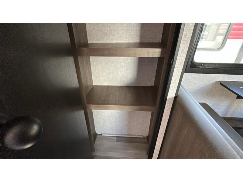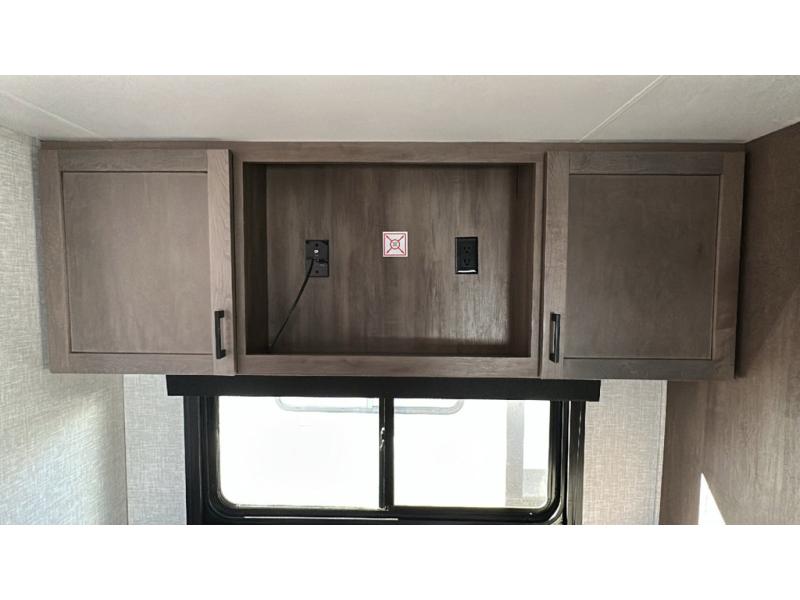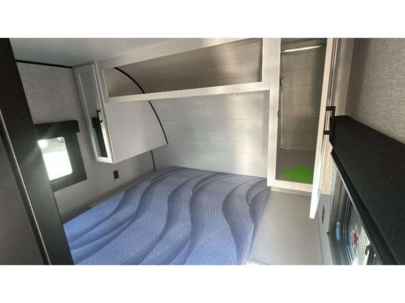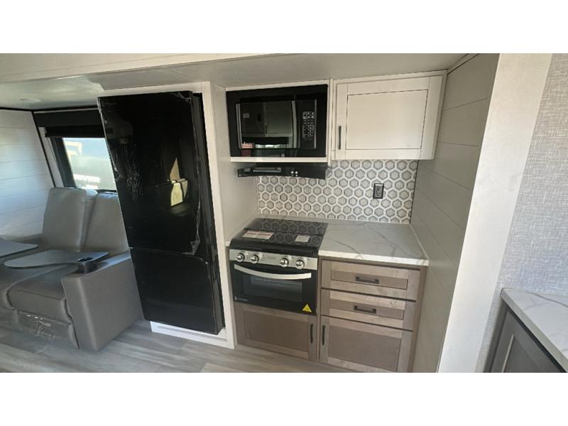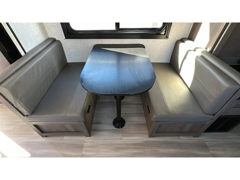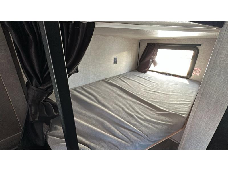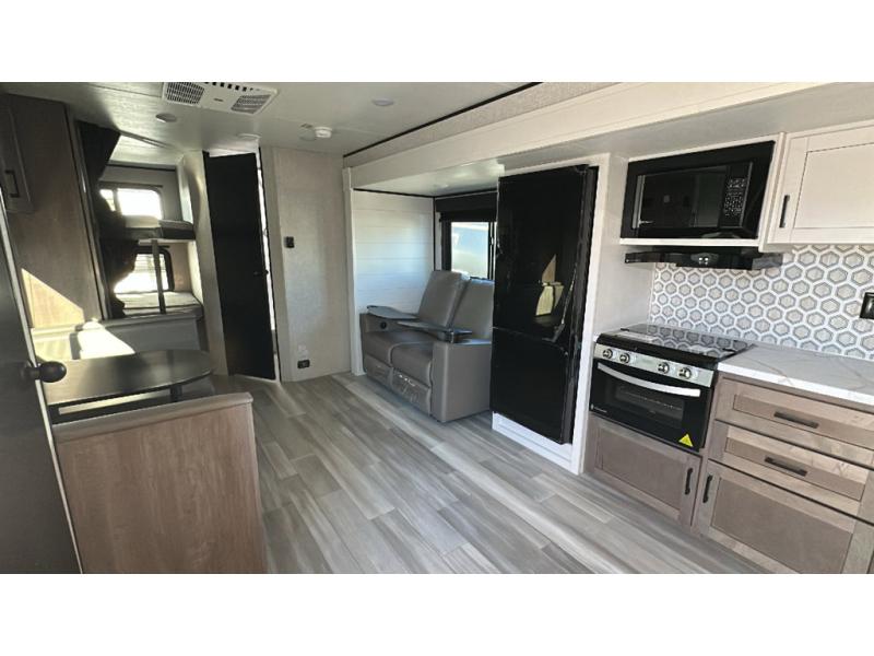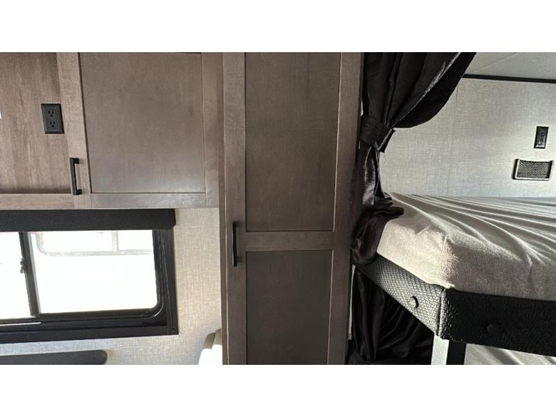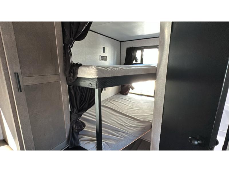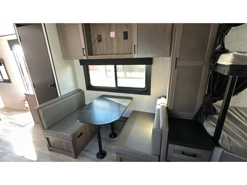 This dual-axle travel trailer can sleep eight people each night, so invite your family or friends along. You will enjoy the private bedroom up front with dual wardrobes to keep your clothes tidy. While the chef of your group is preparing lunch on the three burner cooktop, everyone else can visit on the jack-knife sofa or play a game at the booth dinette. You will also find an 18' power awning with LED lights outdoors which is where you may usually find everyone. The walk-in pantry and additional storage beside the pantry will let you keep snacks, paper goods, and more fully stocked. And the private bathroom is right next to the double-size bunks for added convenience.