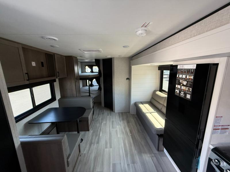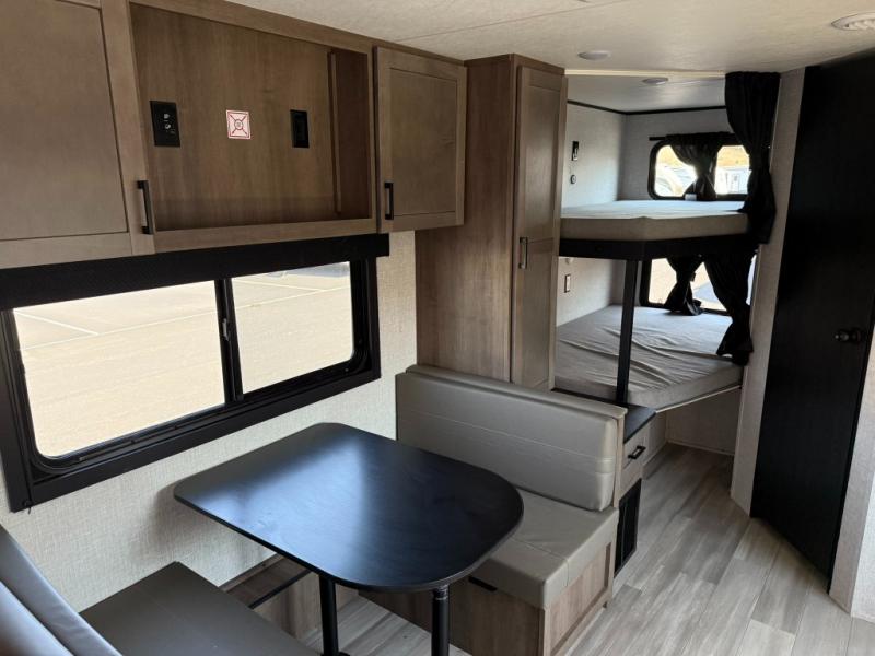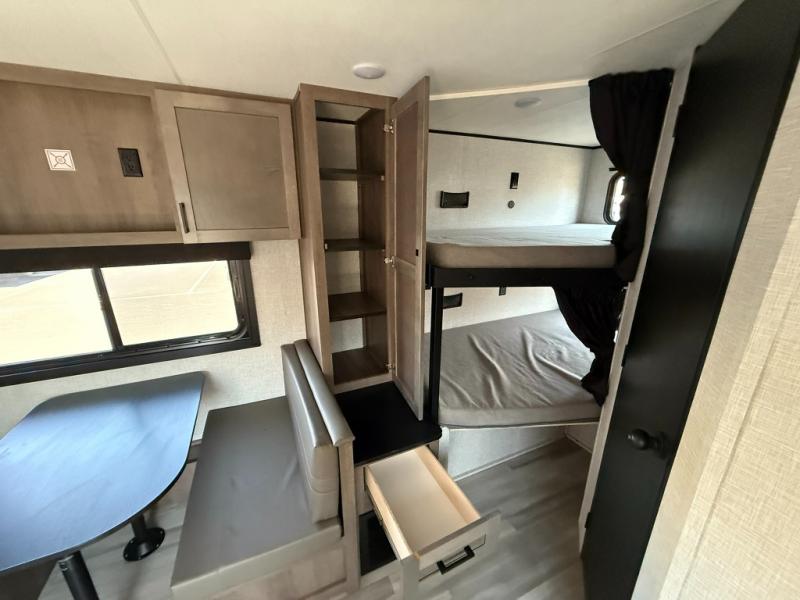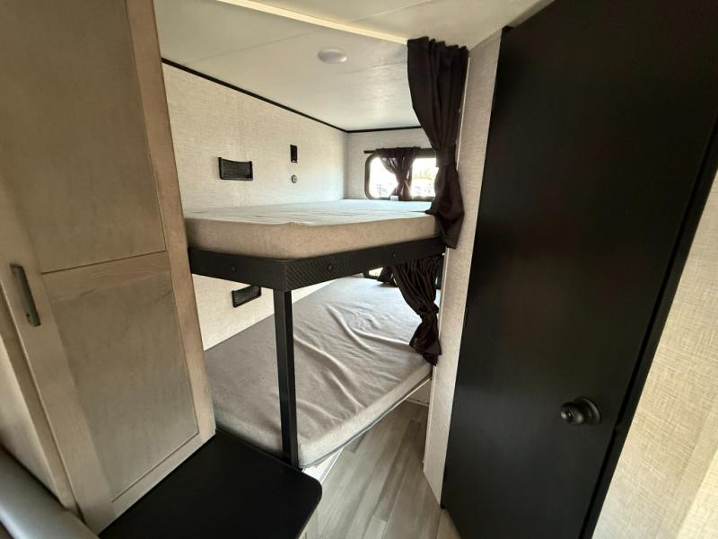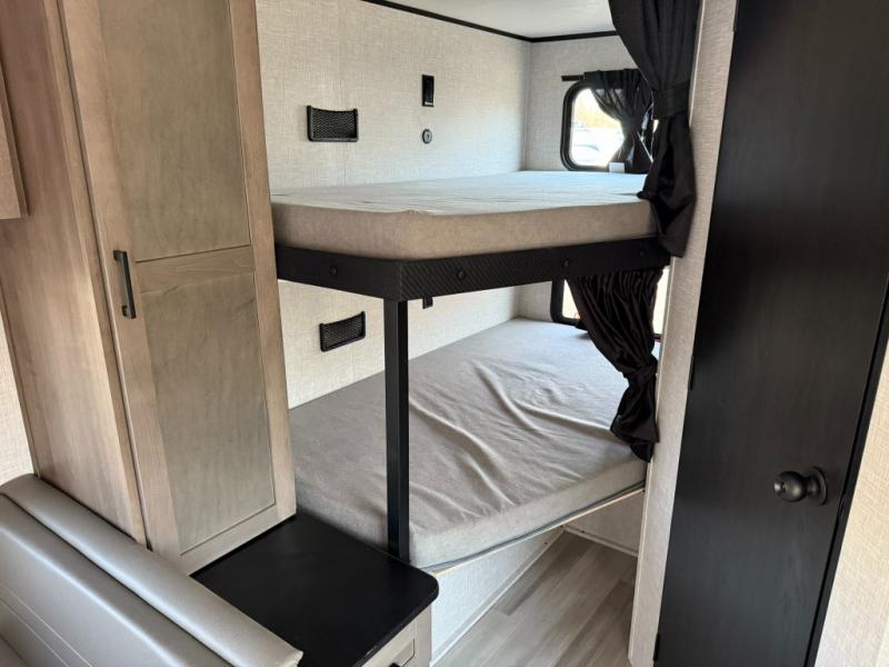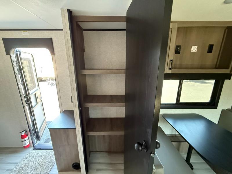 This dual-axle travel trailer can sleep eight people each night, so invite your family or friends along. You will enjoy the private bedroom up front with dual wardrobes to keep your clothes tidy. While the chef of your group is preparing lunch on the three burner cooktop, everyone else can visit on the jack-knife sofa or play a game at the booth dinette. You will also find an 18' power awning with LED lights outdoors which is where you may usually find everyone. The walk-in pantry and additional storage beside the pantry will let you keep snacks, paper goods, and more fully stocked. And the private bathroom is right next to the double-size bunks for added convenience.