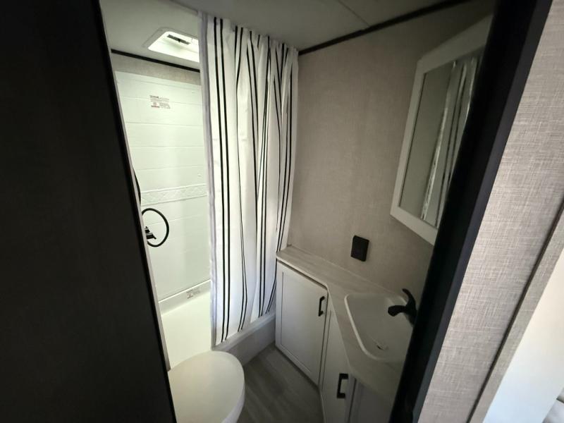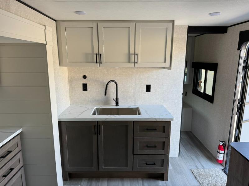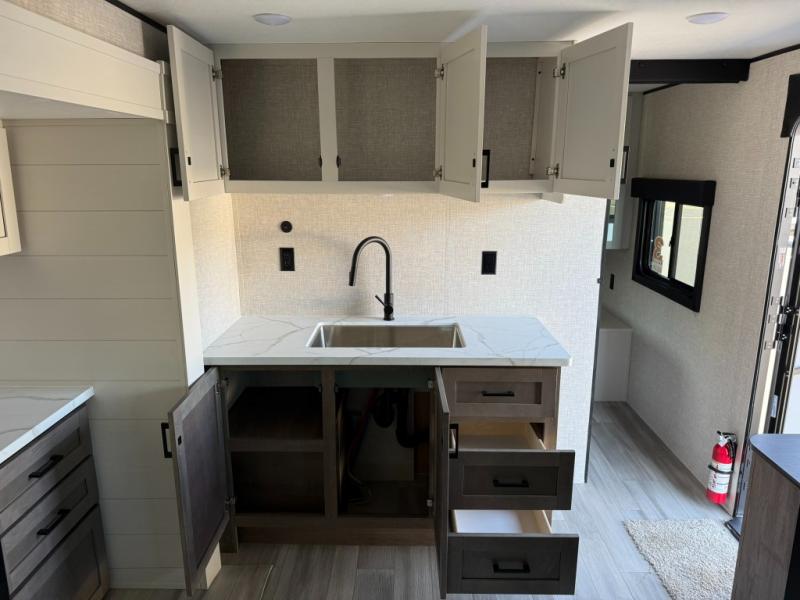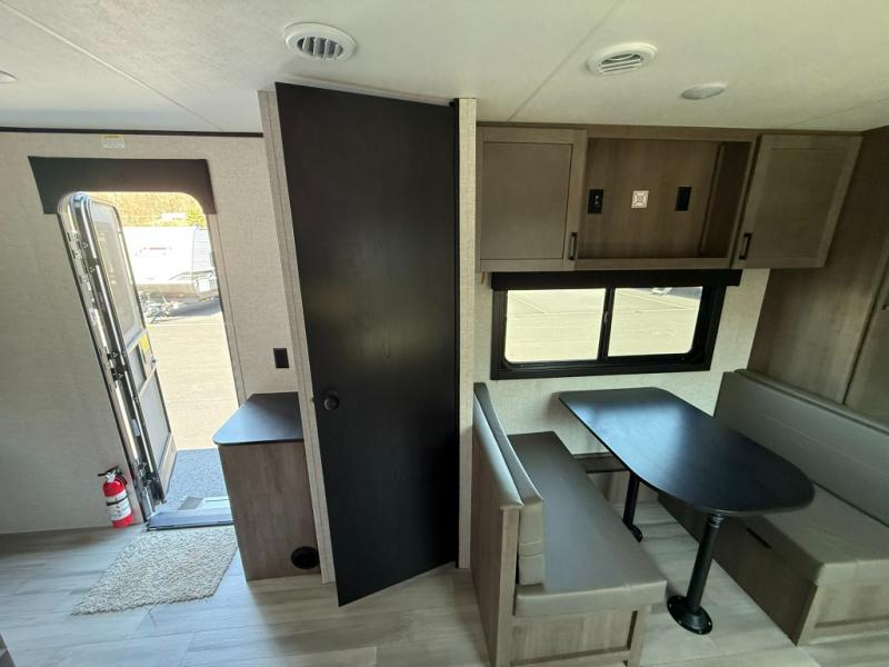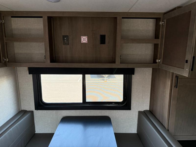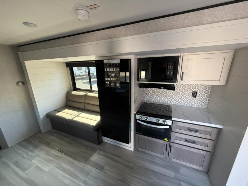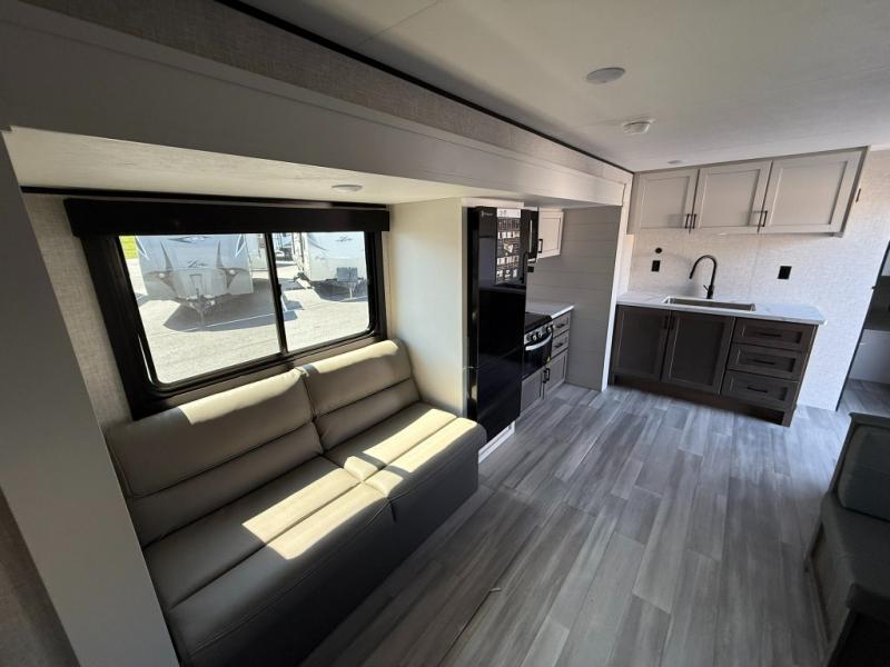 This dual-axle travel trailer can sleep eight people each night, so invite your family or friends along. You will enjoy the private bedroom up front with dual wardrobes to keep your clothes tidy. While the chef of your group is preparing lunch on the three burner cooktop, everyone else can visit on the jack-knife sofa or play a game at the booth dinette. You will also find an 18' power awning with LED lights outdoors which is where you may usually find everyone. The walk-in pantry and additional storage beside the pantry will let you keep snacks, paper goods, and more fully stocked. And the private bathroom is right next to the double-size bunks for added convenience.