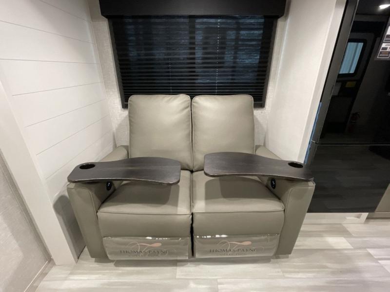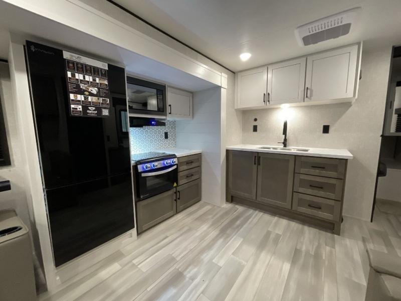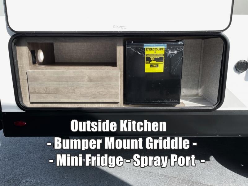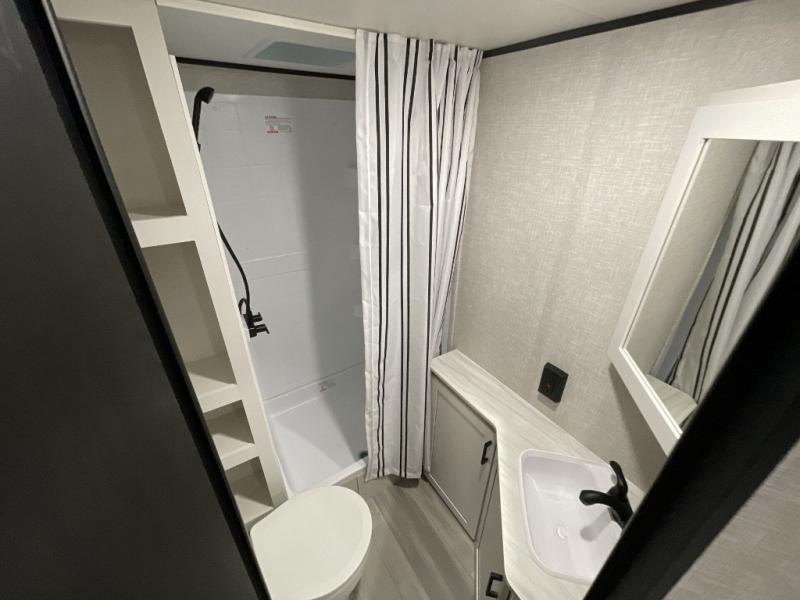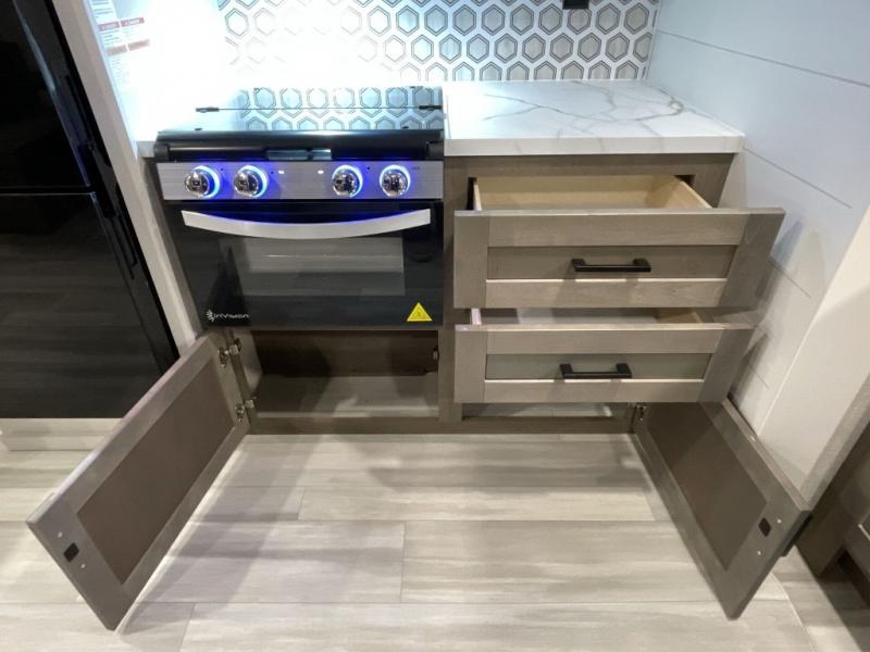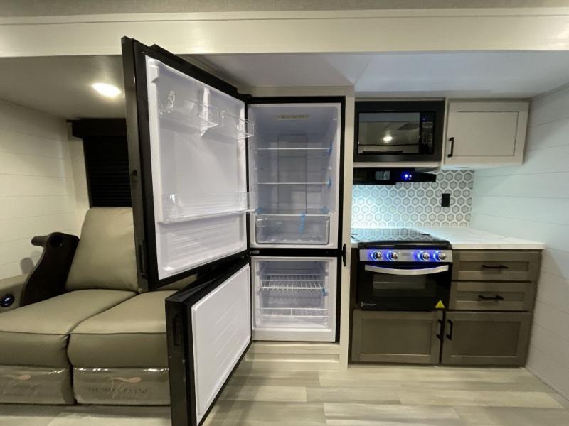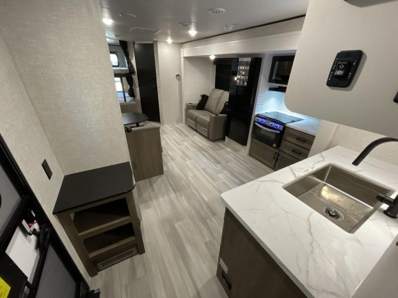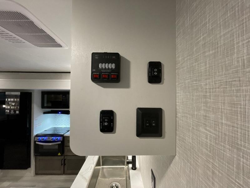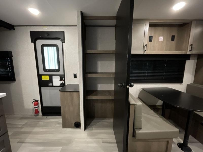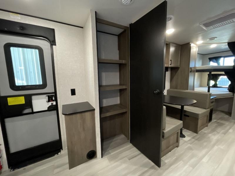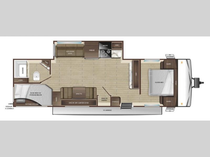 This dual-axle travel trailer can sleep eight people each night, so invite your family or friends along. You will enjoy the private bedroom up front with dual wardrobes to keep your clothes tidy. While the chef of your group is preparing lunch on the three burner cooktop, everyone else can visit on the jack-knife sofa or play a game at the booth dinette. You will also find an 18' power awning with LED lights outdoors which is where you may usually find everyone. The walk-in pantry and additional storage beside the pantry will let you keep snacks, paper goods, and more fully stocked. And the private bathroom is right next to the double-size bunks for added convenience.
