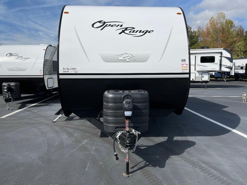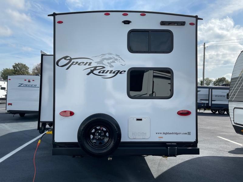 The affordable Open Range Conventional travel trailers by Highland Ridge are ready to meet your camping needs! You will appreciate the durable Magnum Roof system, plus each model is constructed with black front diamond plate protection, 5/8" main floor decking, and self-adjusting electric brakes with E-Z Lube axles for smooth towing. The 81" interior height means you won't feel cramped when relaxing with friends and family, and the residential vinyl flooring throughout is easy to clean, which will be perfect if you're camping with little ones or pets. These models also include ceiling mount Bluetooth speaker, a digital TV antenna that will go perfectly with the optional Smart TV, plus a 13,500 BTU roof mounted A/C to keep you cool on those hot summer months.