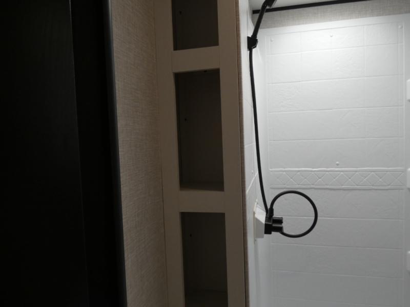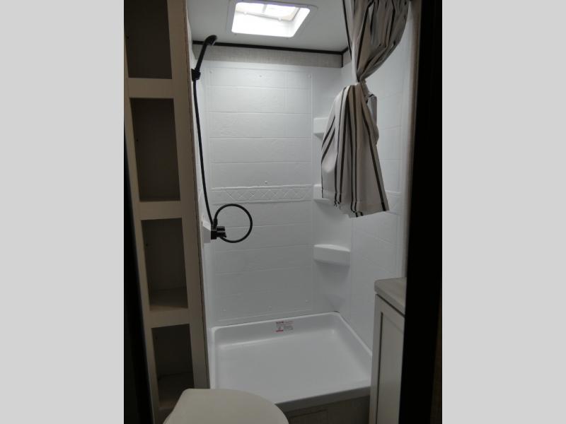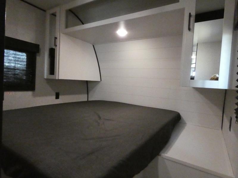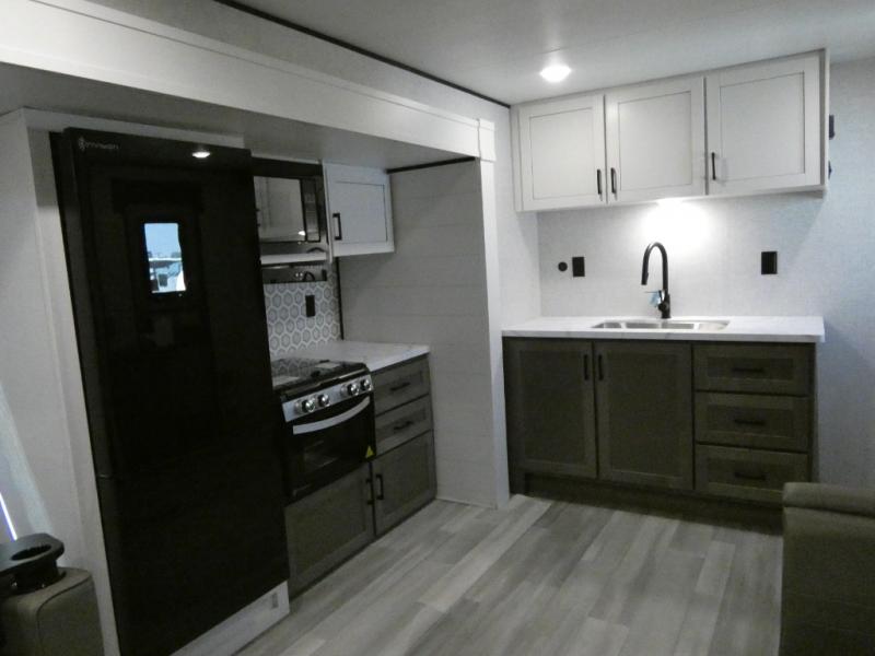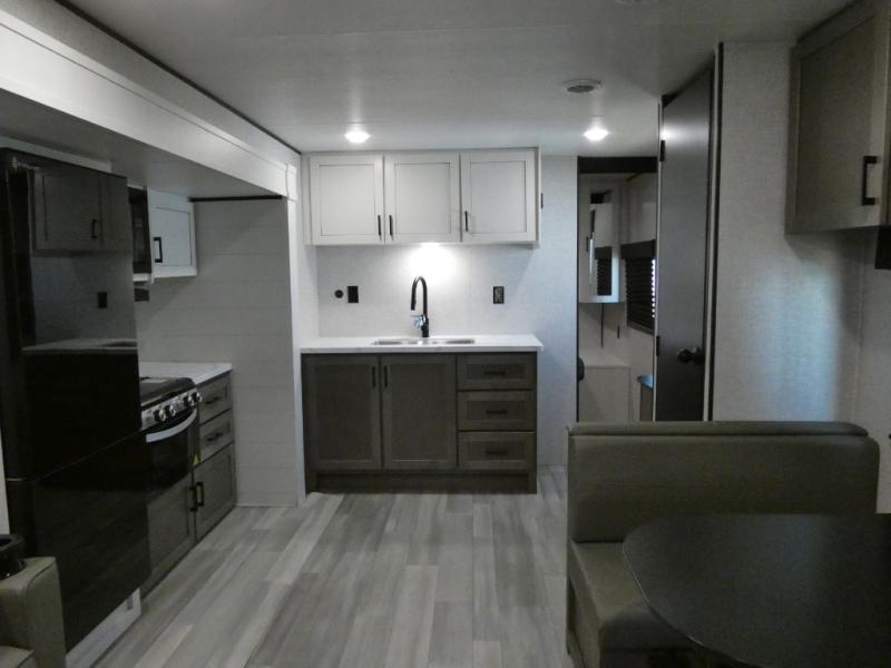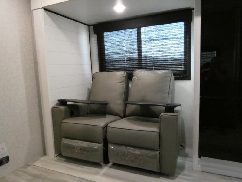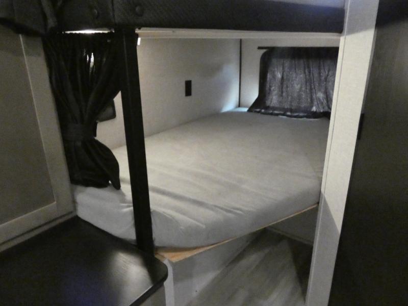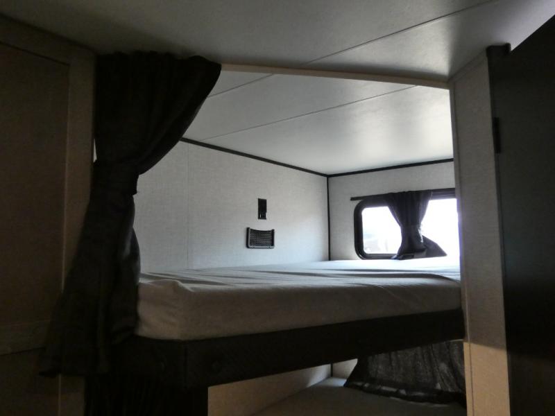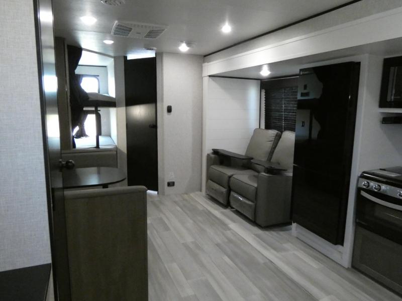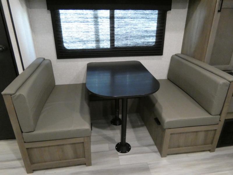 This dual-axle travel trailer can sleep eight people each night, so invite your family or friends along. You will enjoy the private bedroom up front with dual wardrobes to keep your clothes tidy. While the chef of your group is preparing lunch on the three burner cooktop, everyone else can visit on the theater seats or play a game at the booth dinette. You will also find an 18' power awning with LED lights outdoors which is where you may usually find everyone. The walk-in pantry and additional storage beside the pantry will let you keep snacks, paper goods, and more fully stocked. And the private bathroom is right next to the double-size bunks for added convenience.
